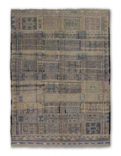 A beautiful vintage kilim is handwoven by Master Artisans using handspun goat hair in Turkey. Kilims are flat woven rugs in a technique that comes from Anatolia, parts of Iran, the Caucasus, and Turkestan. This Mazandaran style minimalist kilim offers simple designs in natural colors.