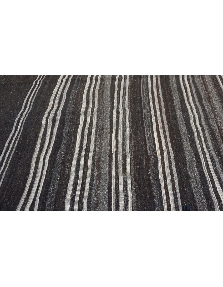A beautiful vintage kilim is handwoven by Master Artisans using handspun goat hair in Turkey. Kilims are flat woven rugs in a technique that comes from Anatolia, parts of Iran, the Caucasus, and Turkestan. This Mazandaran style minimalist kilim offers simple designs in natural colors.