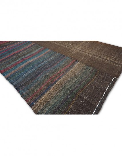 A beautiful vintage kilim is handwoven by Master Artisans using handspun goat hair in Turkey. Kilims are flat woven rugs in a technique that comes from Anatolia, parts of Iran, the Caucasus, and Turkestan. This Mazandaran style minimalist kilim offers simple designs in natural colors.