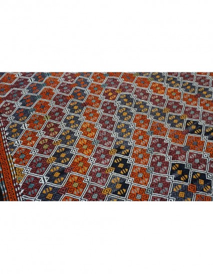 A beautiful vintage kilim is handwoven by Master Artisans using handspun wool in Turkey. Kilims are flat woven rugs in a technique that comes from Anatolia, parts of Iran, the Caucasus, and Turkestan. This Mazandaran style minimalist kilim offers simple designs in natural colors.