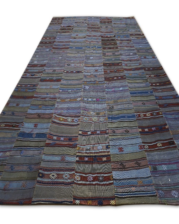 A beautiful vintage kilim is handwoven by Master Artisans using handspun Wool in Turkey. Kilims are flat woven rugs in a technique that comes from Anatolia, parts of Iran, the Caucasus, and Turkestan. This Mazandaran style minimalist kilim offers simple designs in natural colors.