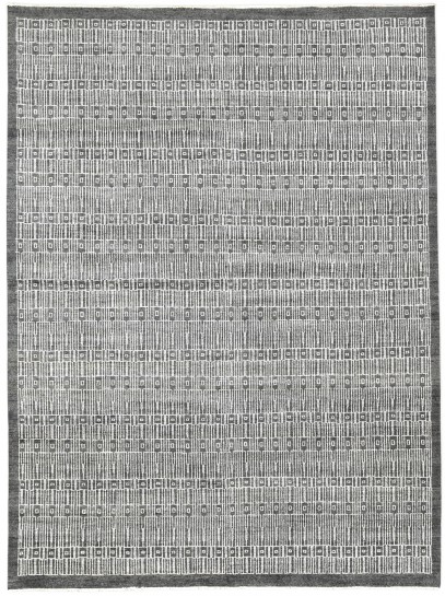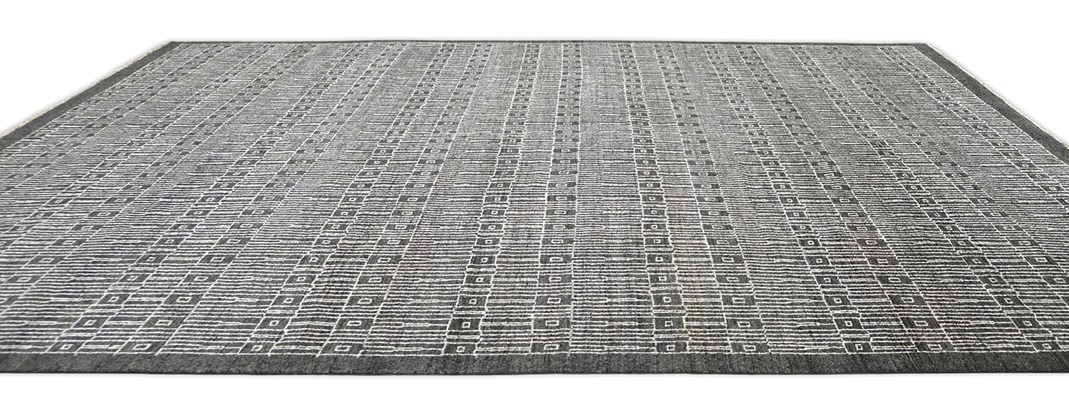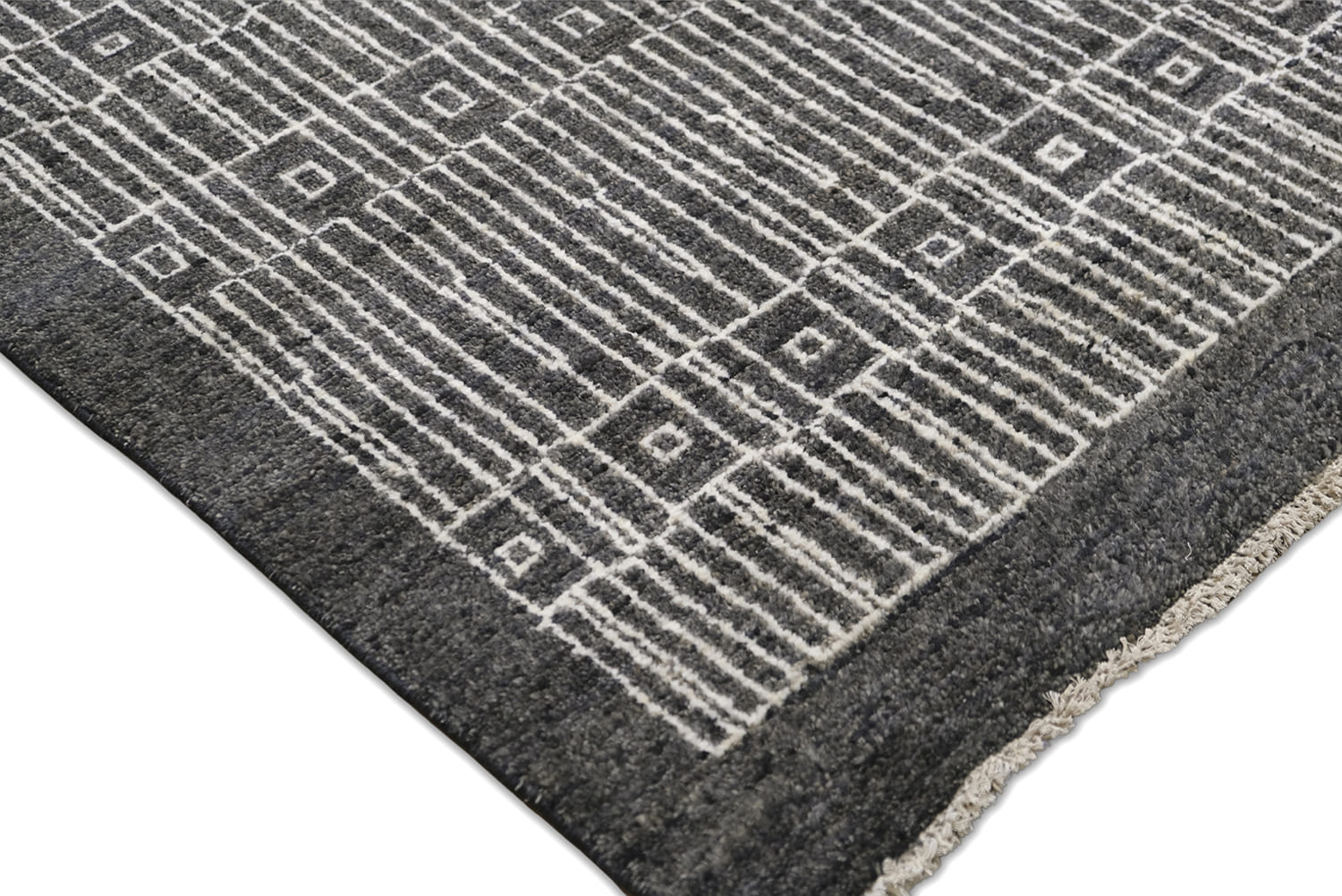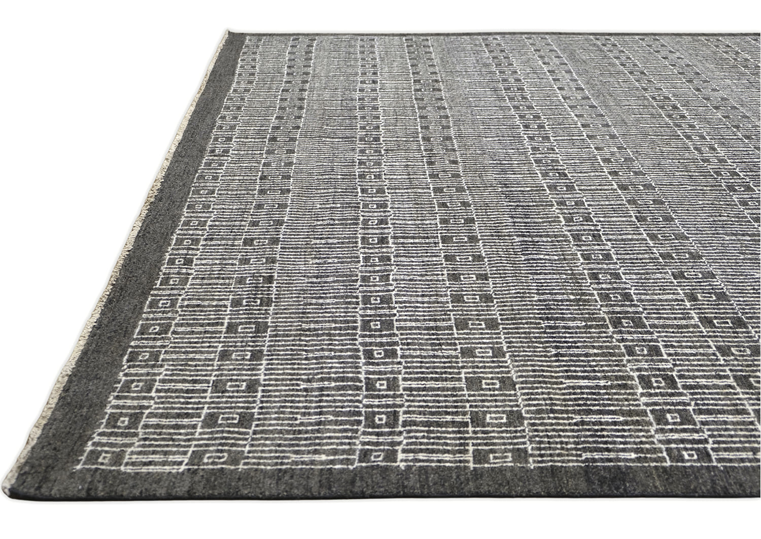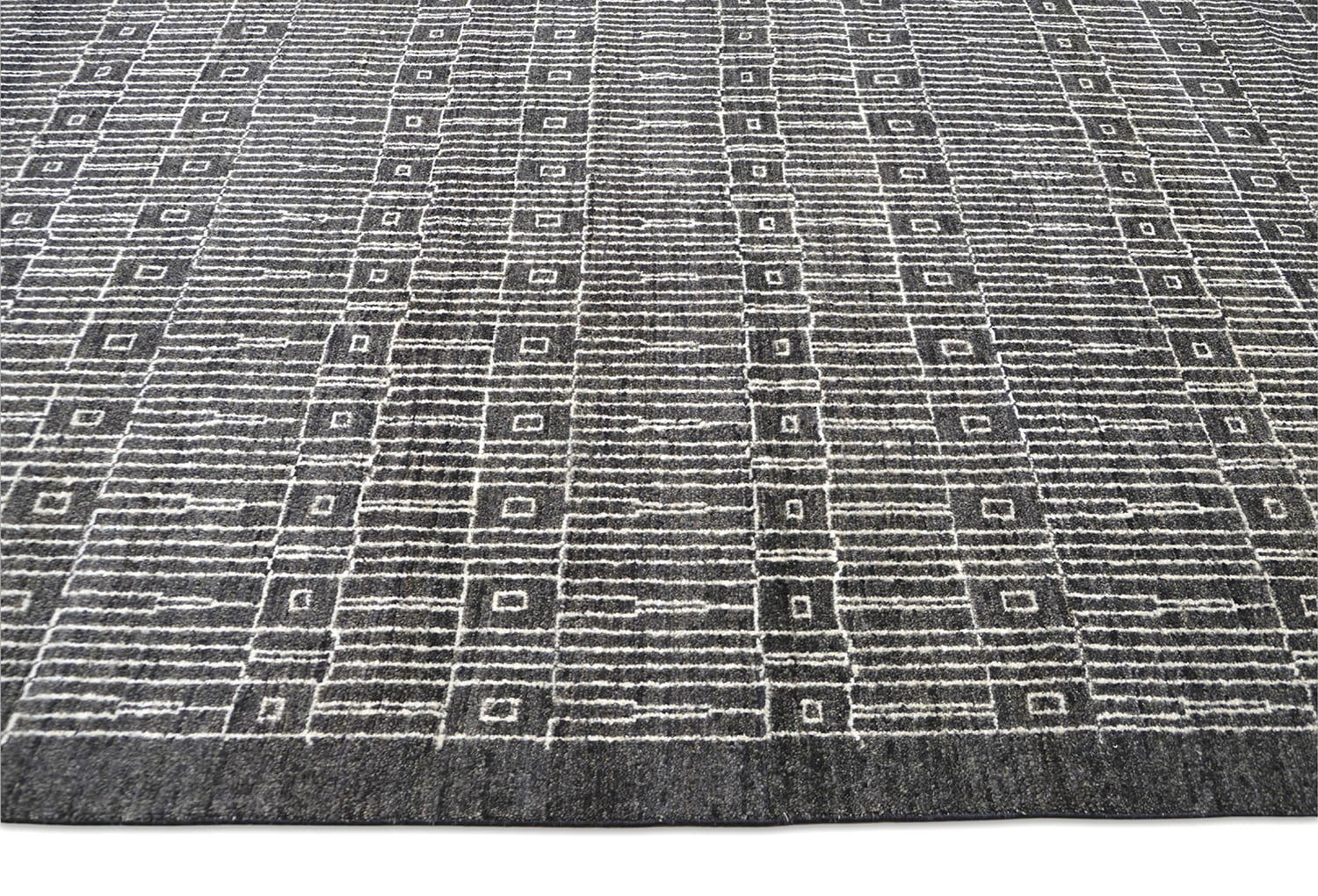 Hand-knotted rug crafted with hand-spun lanolin-rich wool pile, featuring a modern design in varying shades of charcoal accented with ivory. Luxuriously soft underfoot.