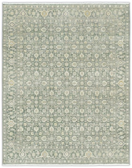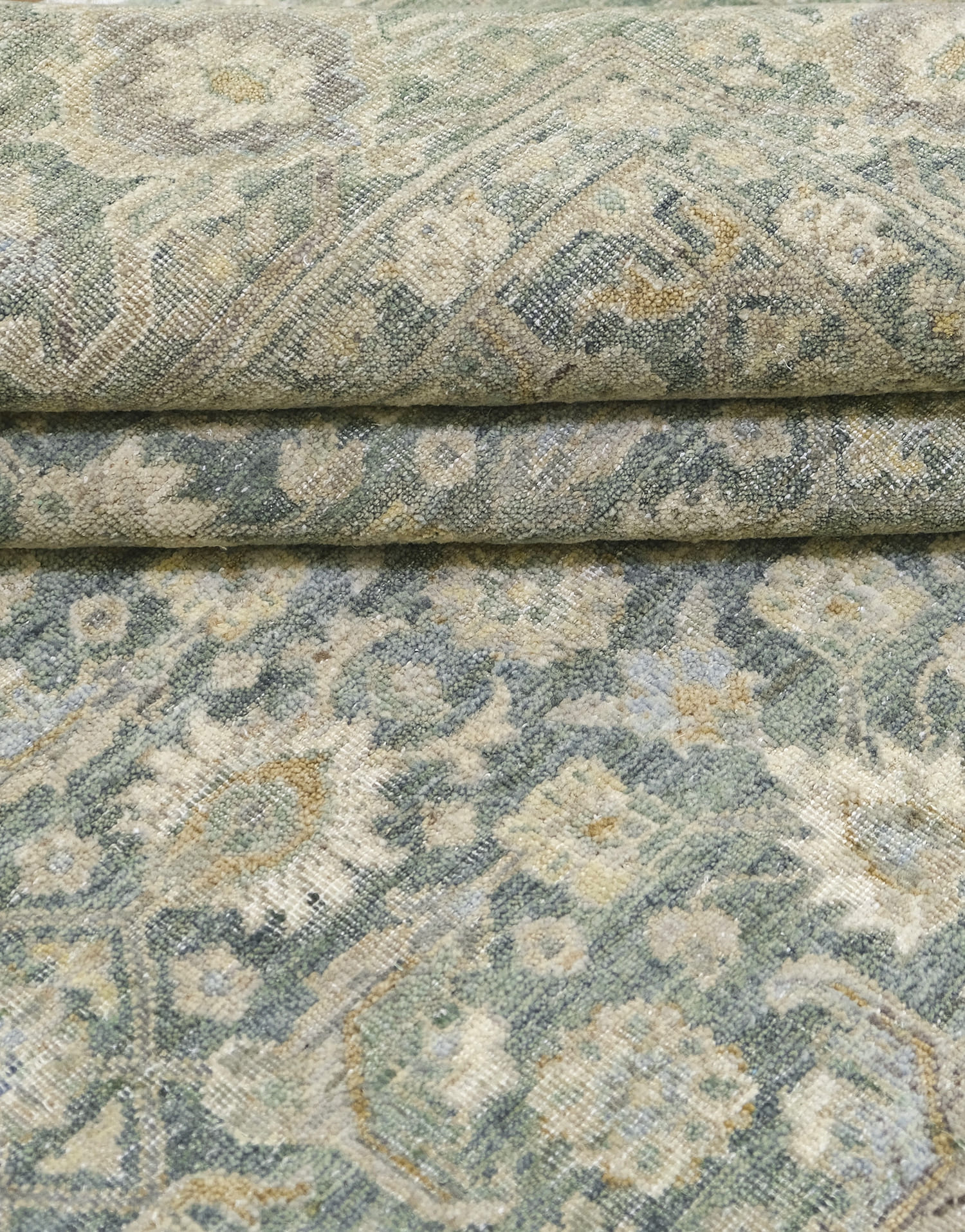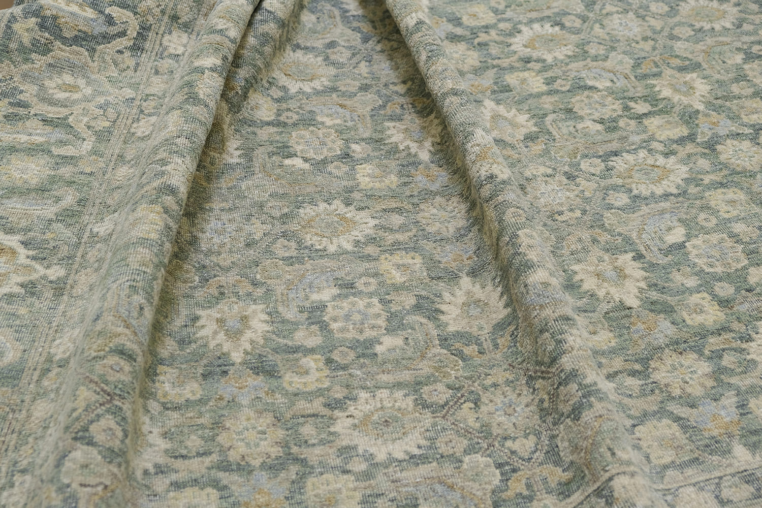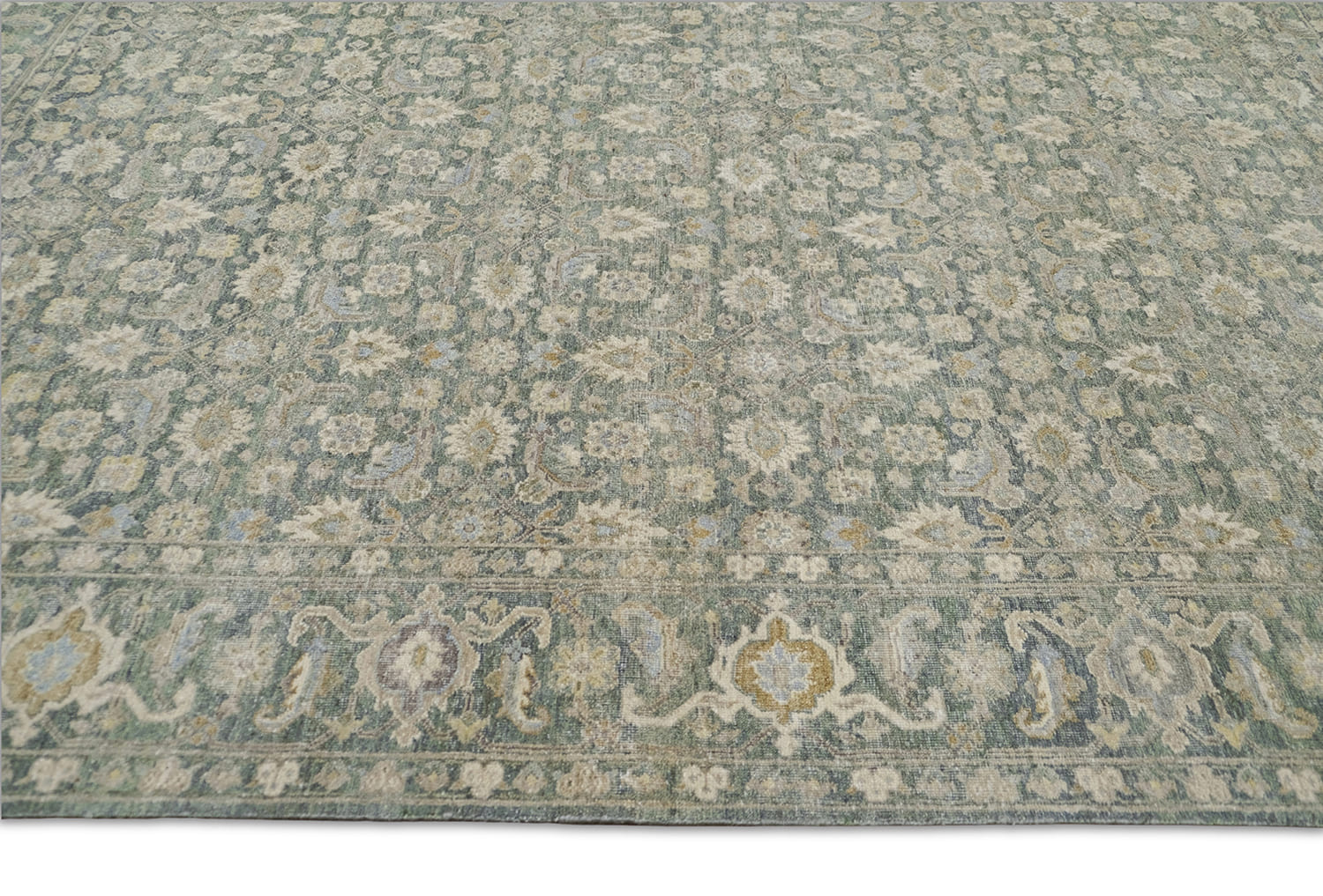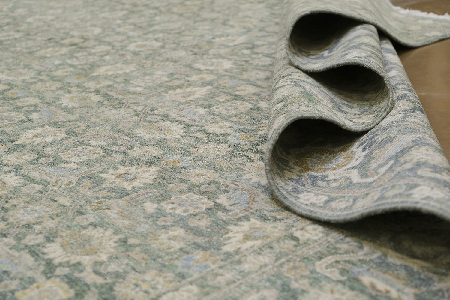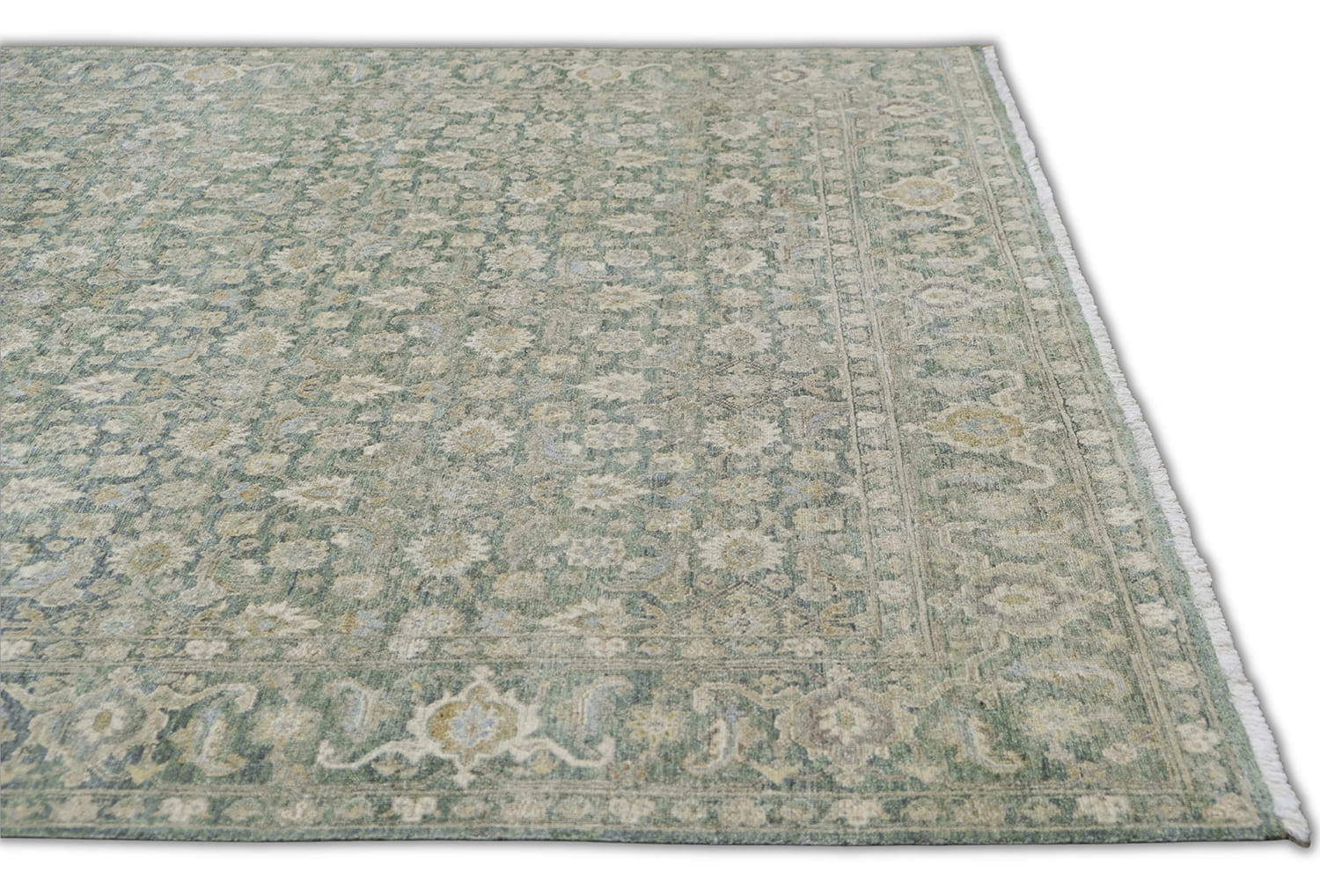 This heathered, hand-knotted masterpiece features a worn pile in select areas, expertly crafted to evoke the look and feel of an antique piece. Made from hand-spun wool, its predominantly green background is complemented by accents of light blue, ivory, and gold. The subtle variations in texture and color enhance its vintage appeal, creating a sophisticated and timeless design.