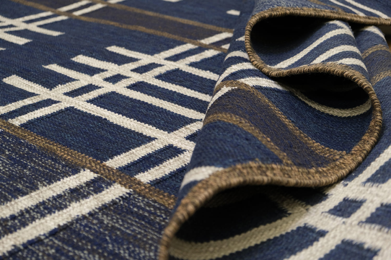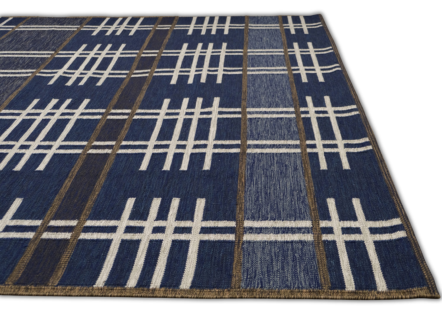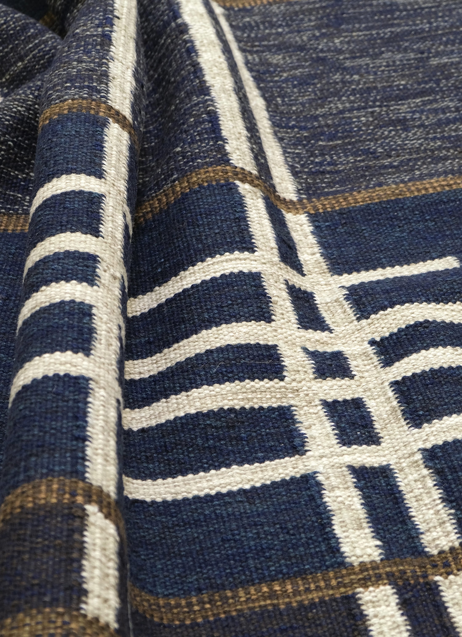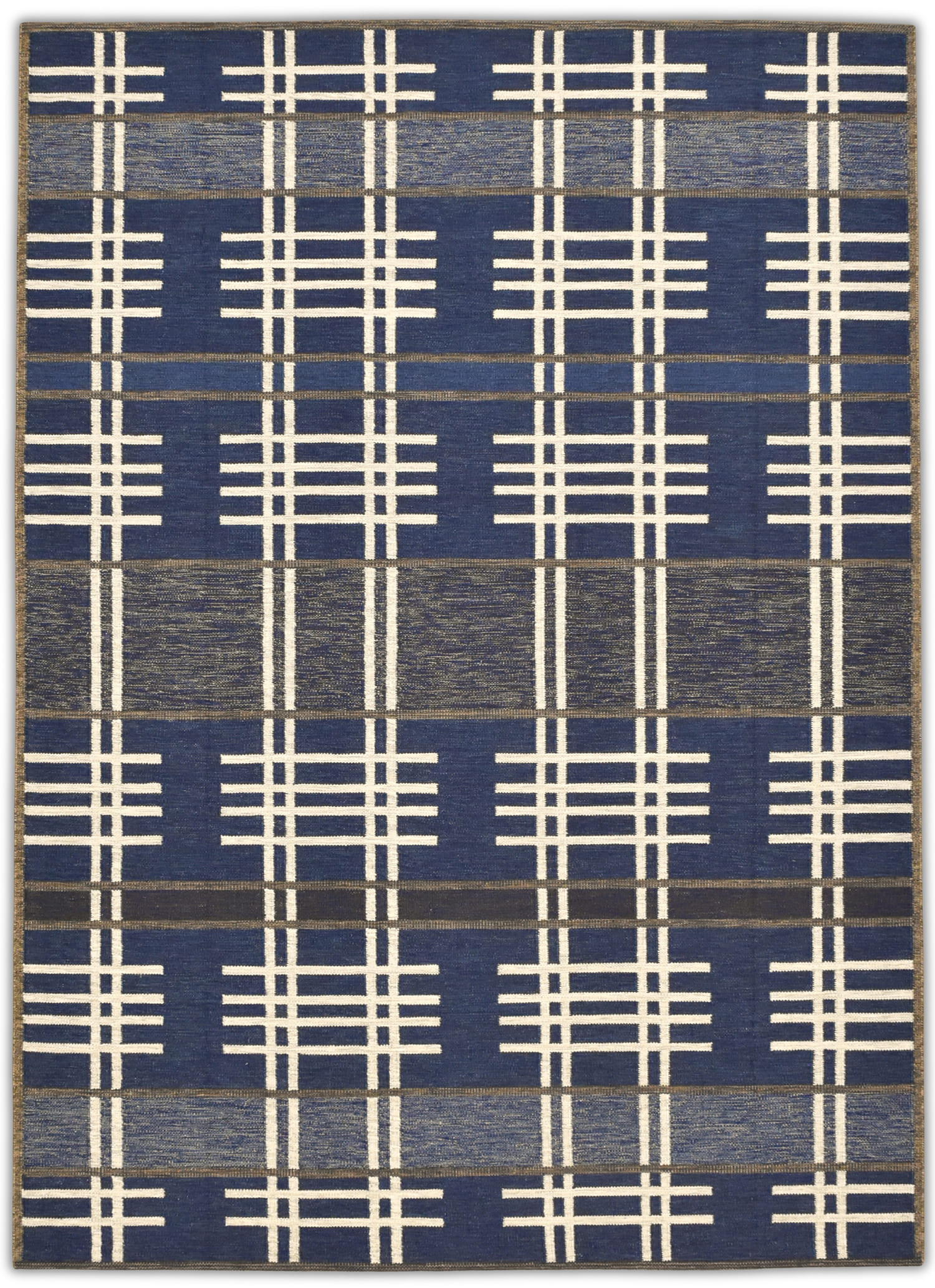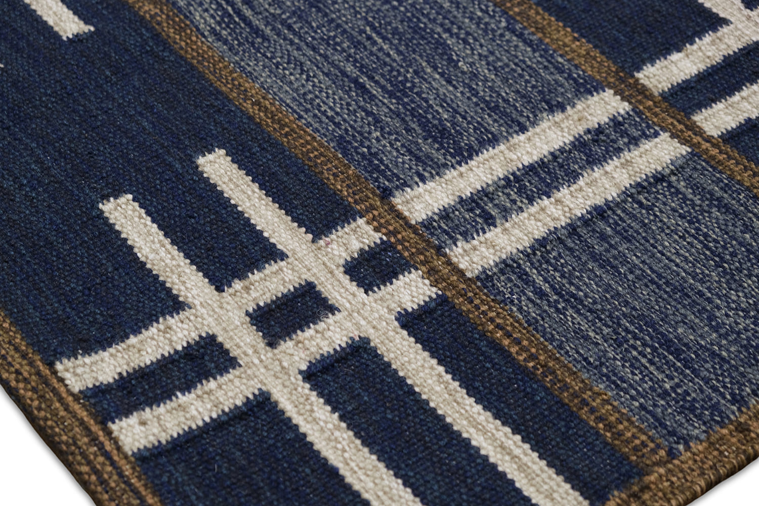 Mid Century Modern inspired by Vintage swedish designs. Hand Woven, crafted in hand spun wool blend pile. This textured flat weave highlights a palette of rich navy and denim blues, accented with ivory and framed with warm brownish-taupe outlines.