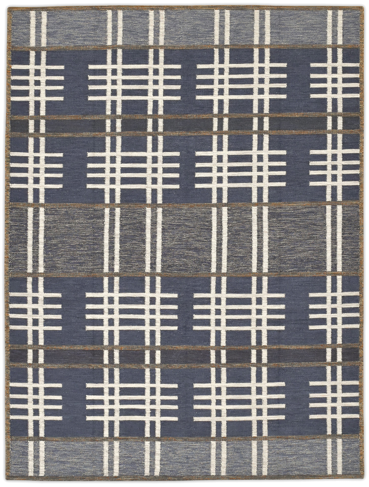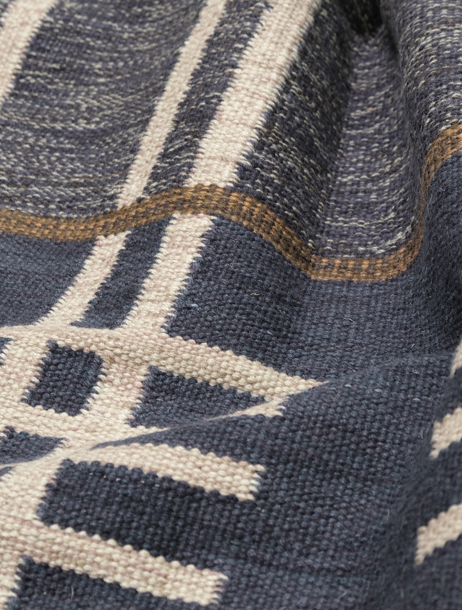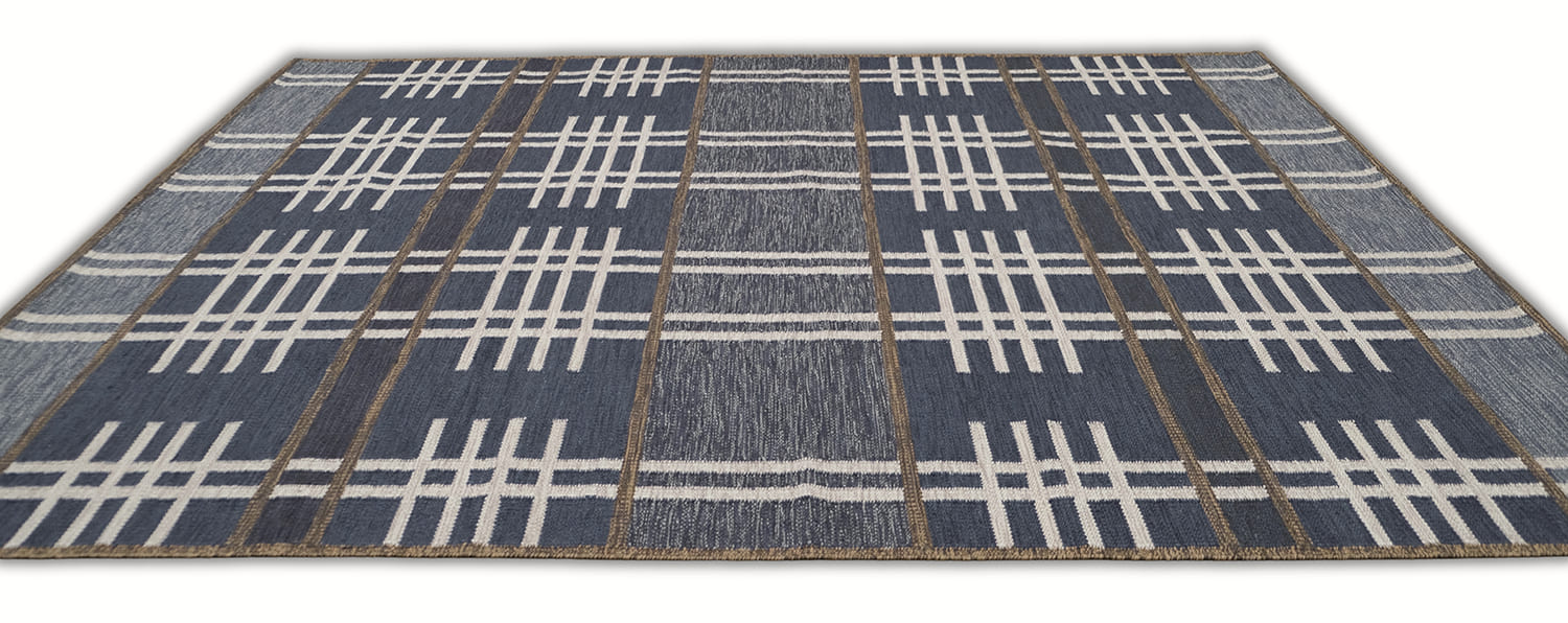 Mid Century Modern inspired by Vintage swedish designs. Hand Woven, crafted in hand spun wool blend pile. This textured flat weave highlights a palette of rich navy and denim blues, accented with ivory and framed with warm brownish-taupe outlines.