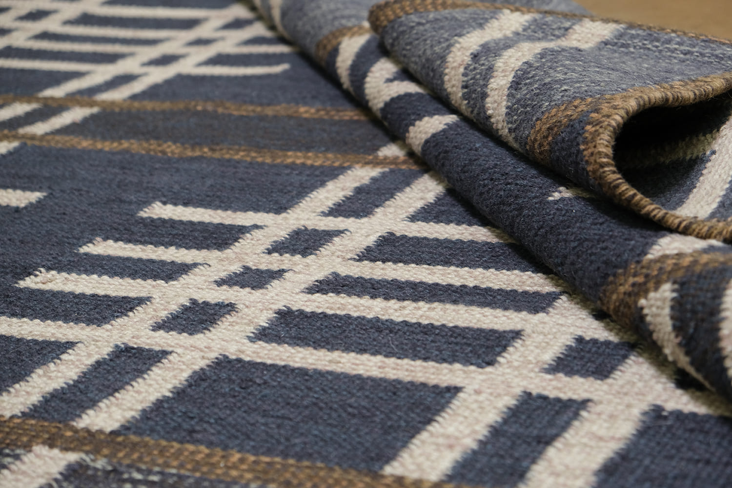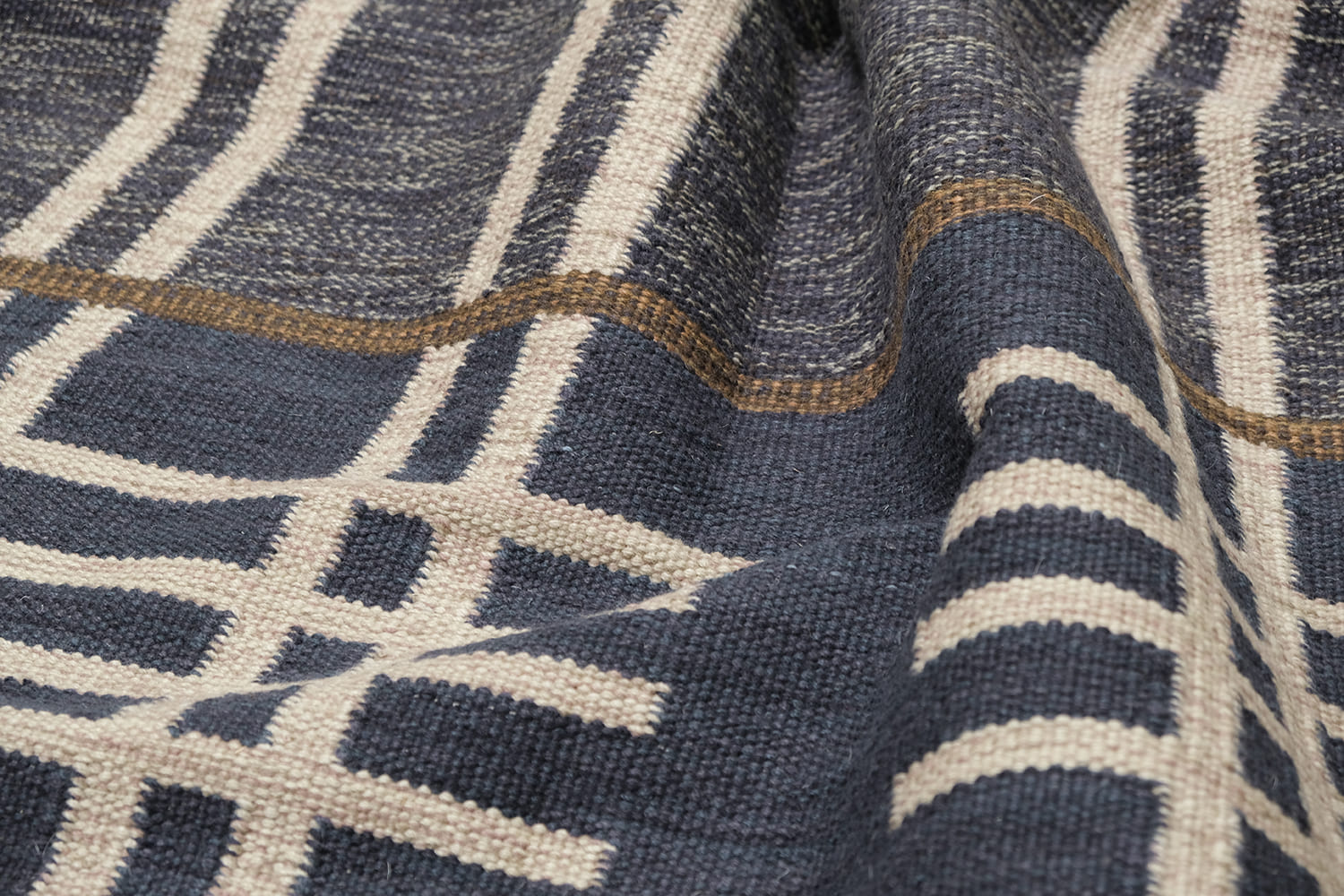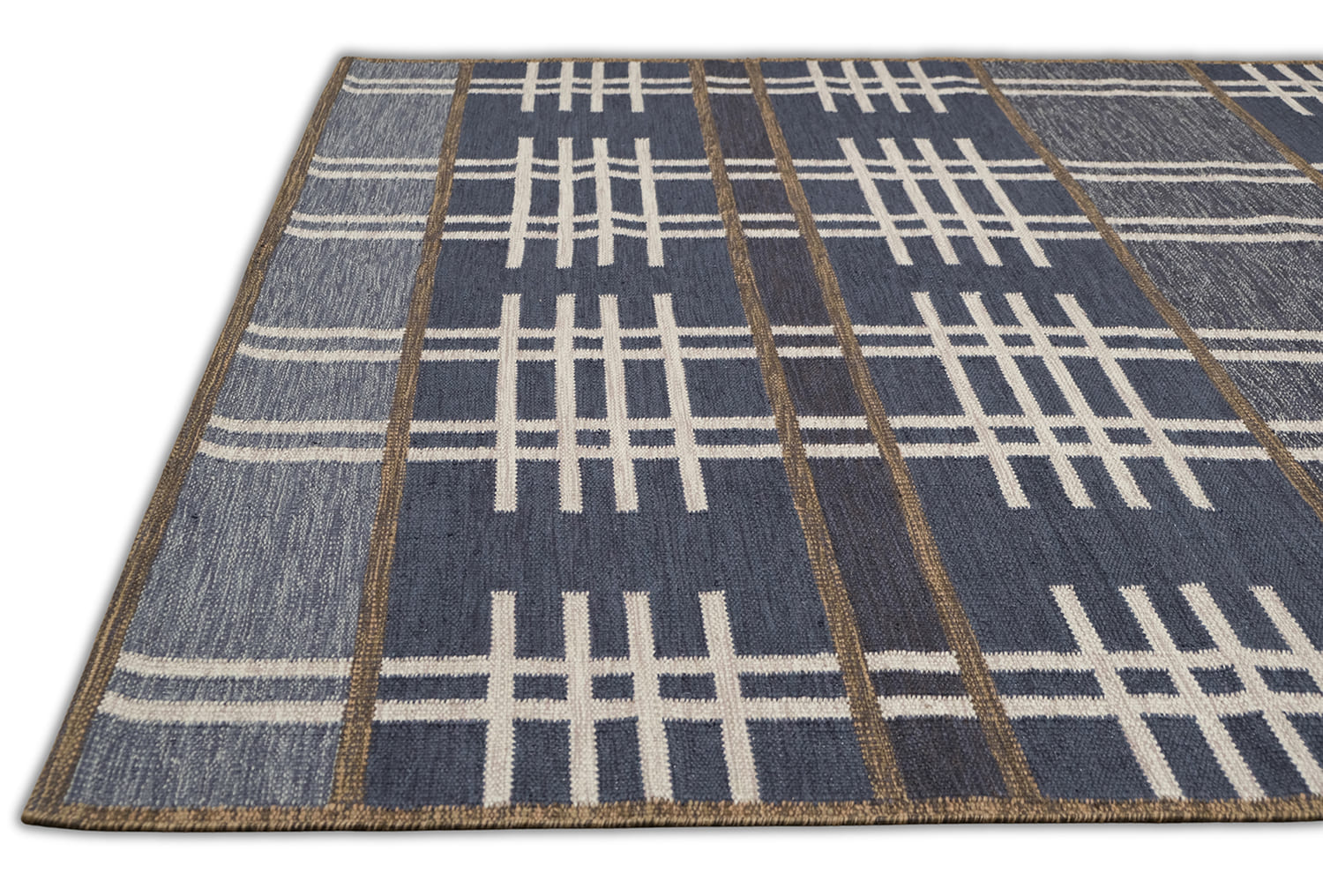 Mid Century Modern inspired by Vintage swedish designs. Hand Woven, crafted in hand spun wool blend pile. This textured flat weave highlights a palette of rich navy and denim blues, accented with ivory and framed with warm brownish-taupe outlines.
