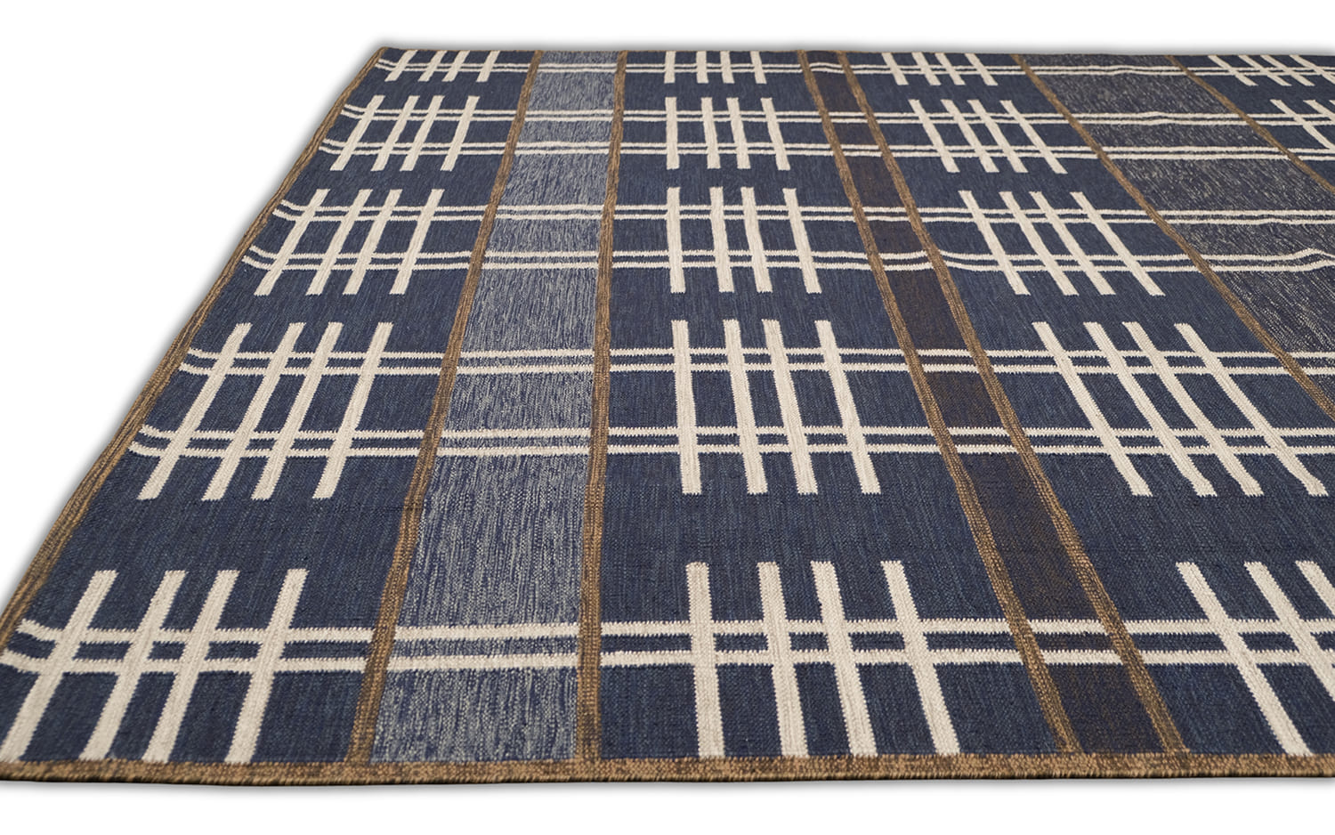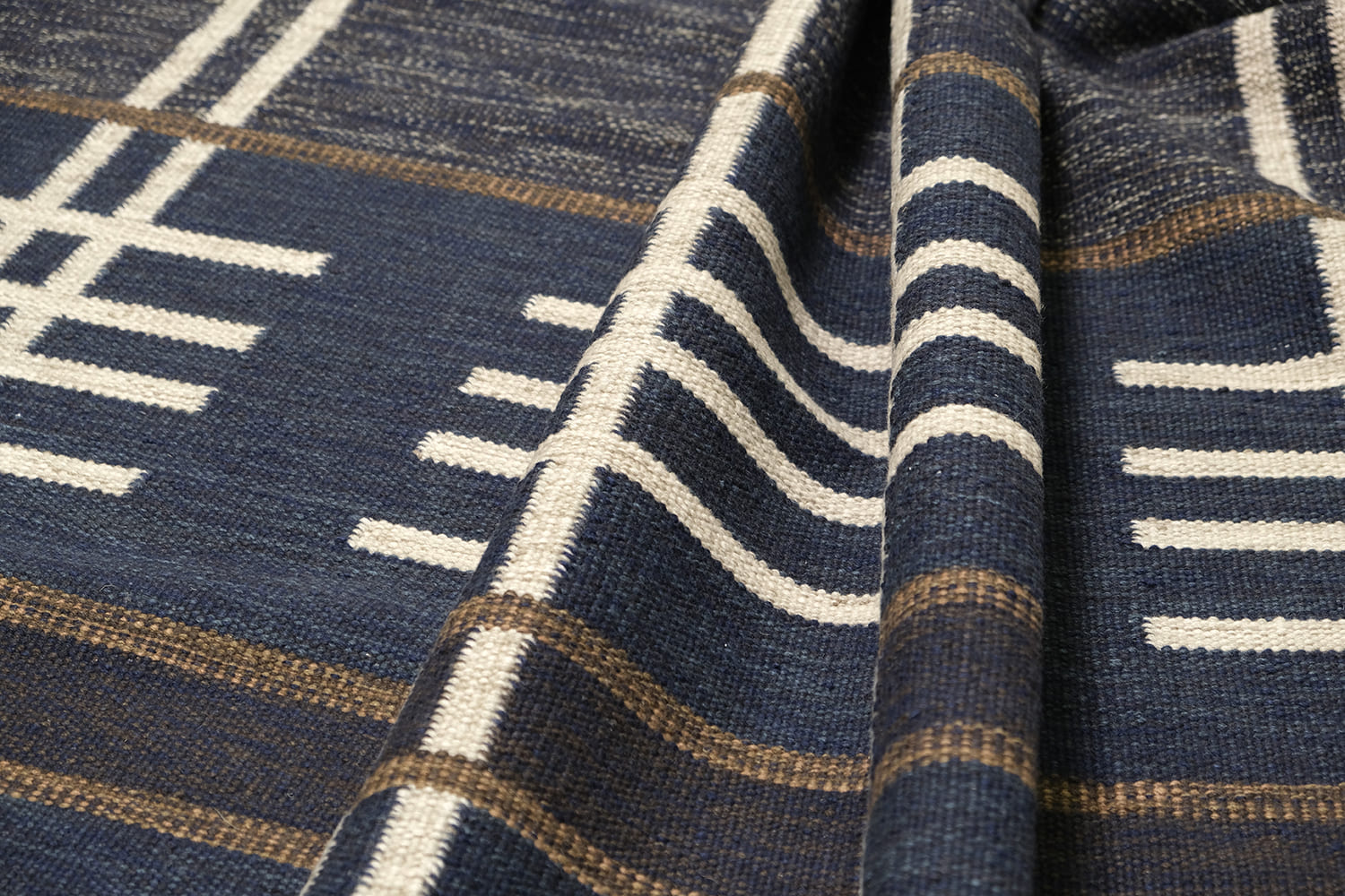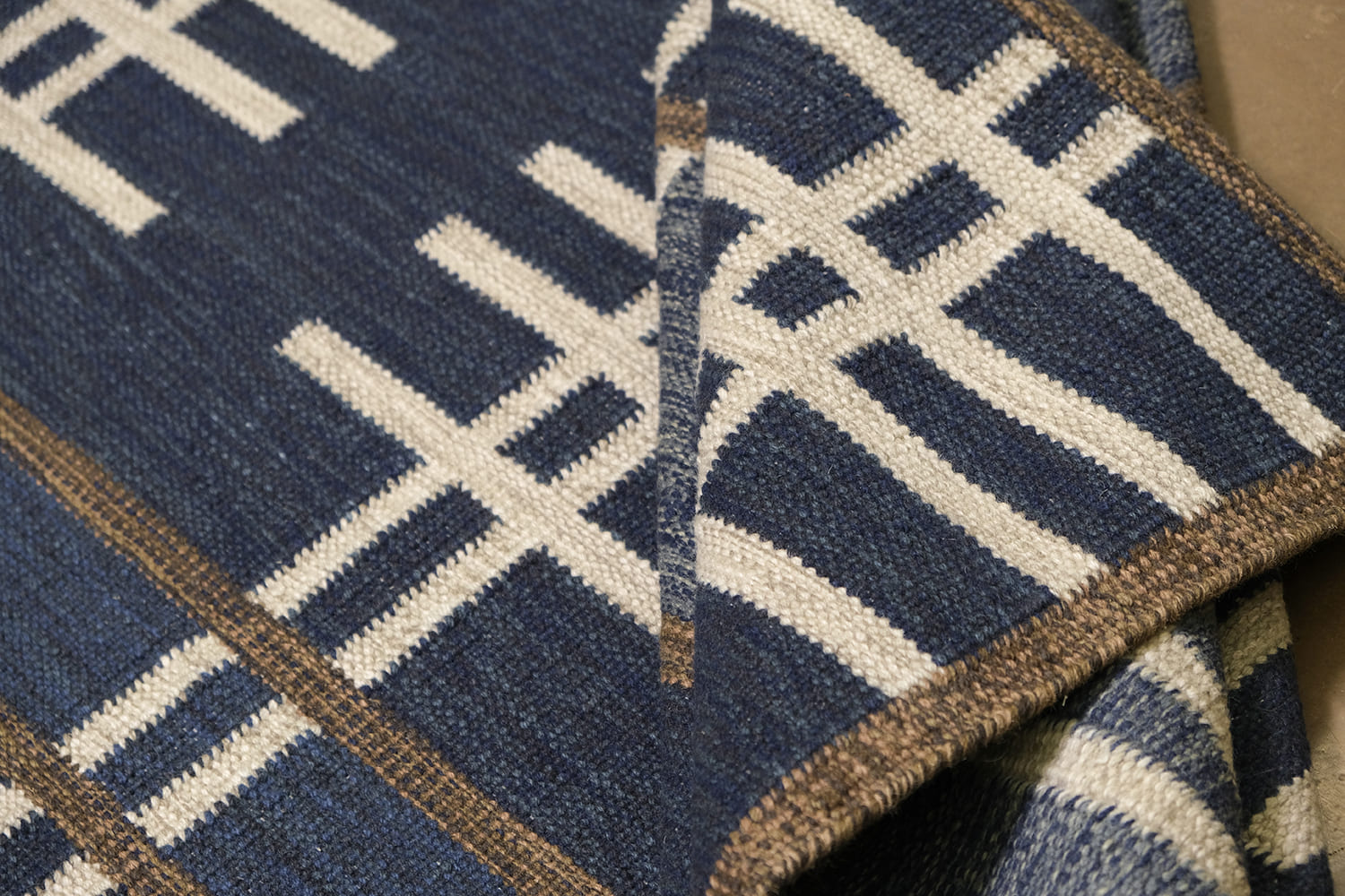 Mid Century Modern inspired by Vintage swedish designs. Hand Woven, crafted in hand spun wool blend pile. This textured flat weave highlights a palette of rich navy and denim blues, accented with ivory and framed with warm brownish-taupe outlines.