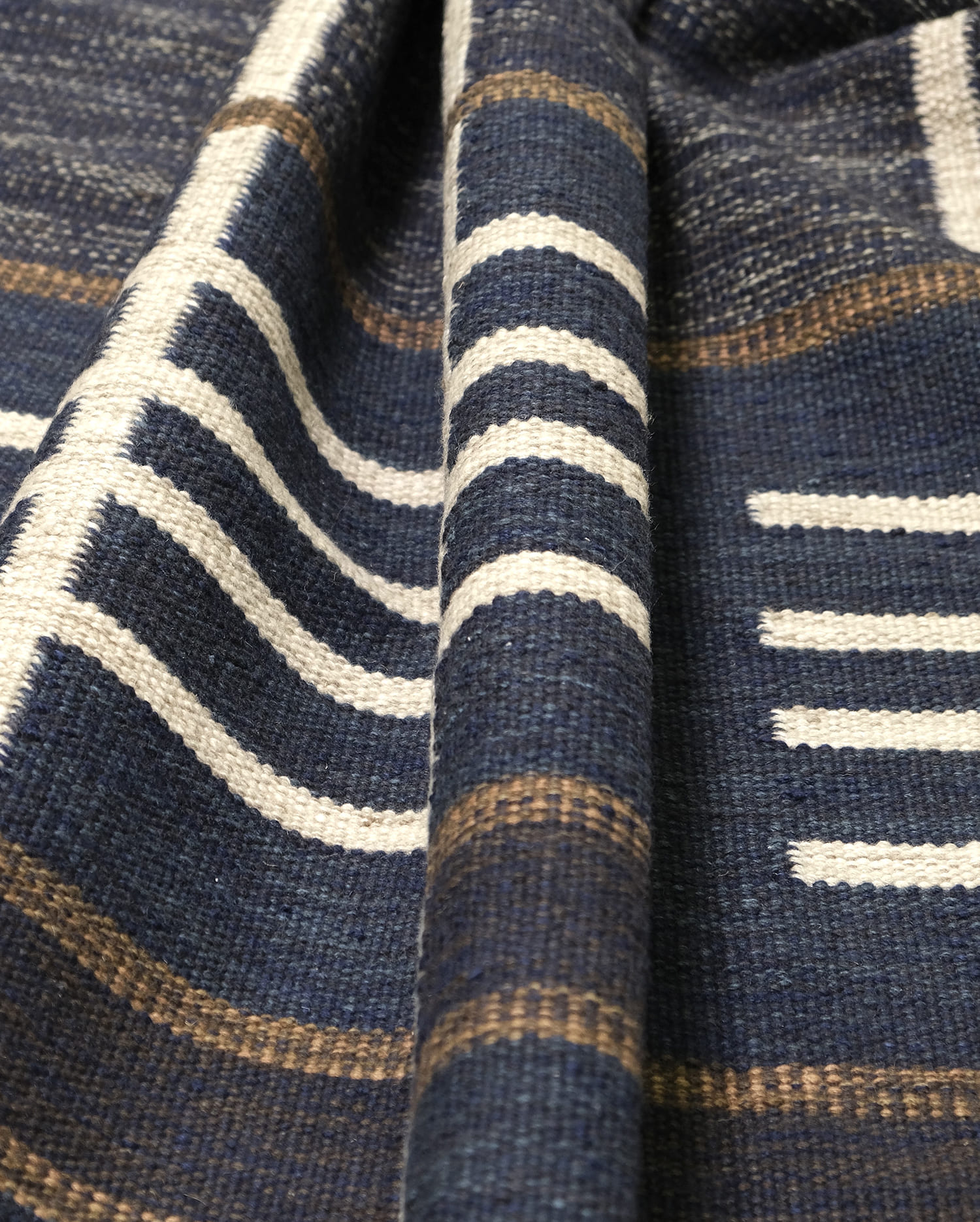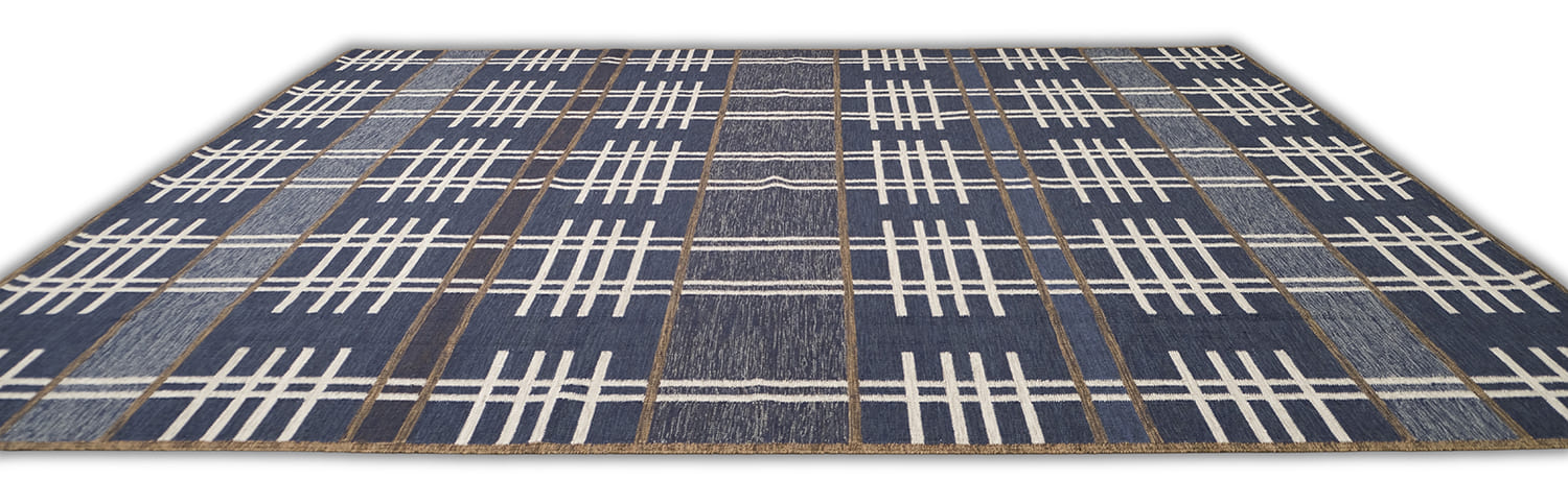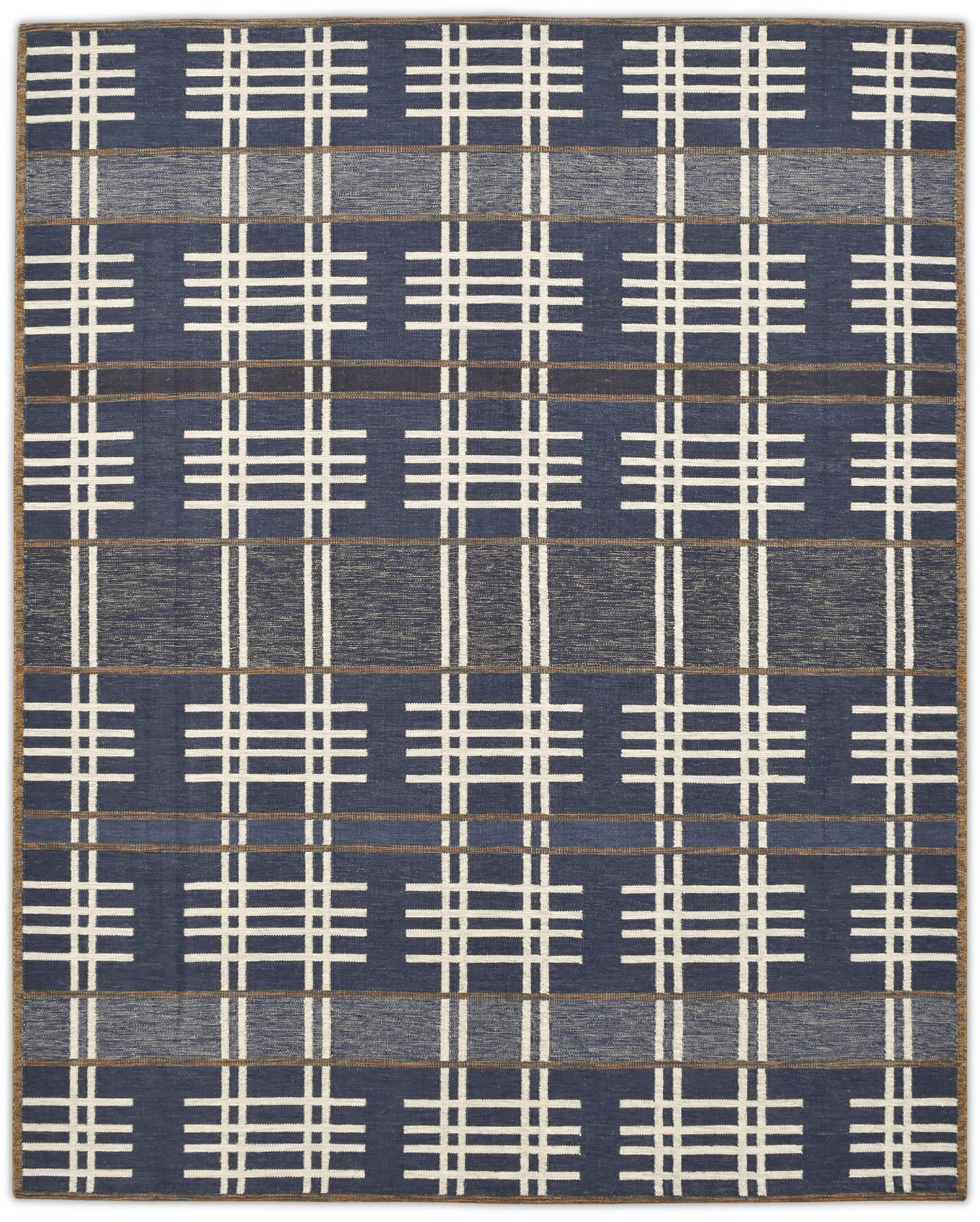 Mid Century Modern inspired by Vintage swedish designs. Hand Woven, crafted in hand spun wool blend pile. This textured flat weave highlights a palette of rich navy and denim blues, accented with ivory and framed with warm brownish-taupe outlines.