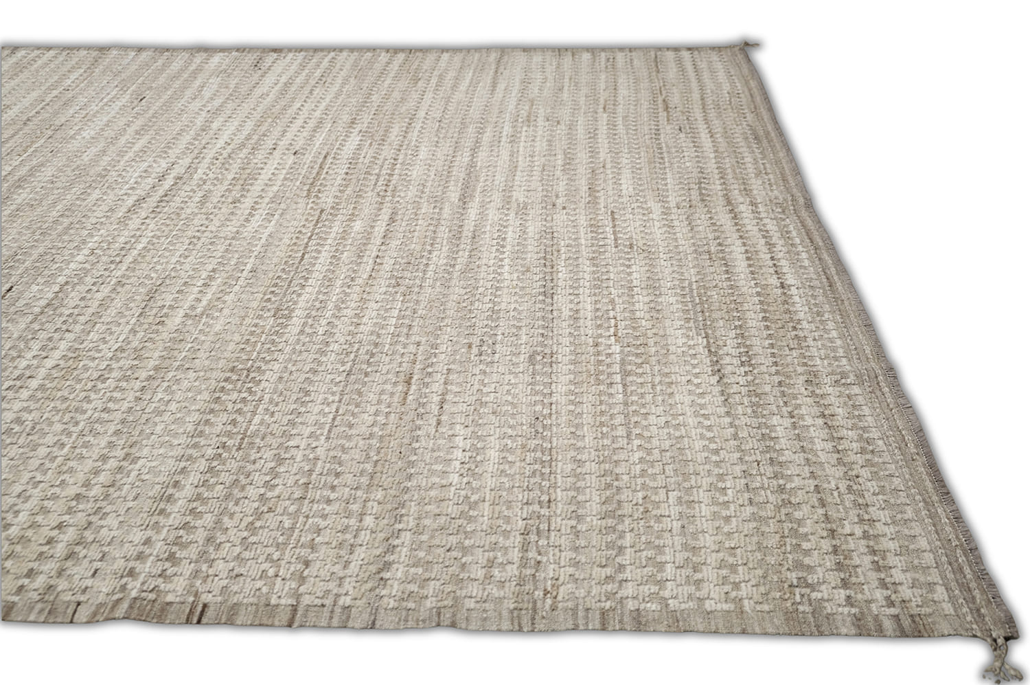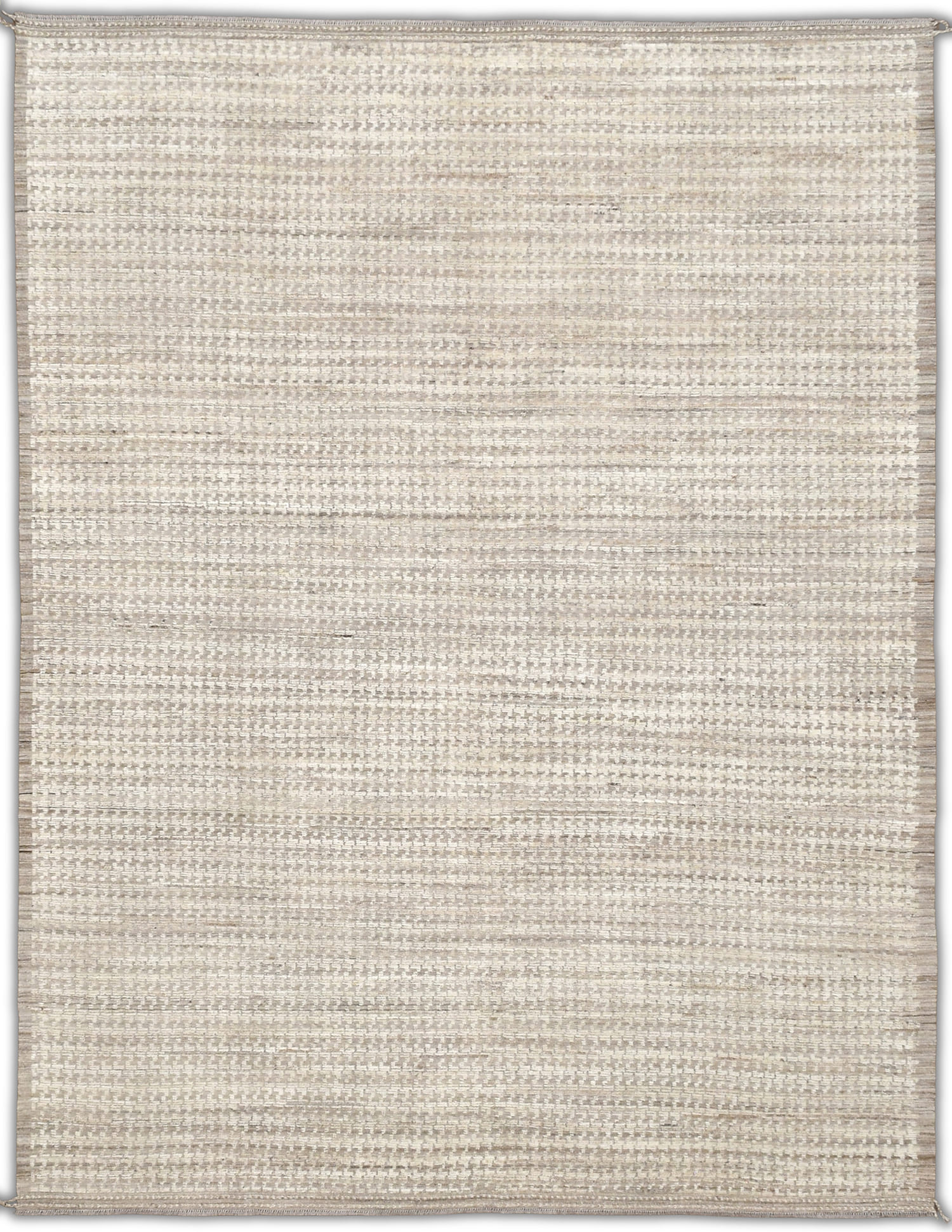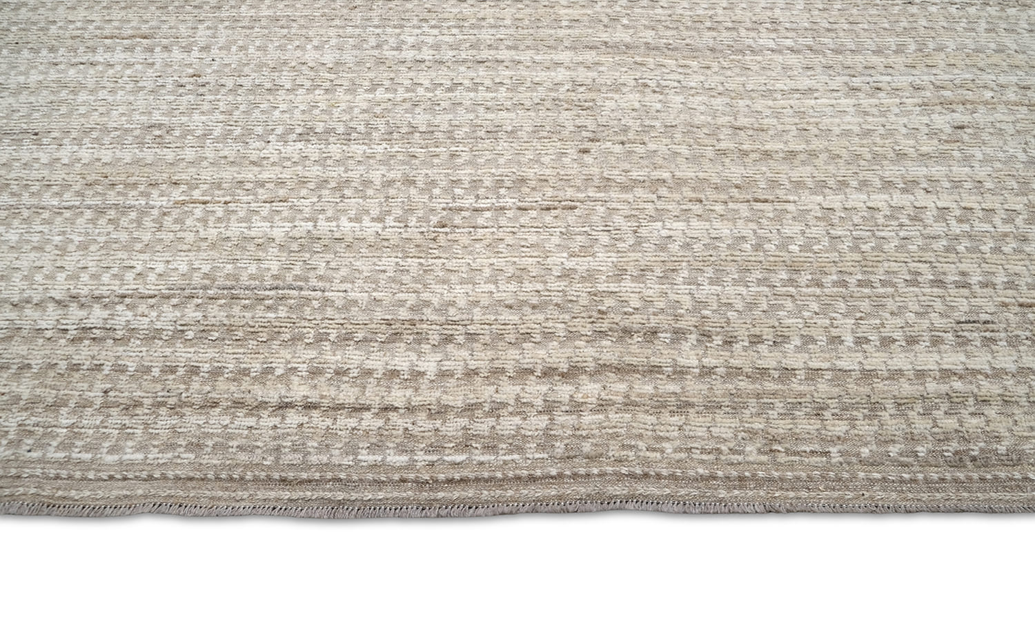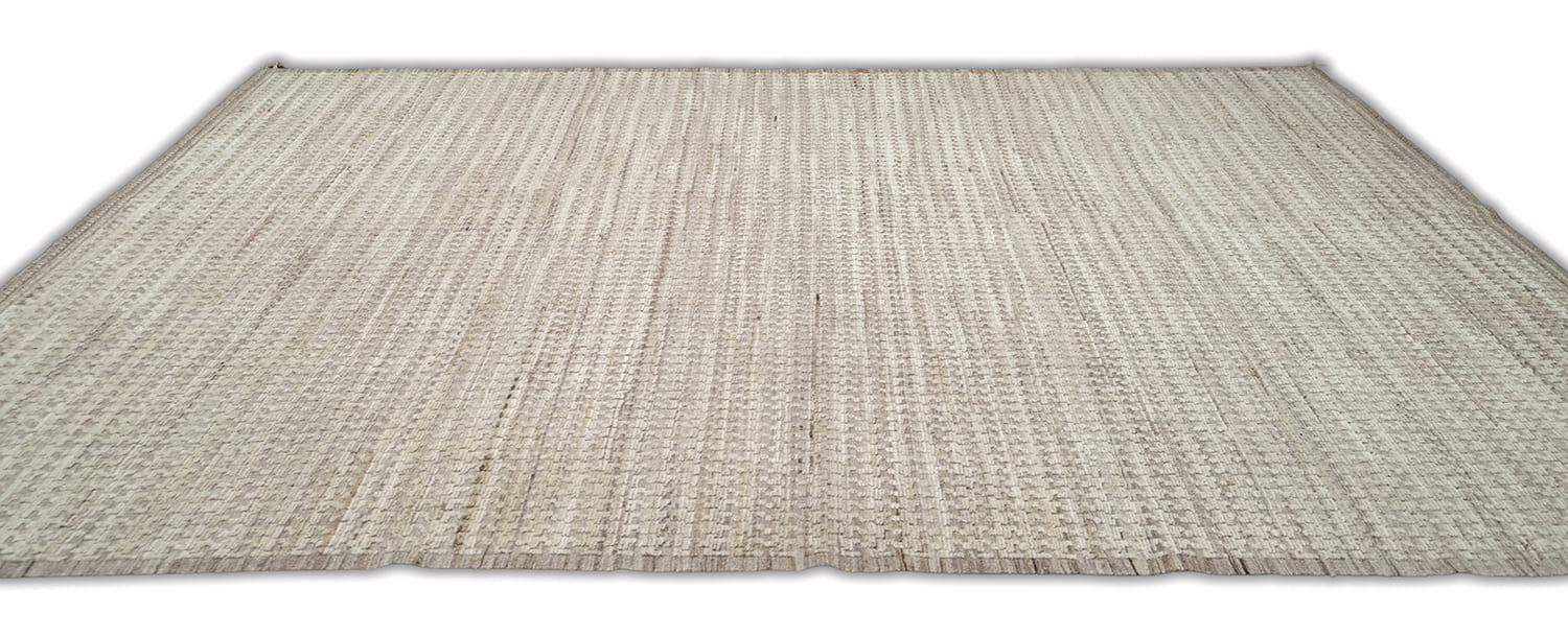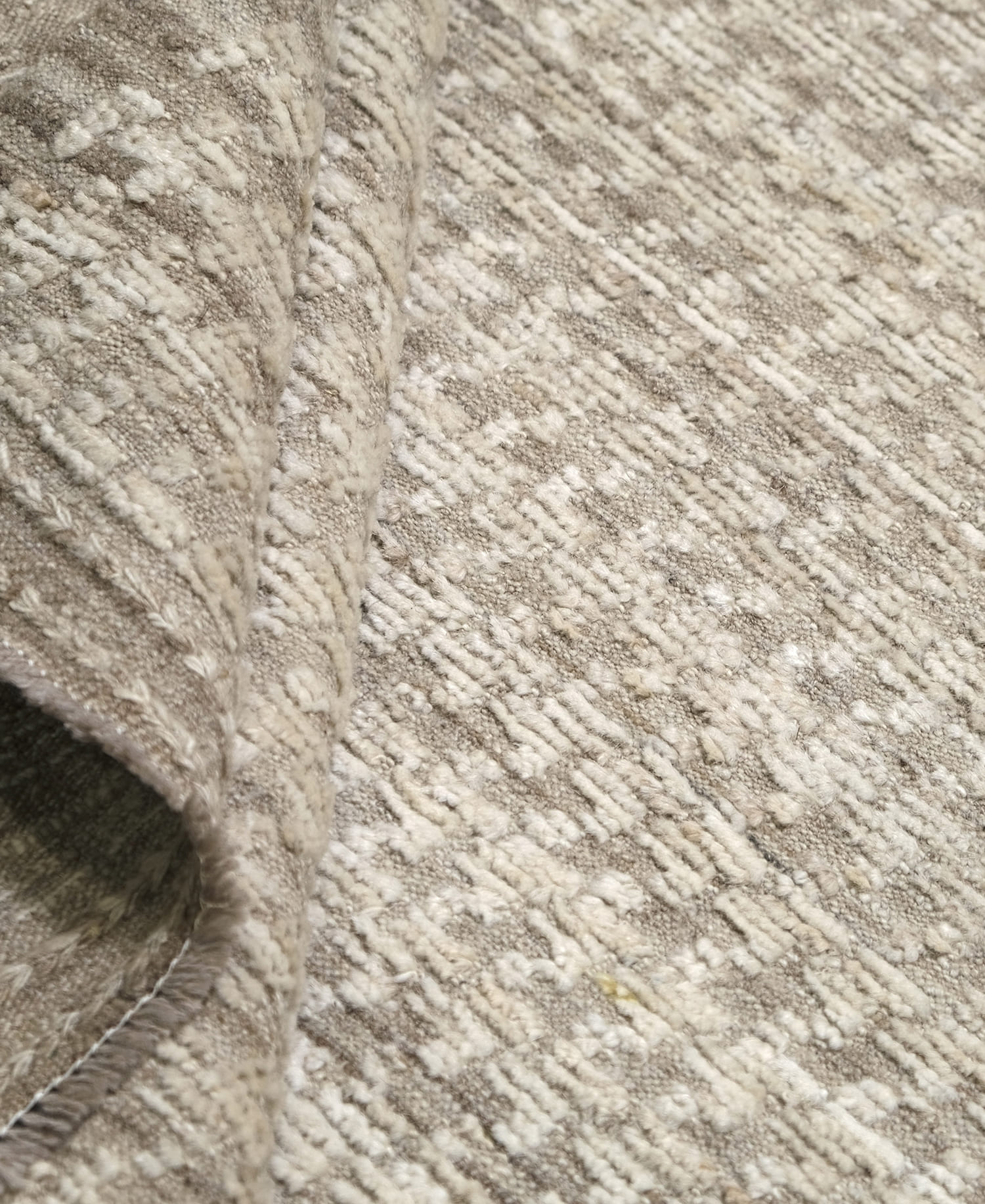 Hand-knotted, crafted with hand-spun wool pile. This soft textured rug features a natural palette of ivory, beige, taupe, and sandy browns. The organic tones and subtle pattern create a warm, earthy aesthetic with timeless appeal.