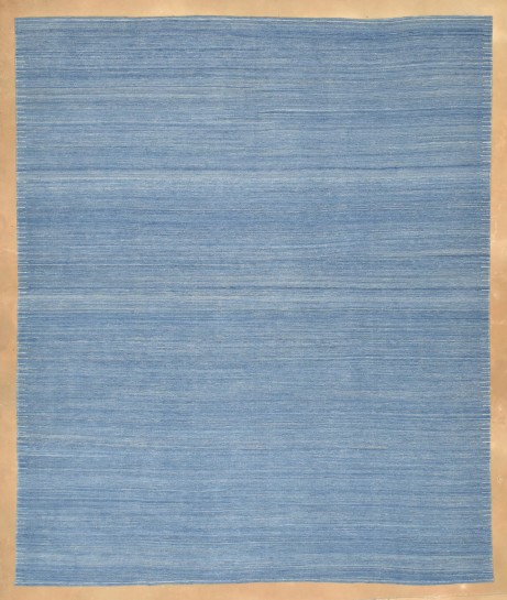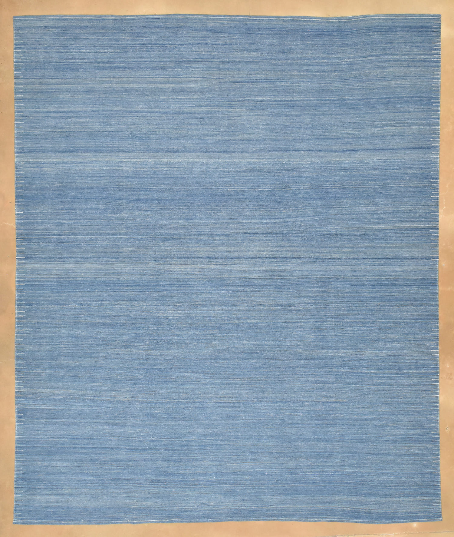 Fine Handwoven crafted with hand-spun wool, this flat weave kilim features a calming spectrum of blue tones, from soft sky to deep denim. Its minimalist design, durable craftsmanship, and timeless elegance make it a versatile piece for any interior.