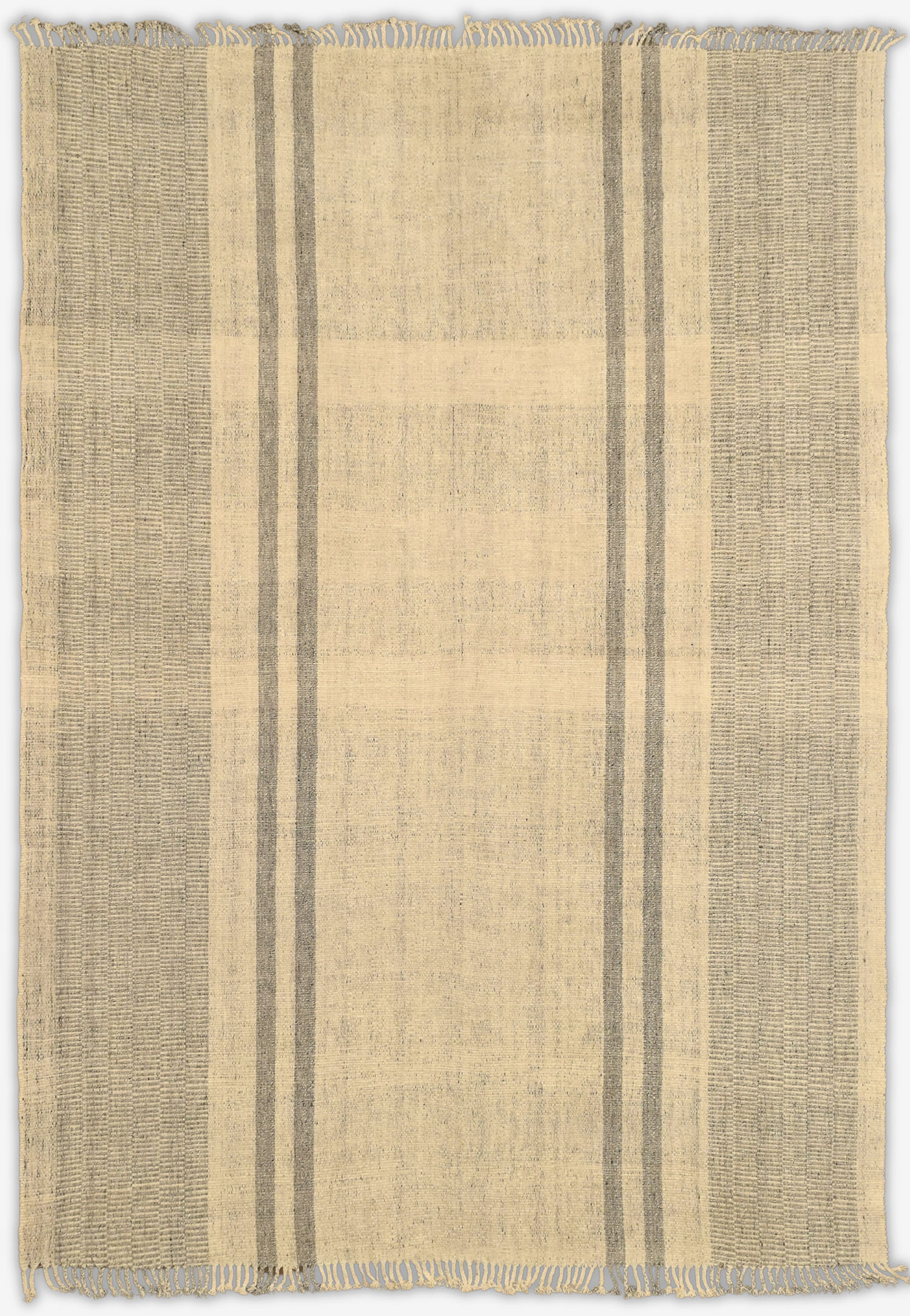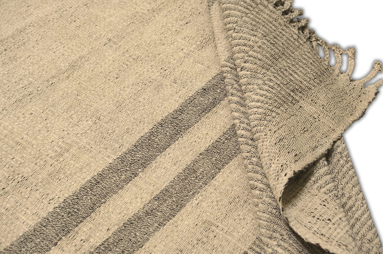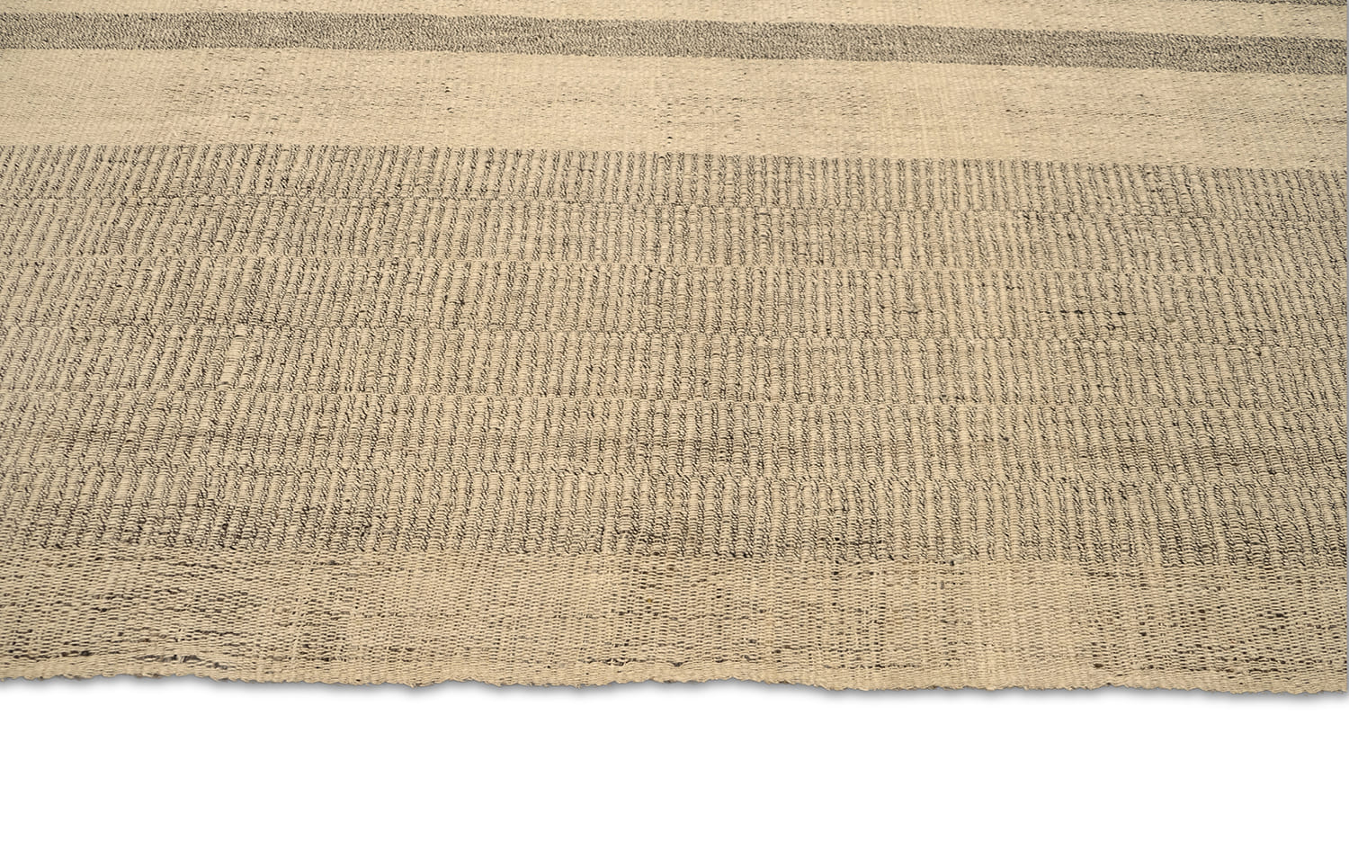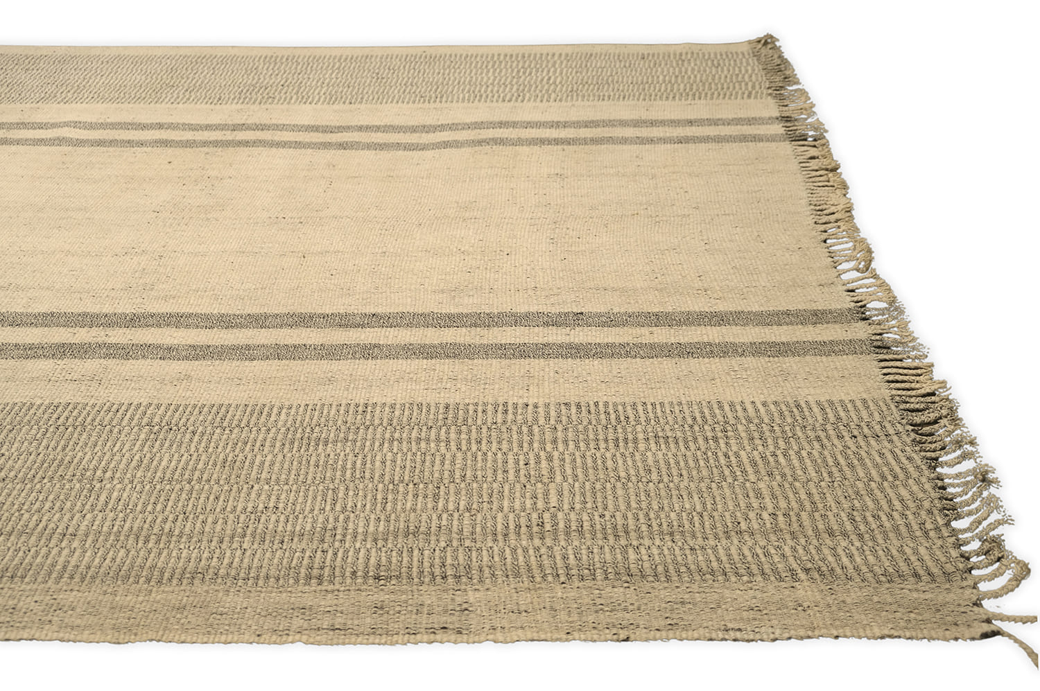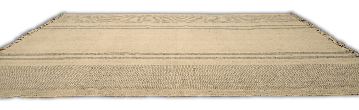 Handwoven textured flat weave with wool pile features a soft blend of warm Ivory, brown and charcoal tones in a subtle linear design. Minimalist yet elegant, it complements both modern and traditional interiors while offering durability and timeless style.