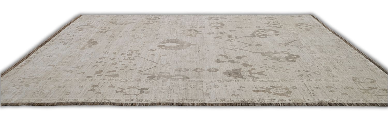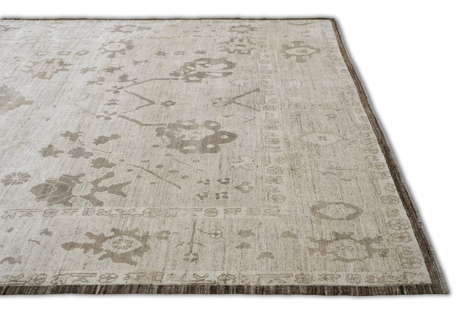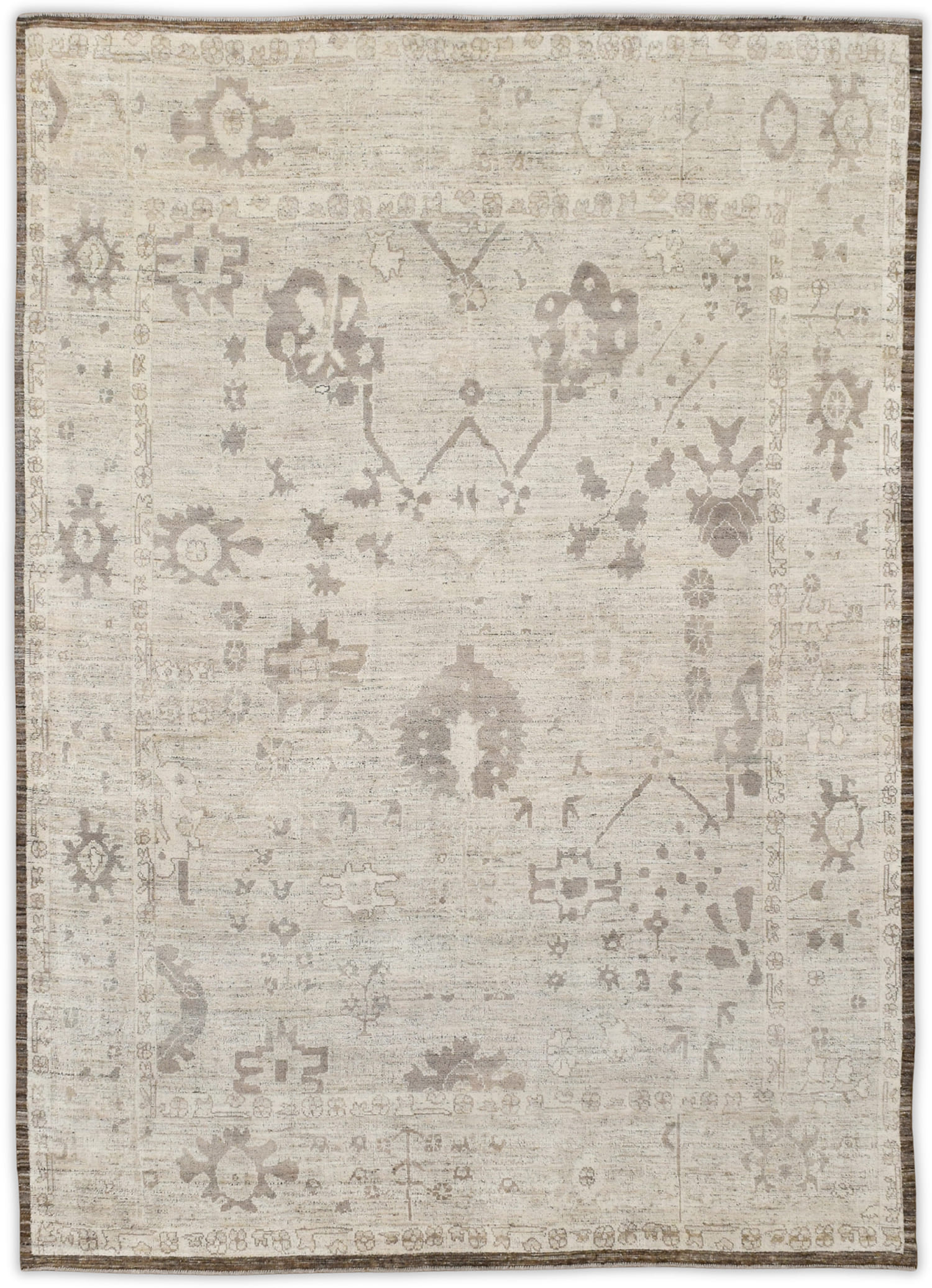 Soft, heathered, this hand-knotted, hand-spun wool rug is crafted in a subtle neutral palette. Ivory background with soft beige, taupe, and grey-brown motifs, finished with subtle chocolate brown border, this timeless design offers a versatile and sophisticated look for both modern and traditional interiors.