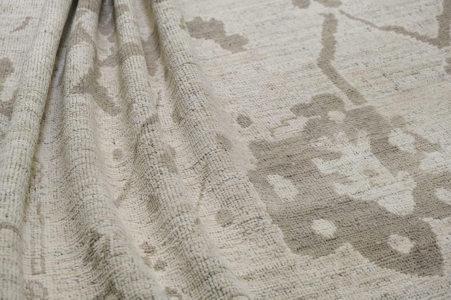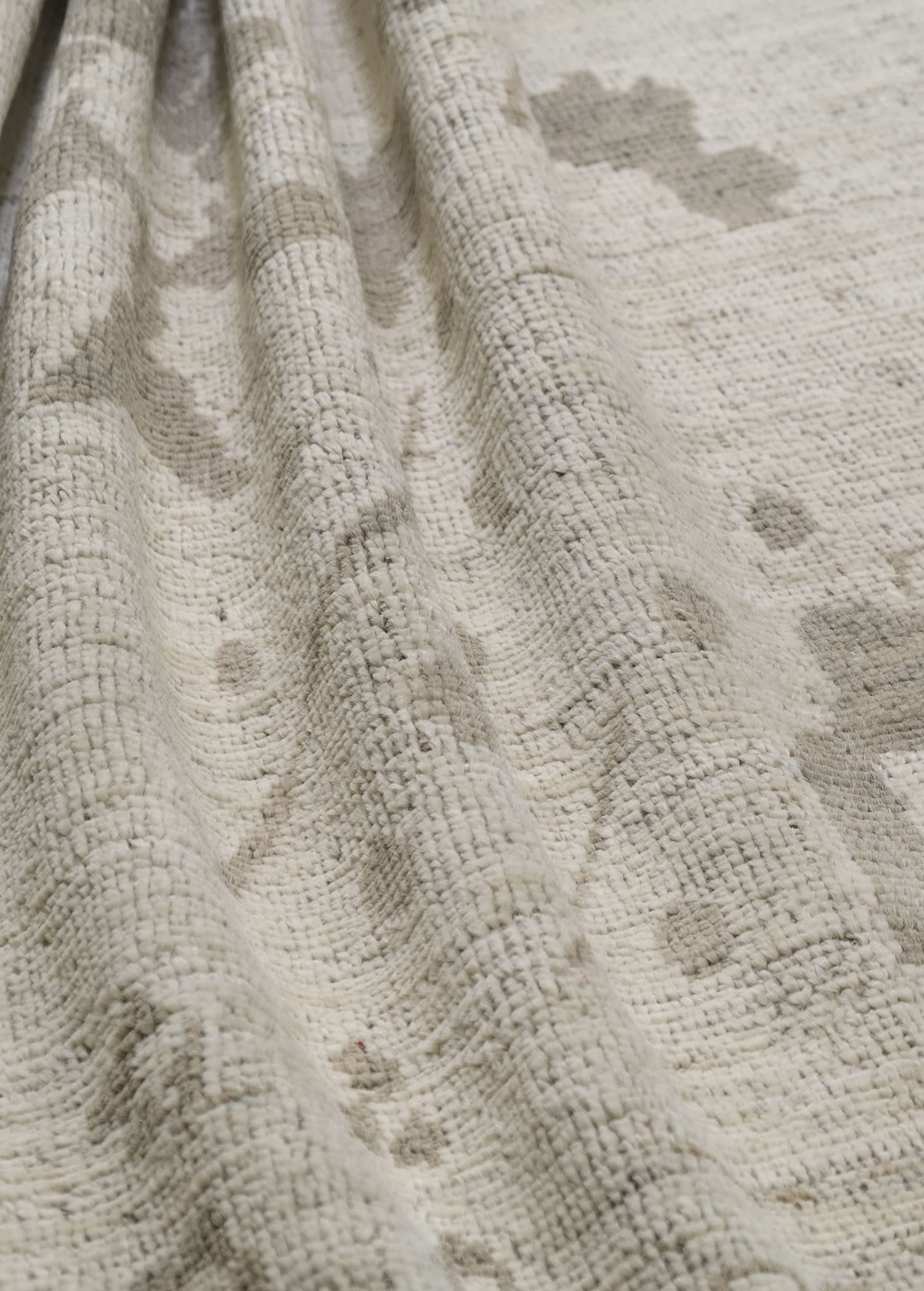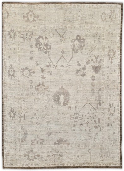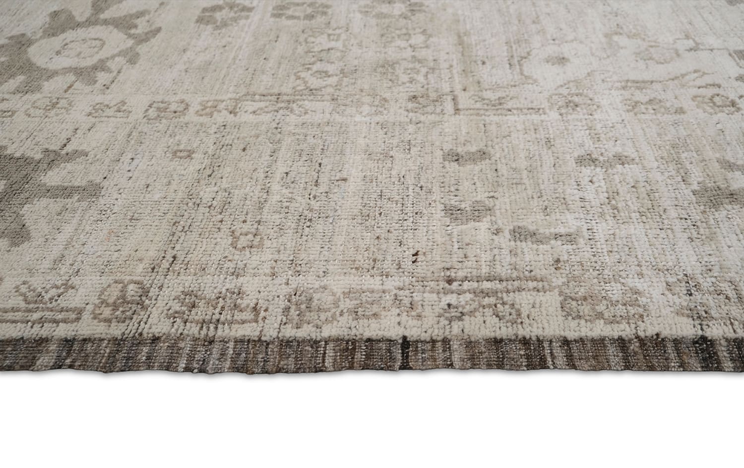 Soft, heathered, this hand-knotted, hand-spun wool rug is crafted in a subtle neutral palette. Ivory background with soft beige, taupe, and grey-brown motifs, finished with subtle chocolate brown border, this timeless design offers a versatile and sophisticated look for both modern and traditional interiors.