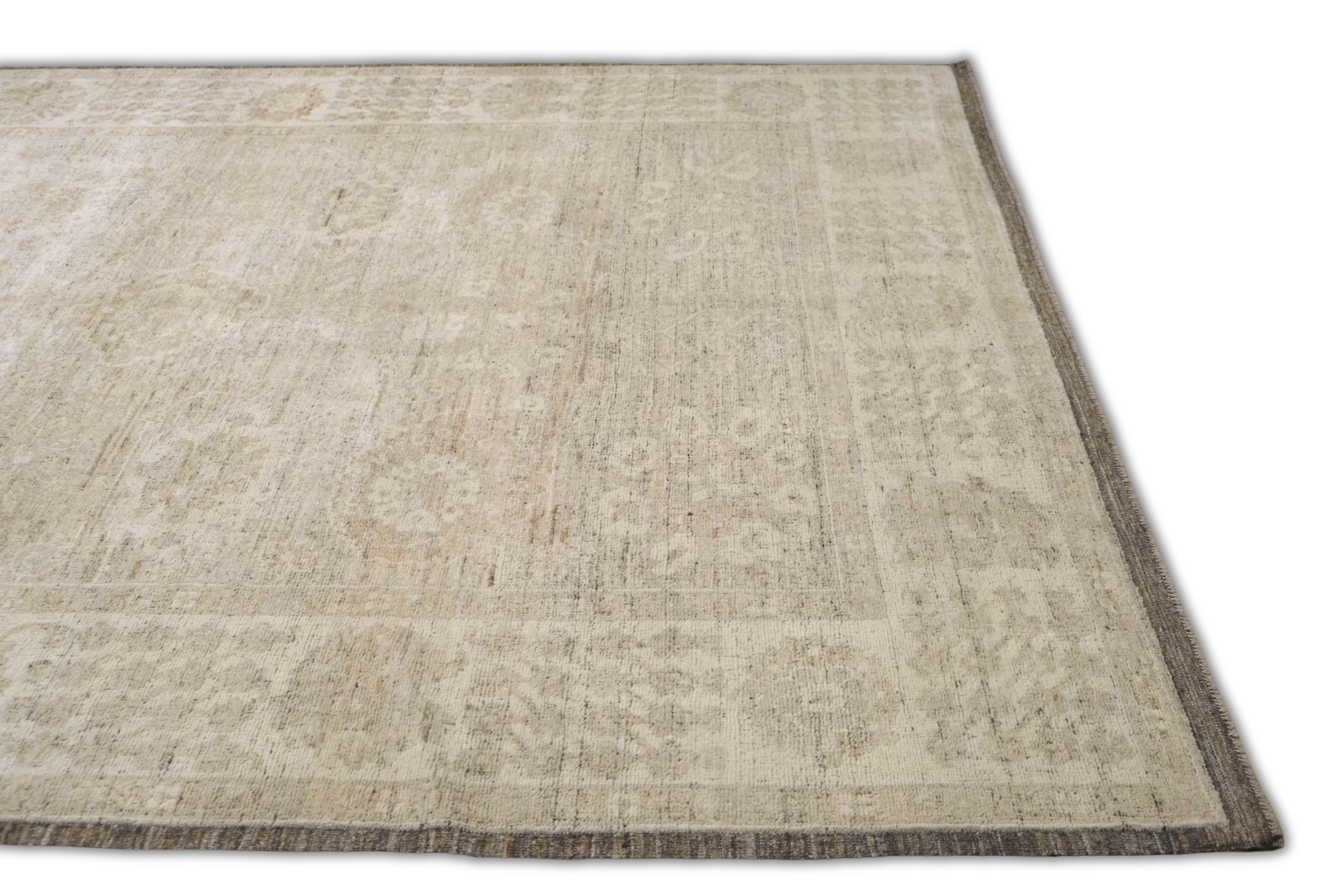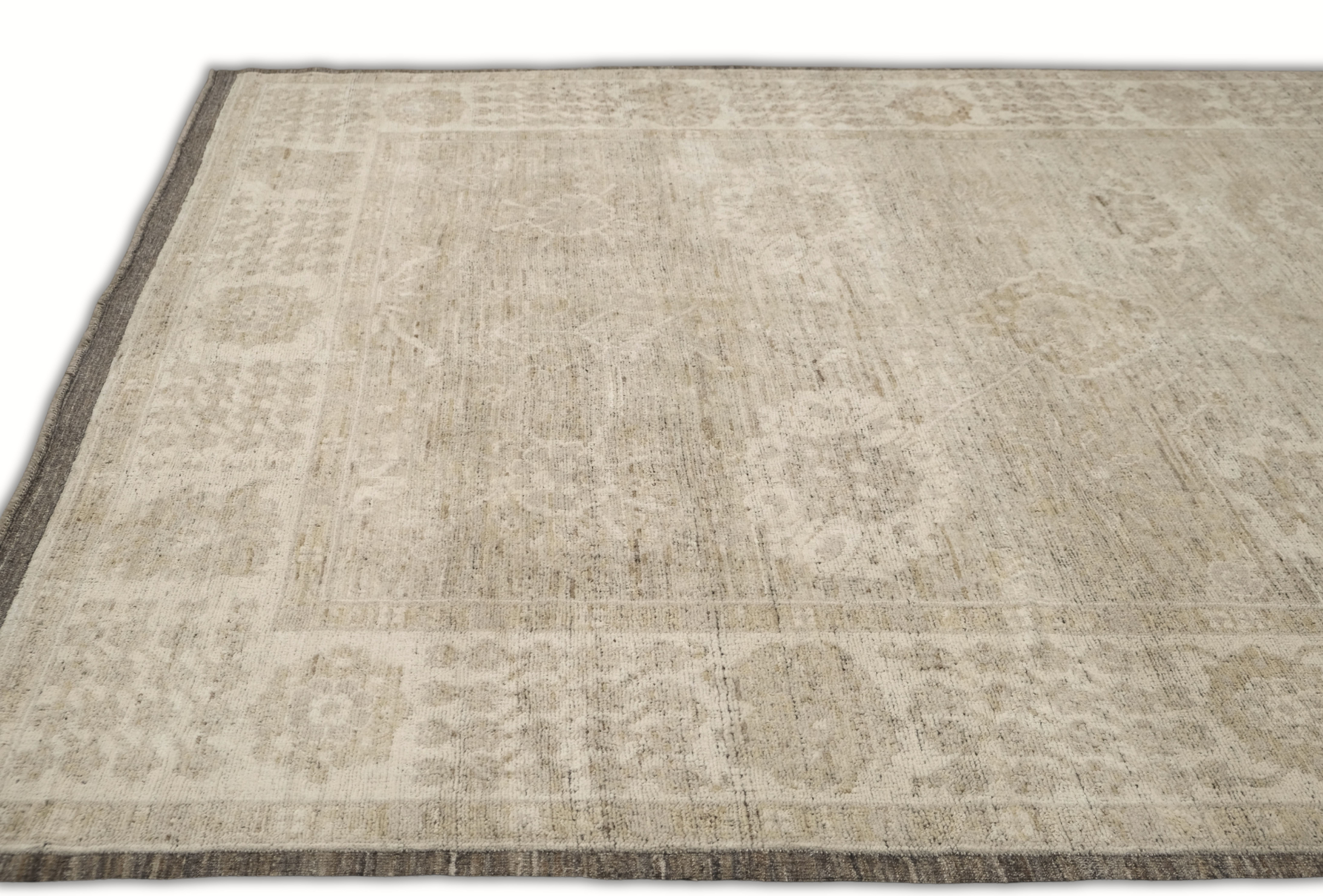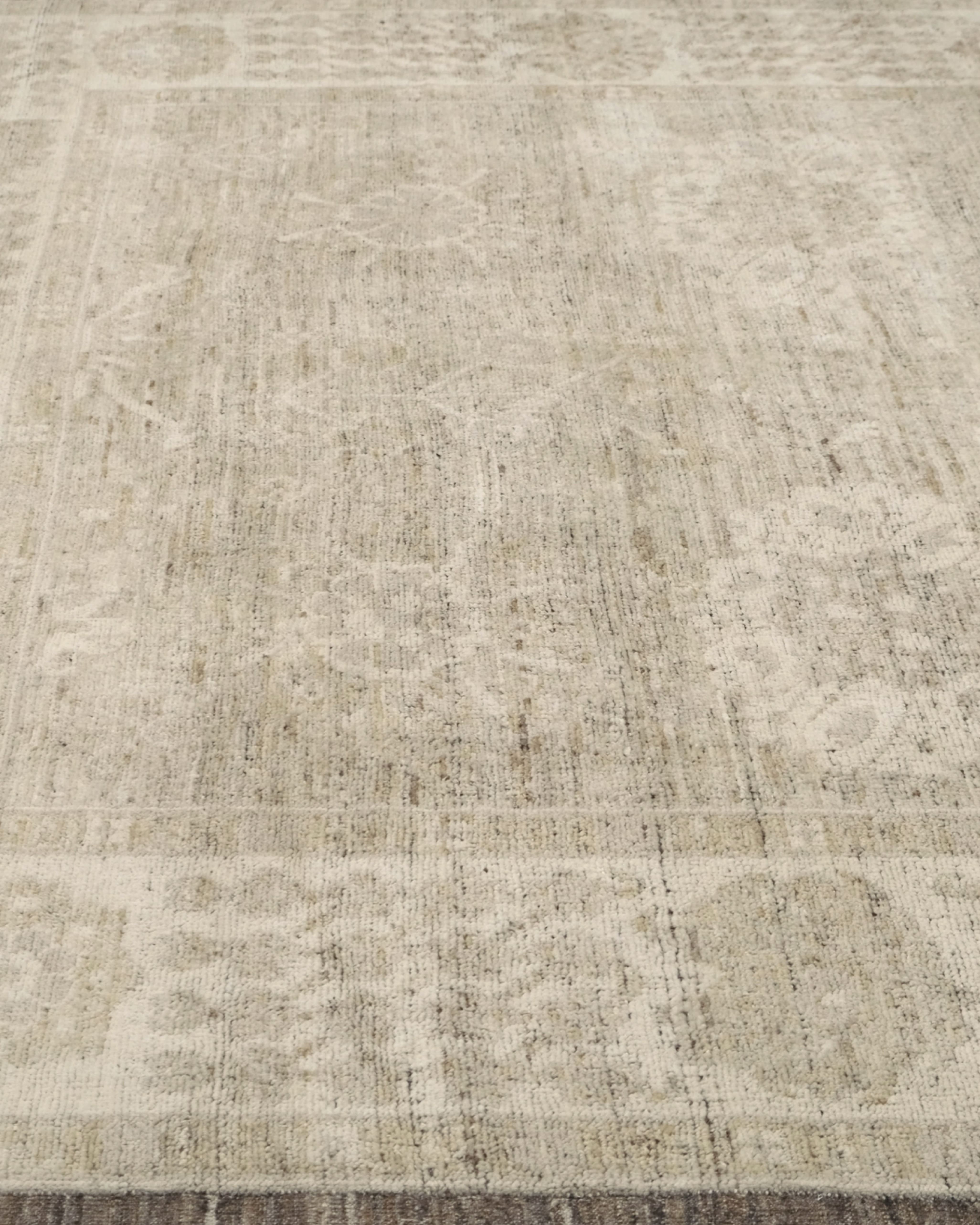 Hand-knotted from fine hand-spun wool, this rug features a quiet, tone-on-tone pattern on an ivory background washed with oatmeal beige and sand. Subtle floral/geometrics surface in pale taupe-greige, mushroom, stone gray & wheat Gold, The softly faded look and neutral palette make it an easy, elegant layer for contemporary or traditional interiors.