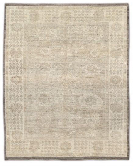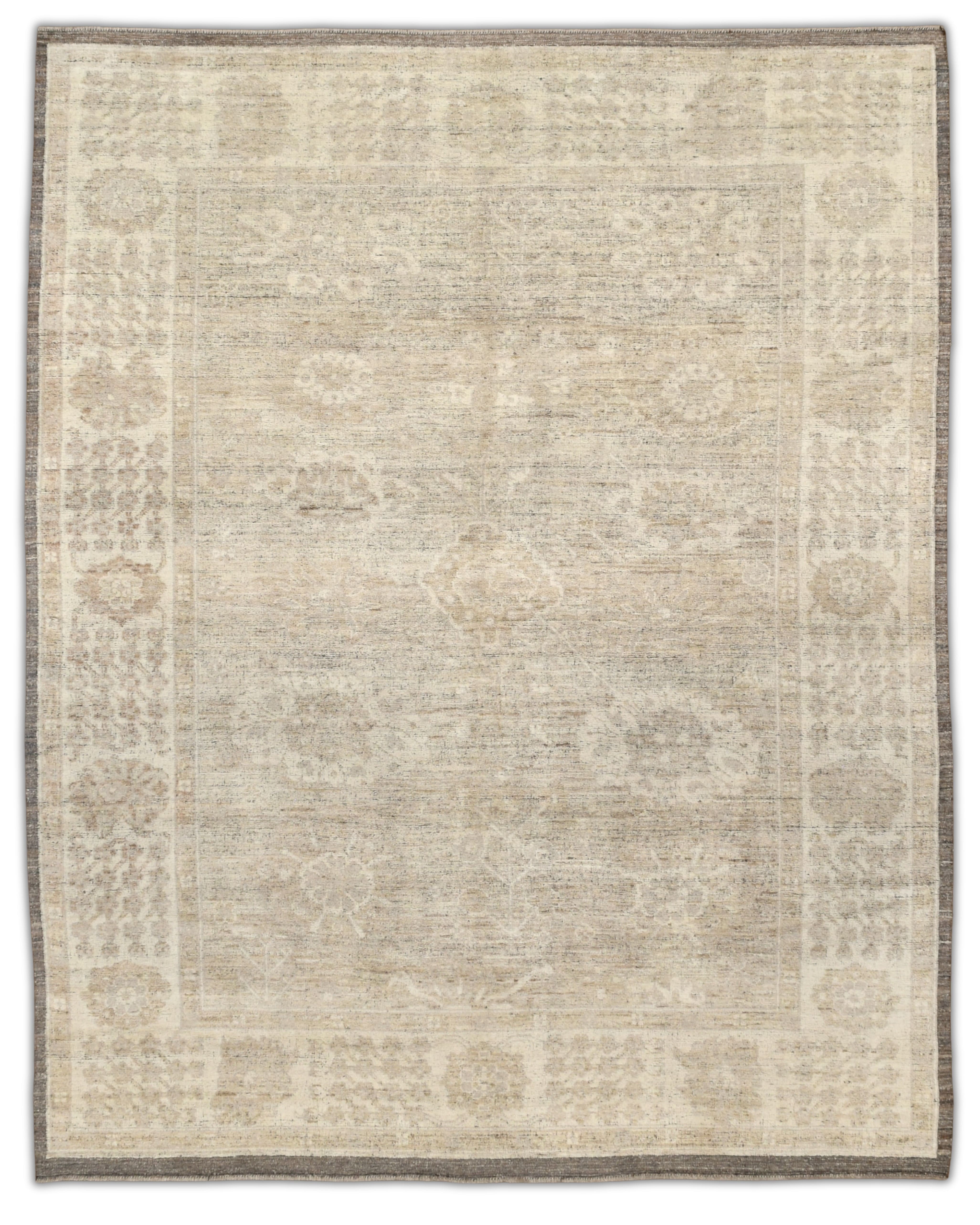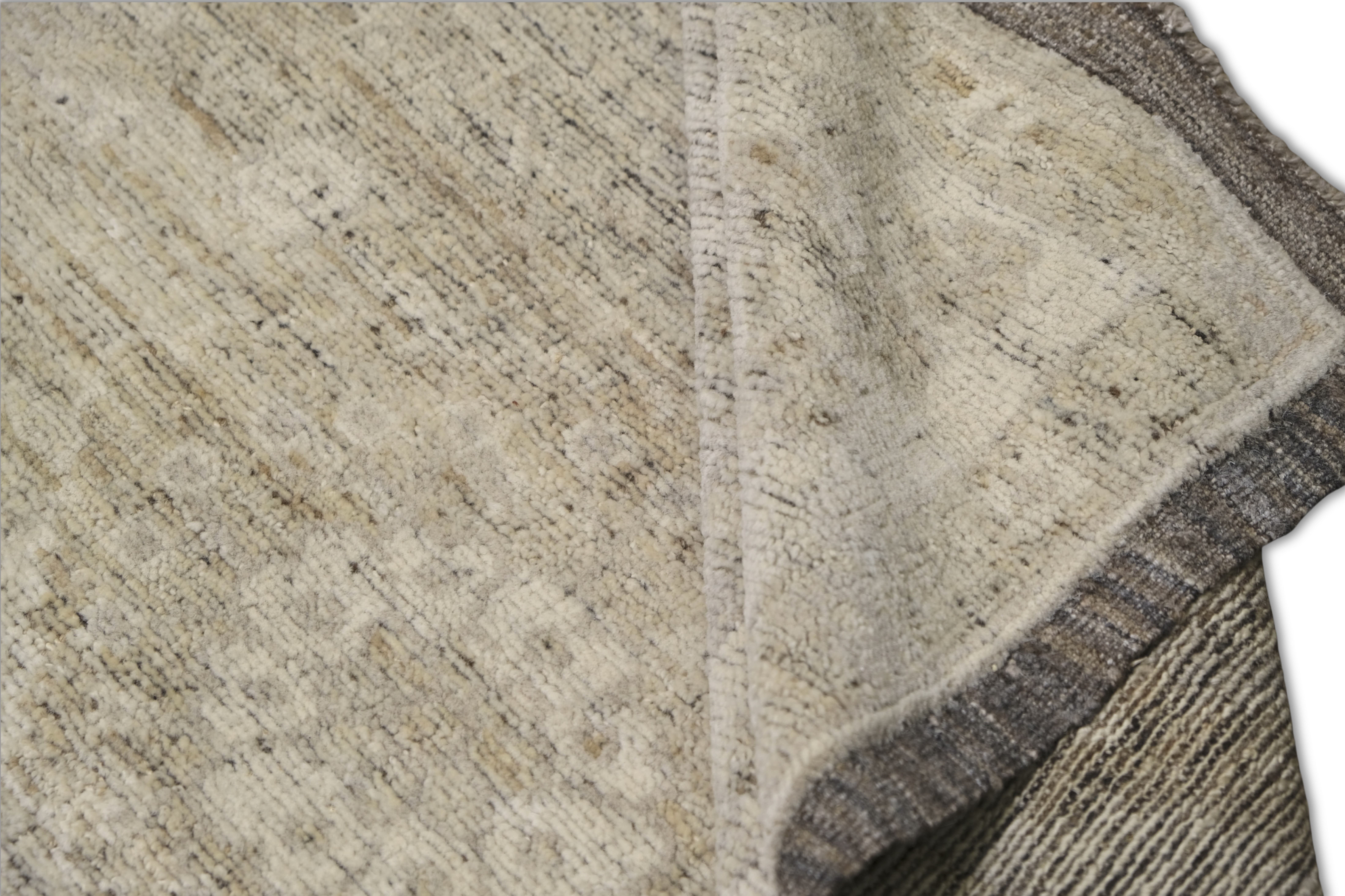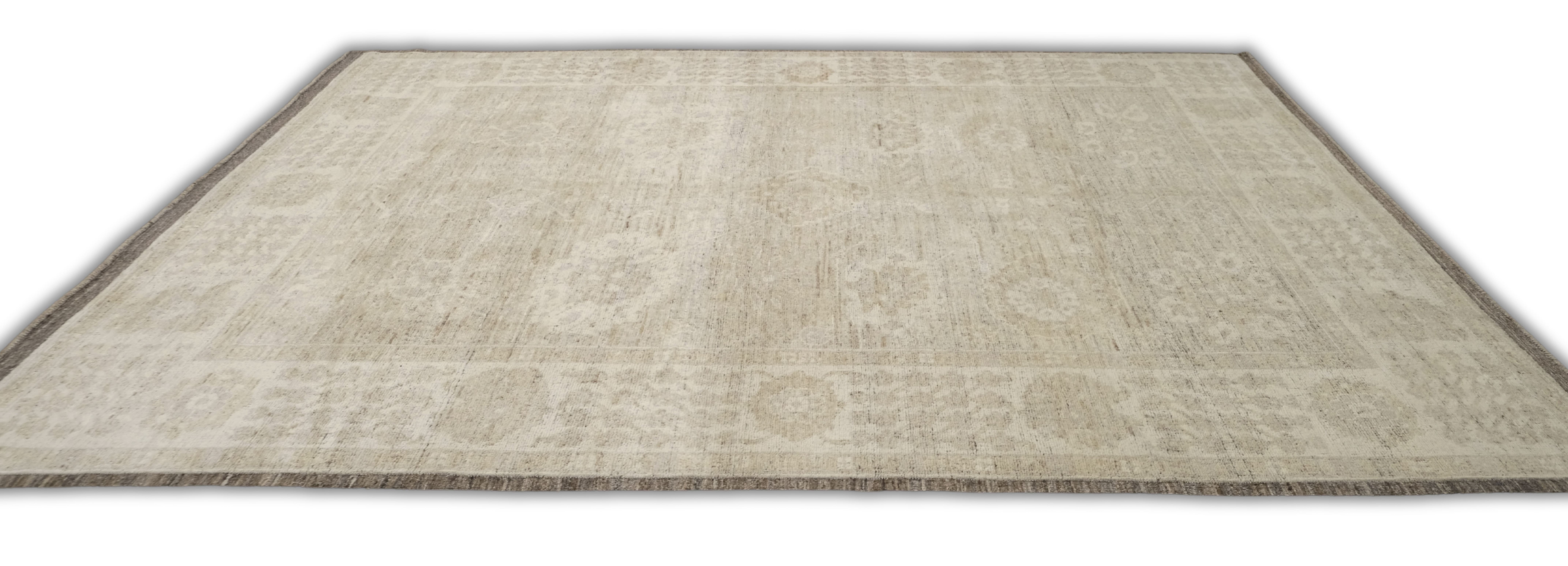 Hand-knotted from fine hand-spun wool, this rug features a quiet, tone-on-tone pattern on an ivory background washed with oatmeal beige and sand. Subtle floral/geometrics surface in pale taupe-greige, mushroom, stone gray & wheat Gold, The softly faded look and neutral palette make it an easy, elegant layer for contemporary or traditional interiors.
