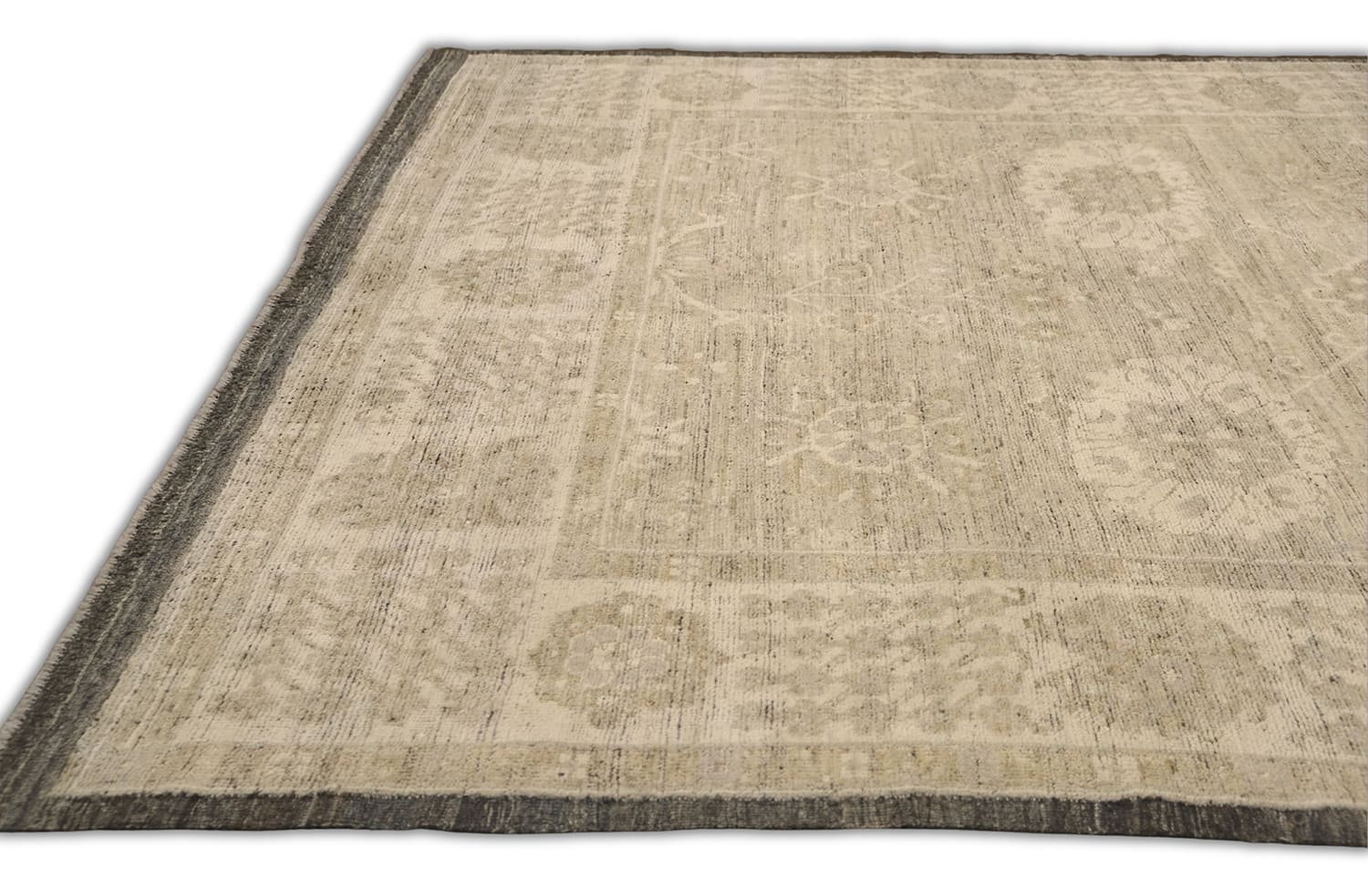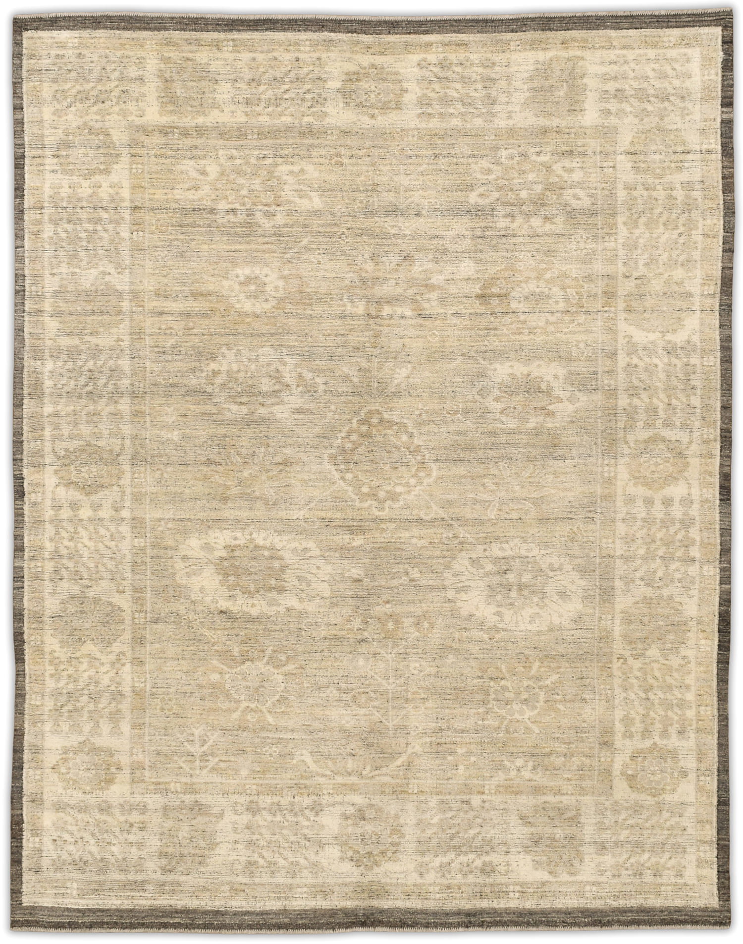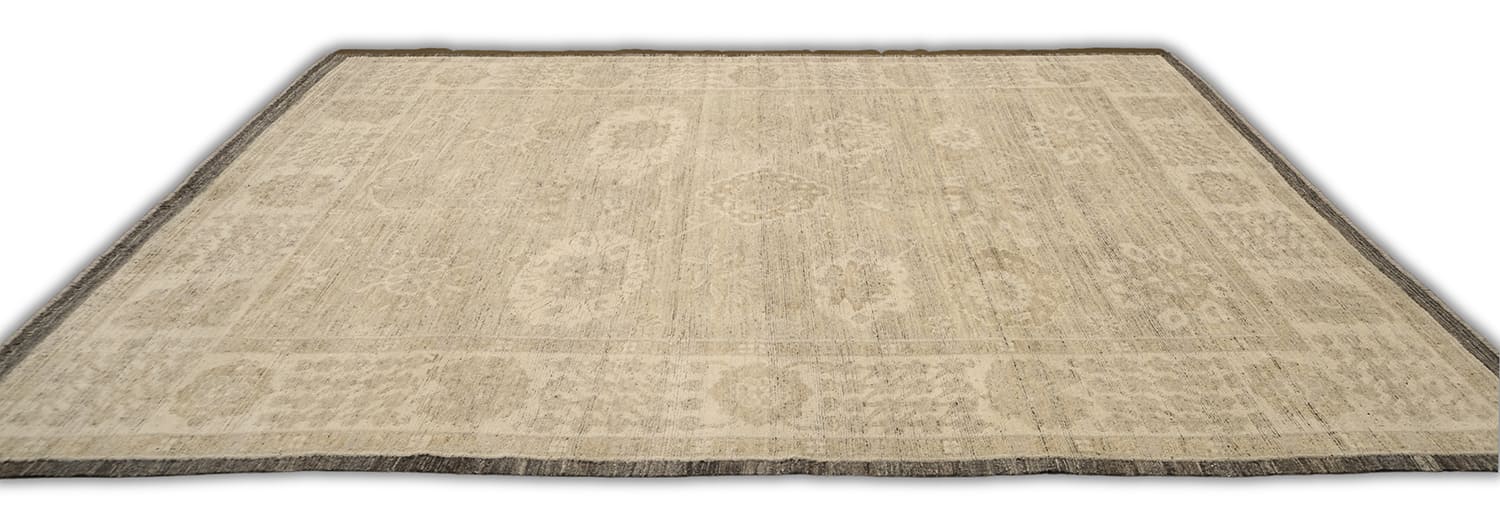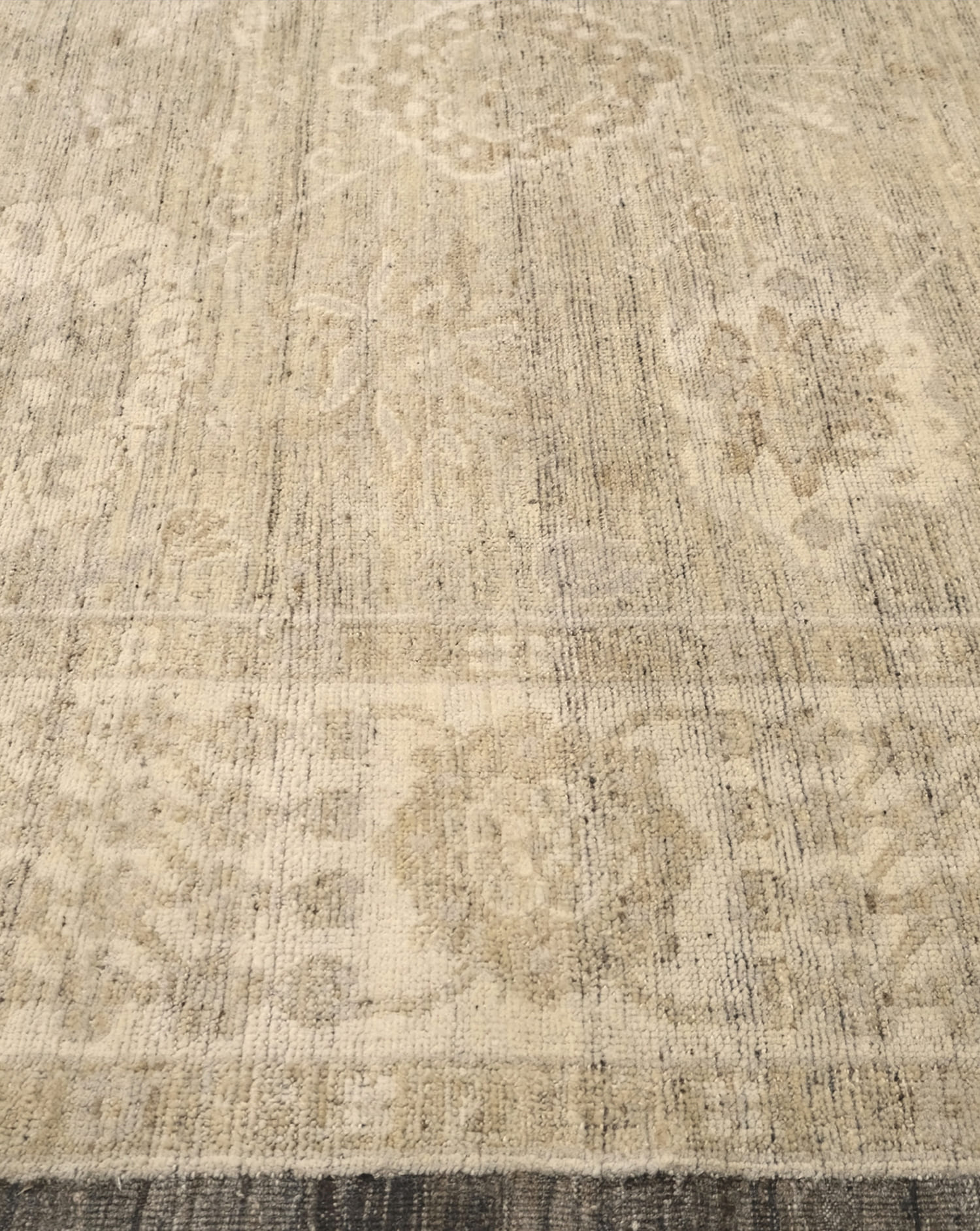 Hand-knotted from fine hand-spun wool, this Oushak-inspired design reveals softly faded floral medallions across a warm ivory/parchment ground. Layers of oatmeal and sand mingle with fawn-taupe, greige, and stone gray, finished with a heathered mushroom/pewter border that deepens toward charcoal at the edge. The tone-on-tone palette and gentle abrash create a calm, textural neutral—an easy, elevated layer for both modern and classic interiors.