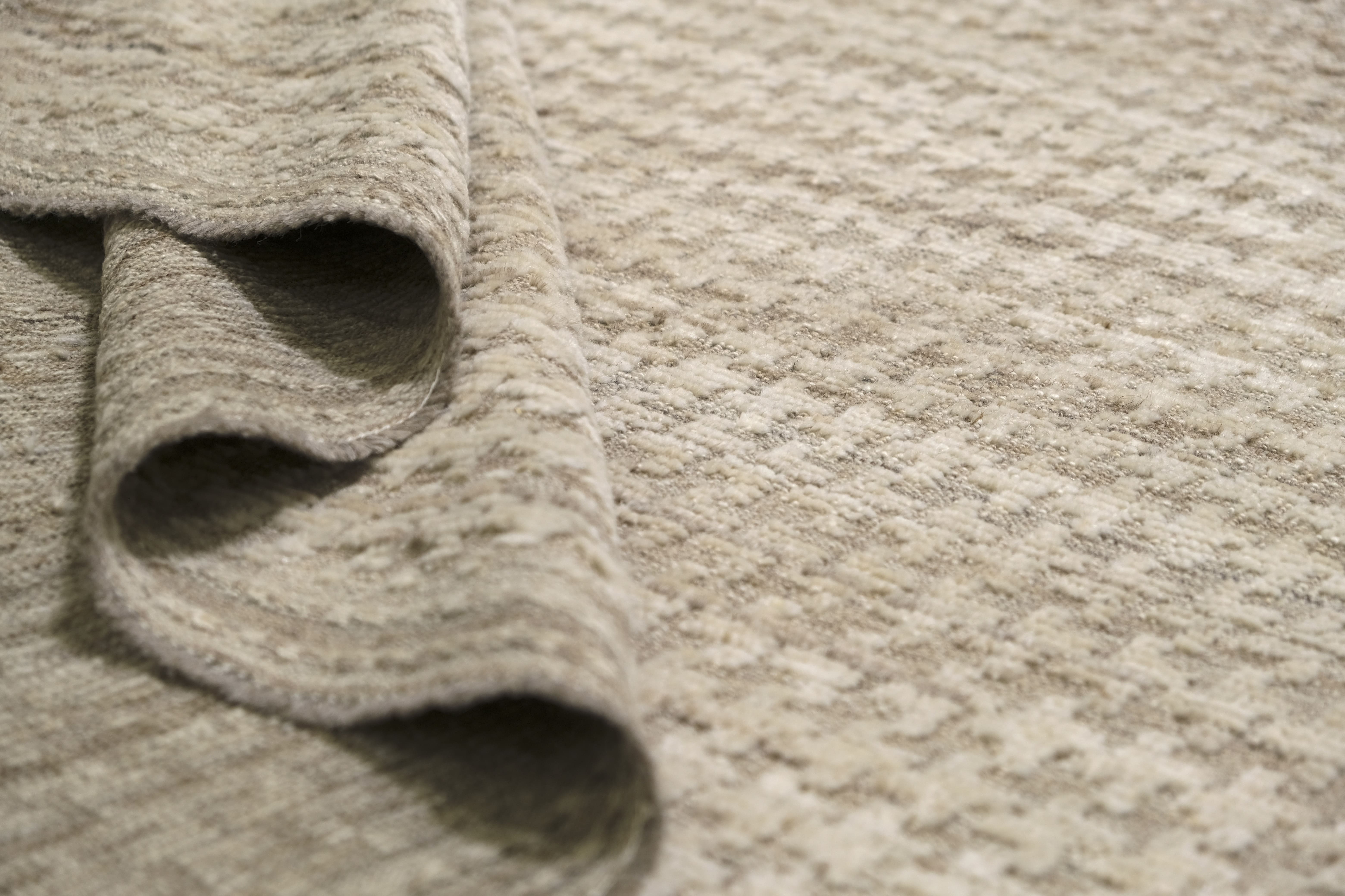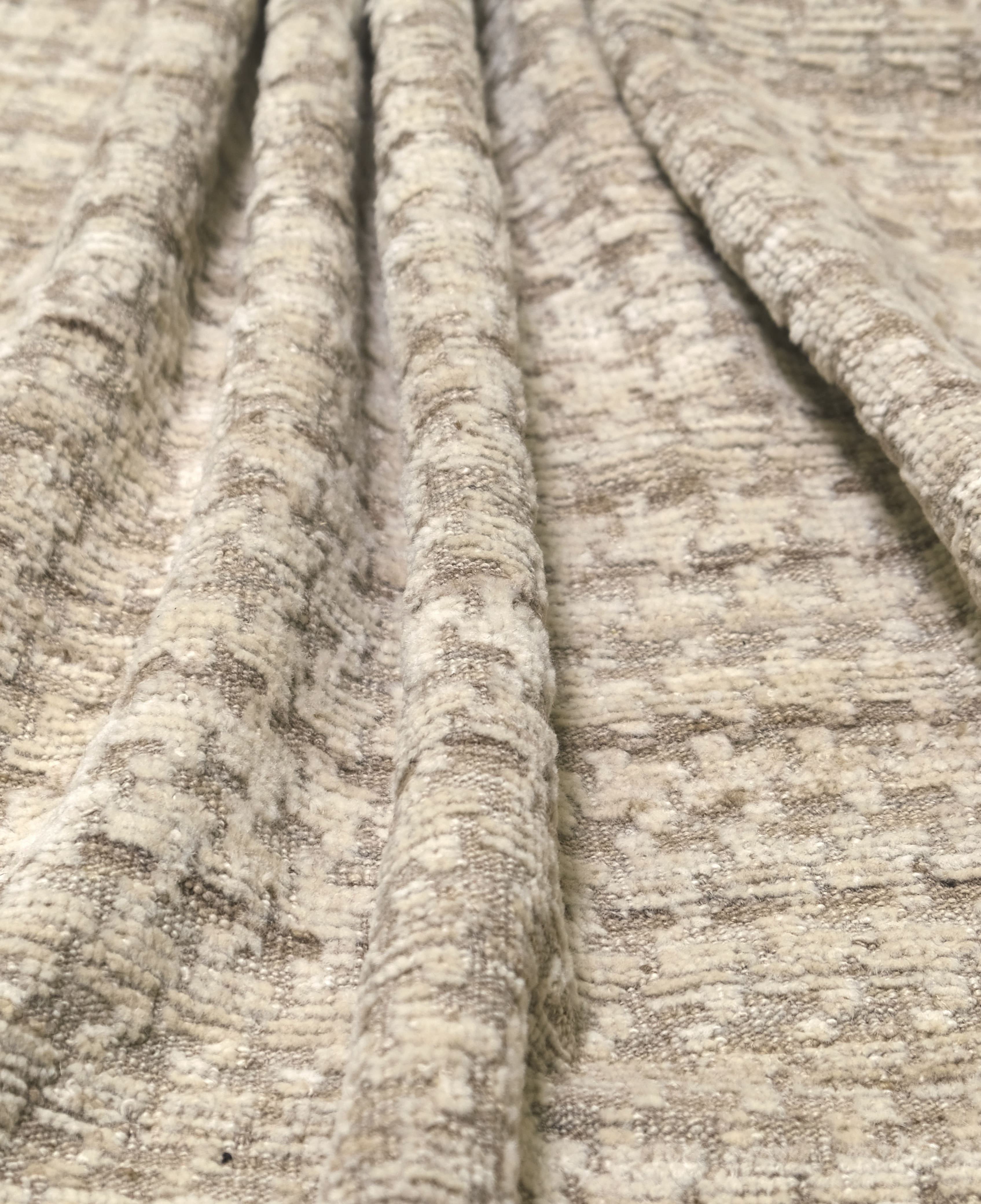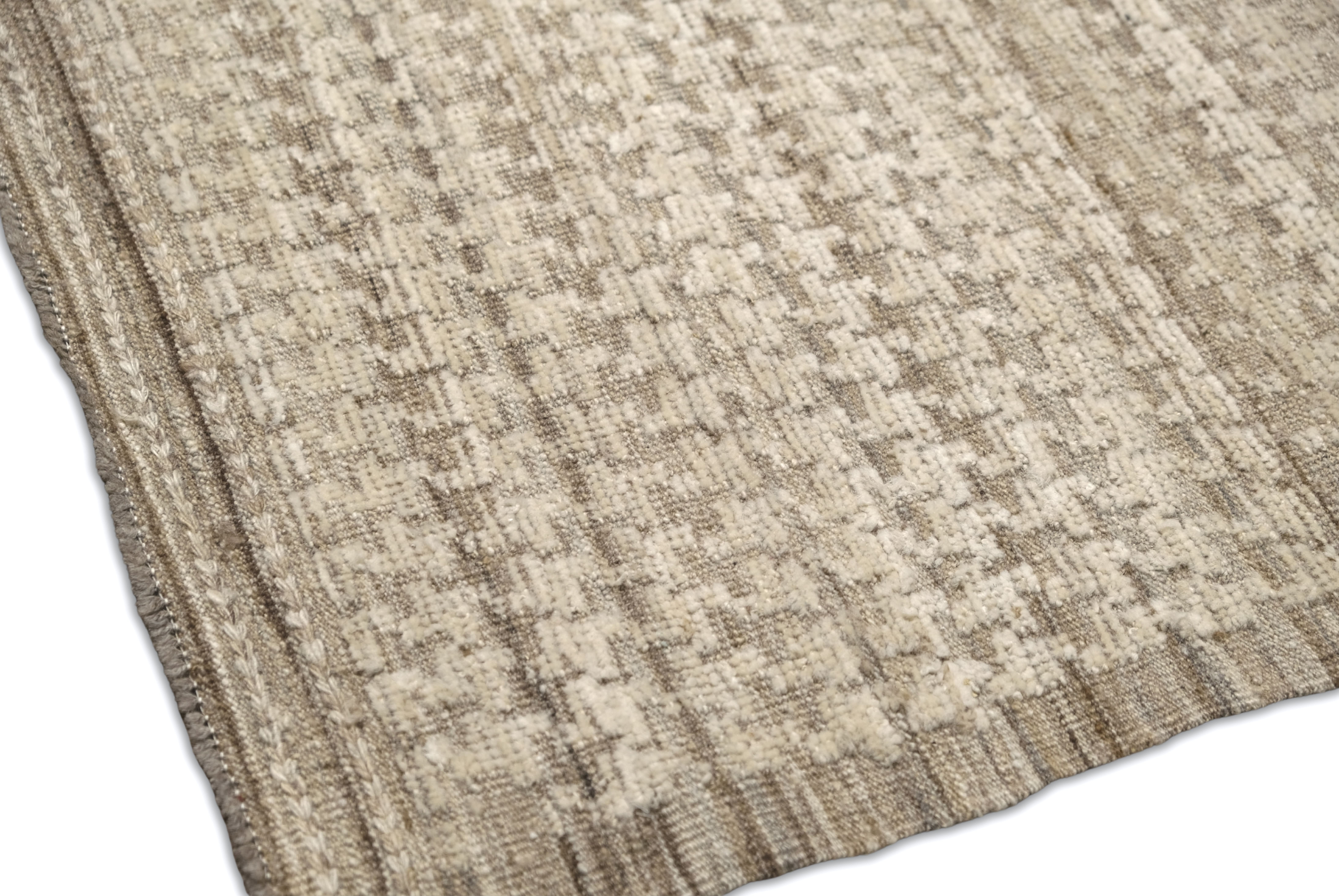 Hand-knotted from fine hand-spun wool, this textural rug features a calm neutral palette—ivory and cream layered with oatmeal, sand, warm taupe-greige, and hints of stone gray—finishes with a heathered mushroom edge, creating an easy, elevated foundation for any room