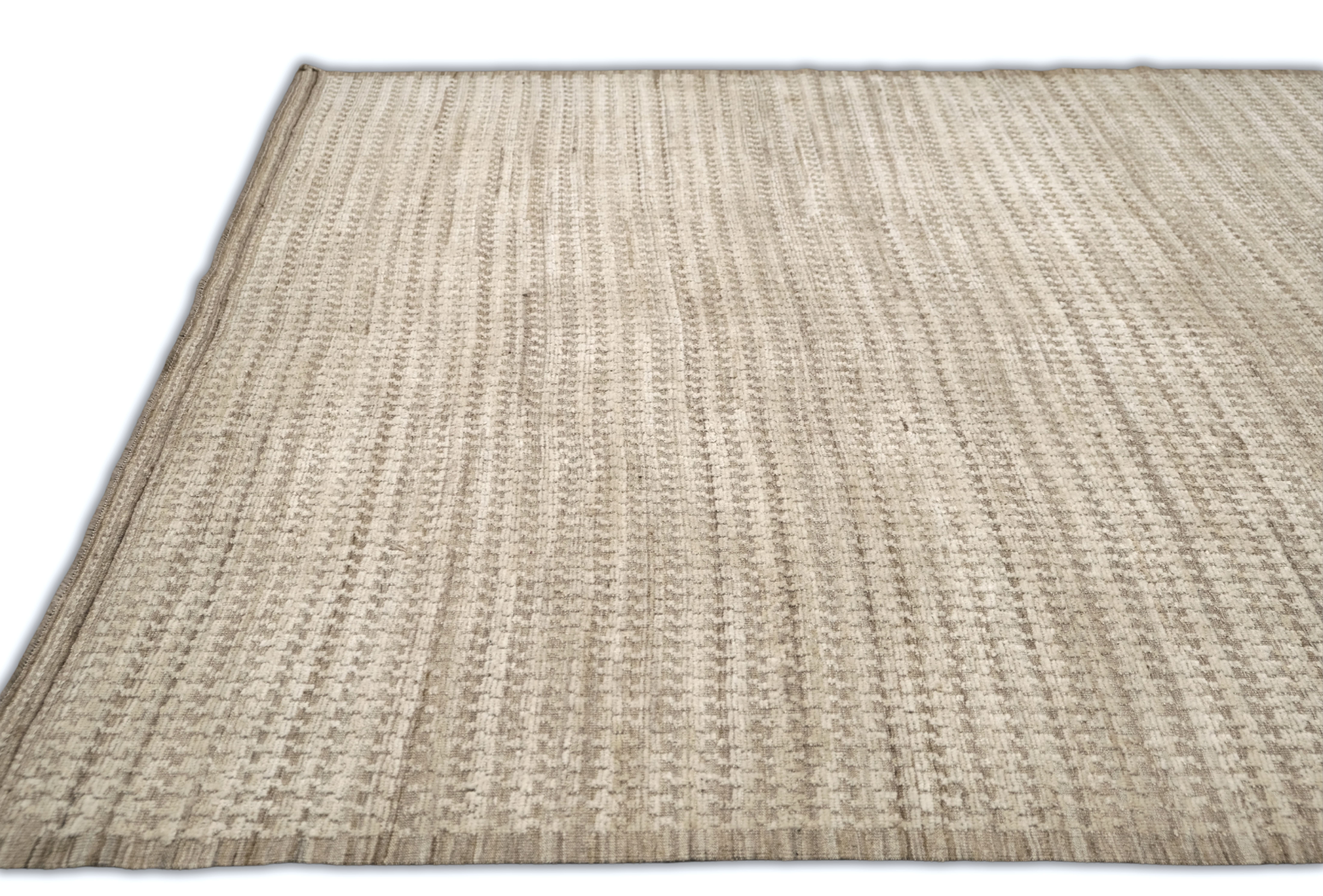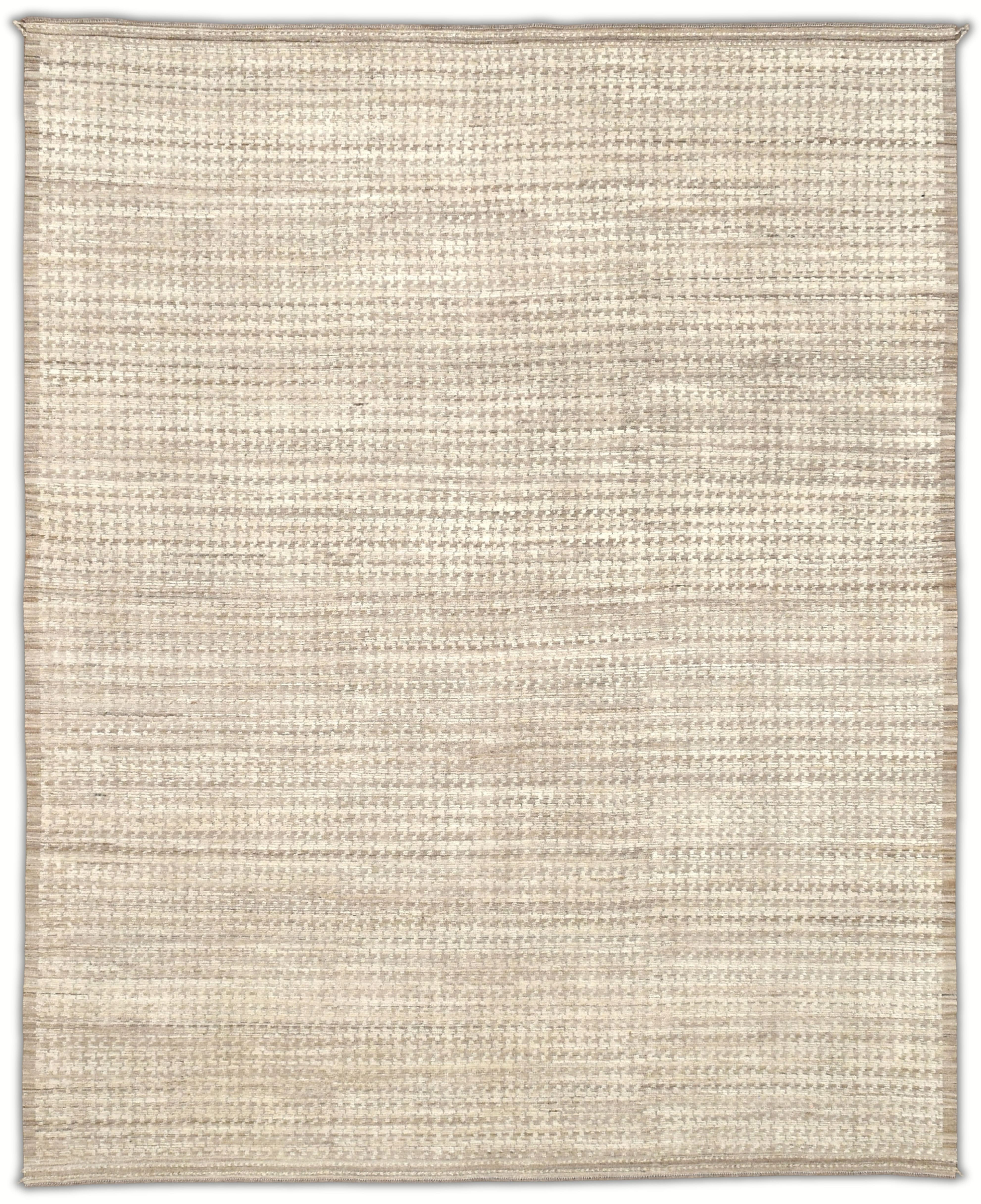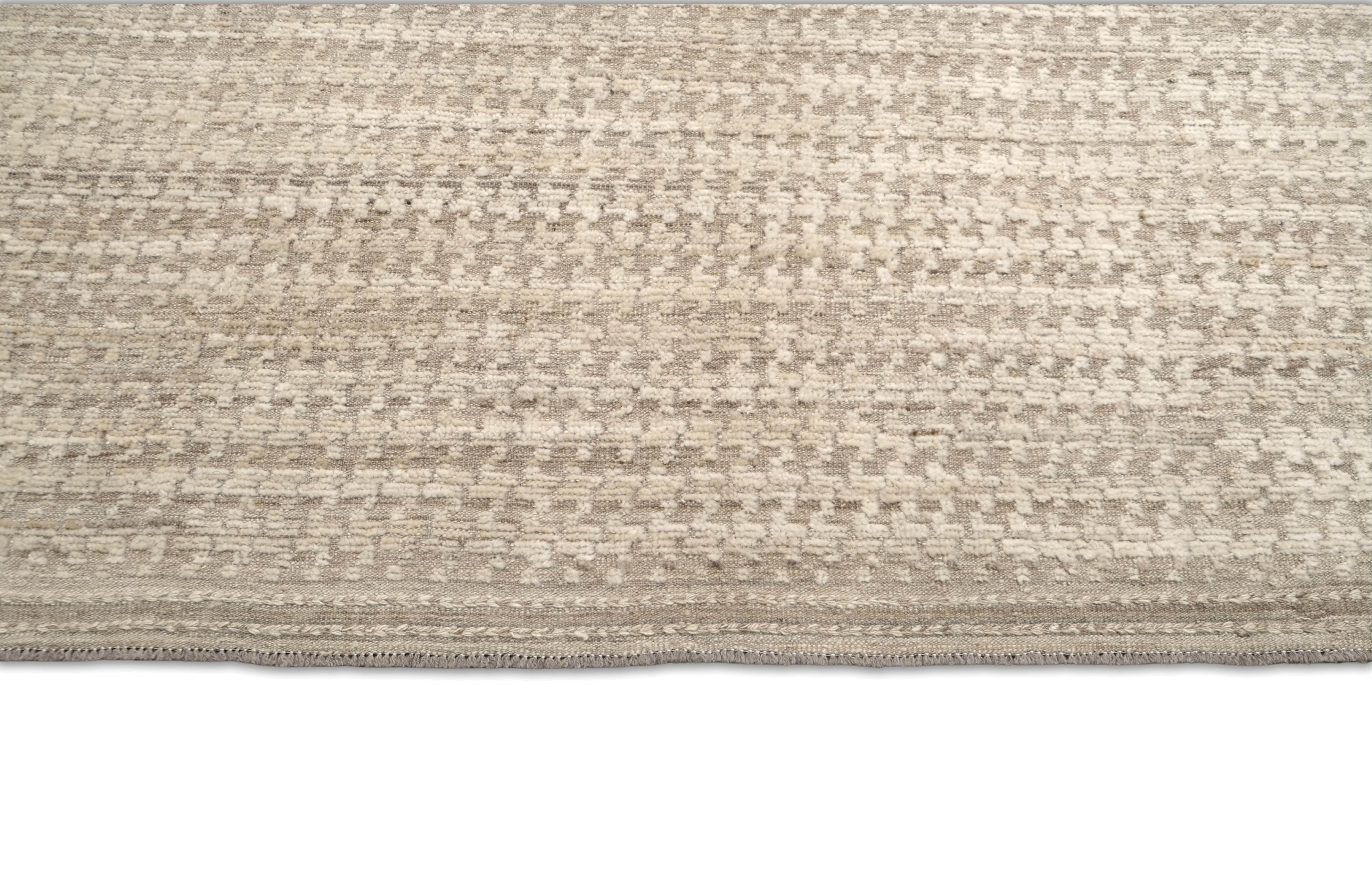 Hand-knotted from fine hand-spun wool, this textural rug features a calm neutral palette—ivory and cream layered with oatmeal, sand, warm taupe-greige, and hints of stone gray—finishes with a heathered mushroom edge, creating an easy, elevated foundation for any room