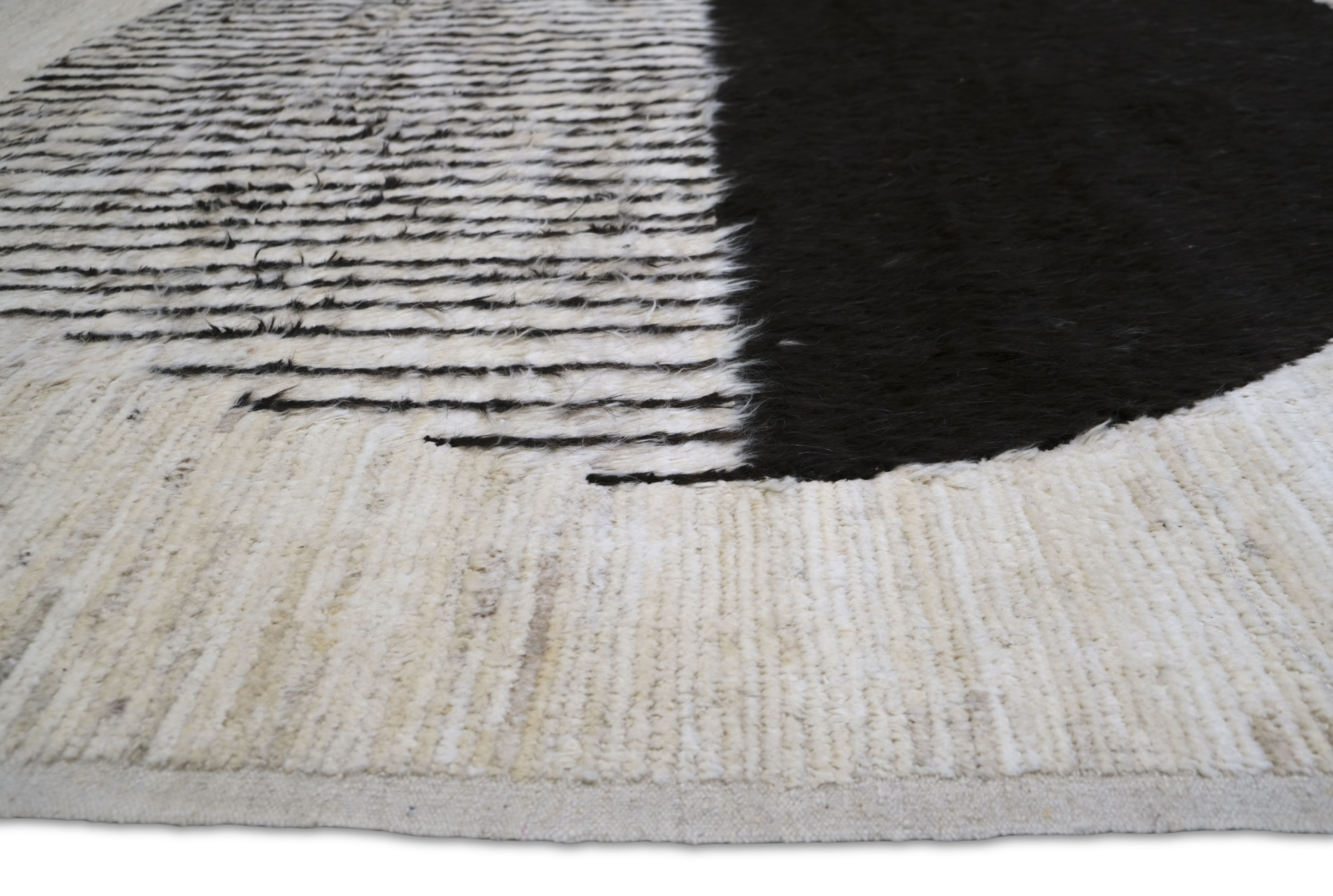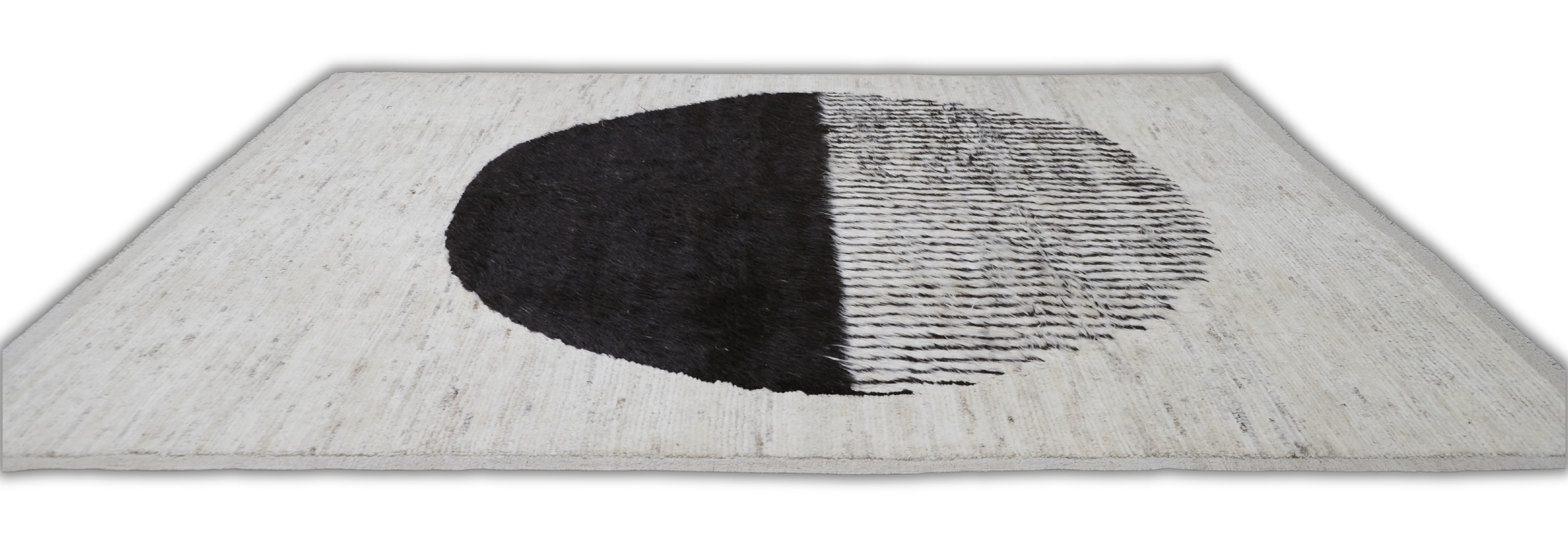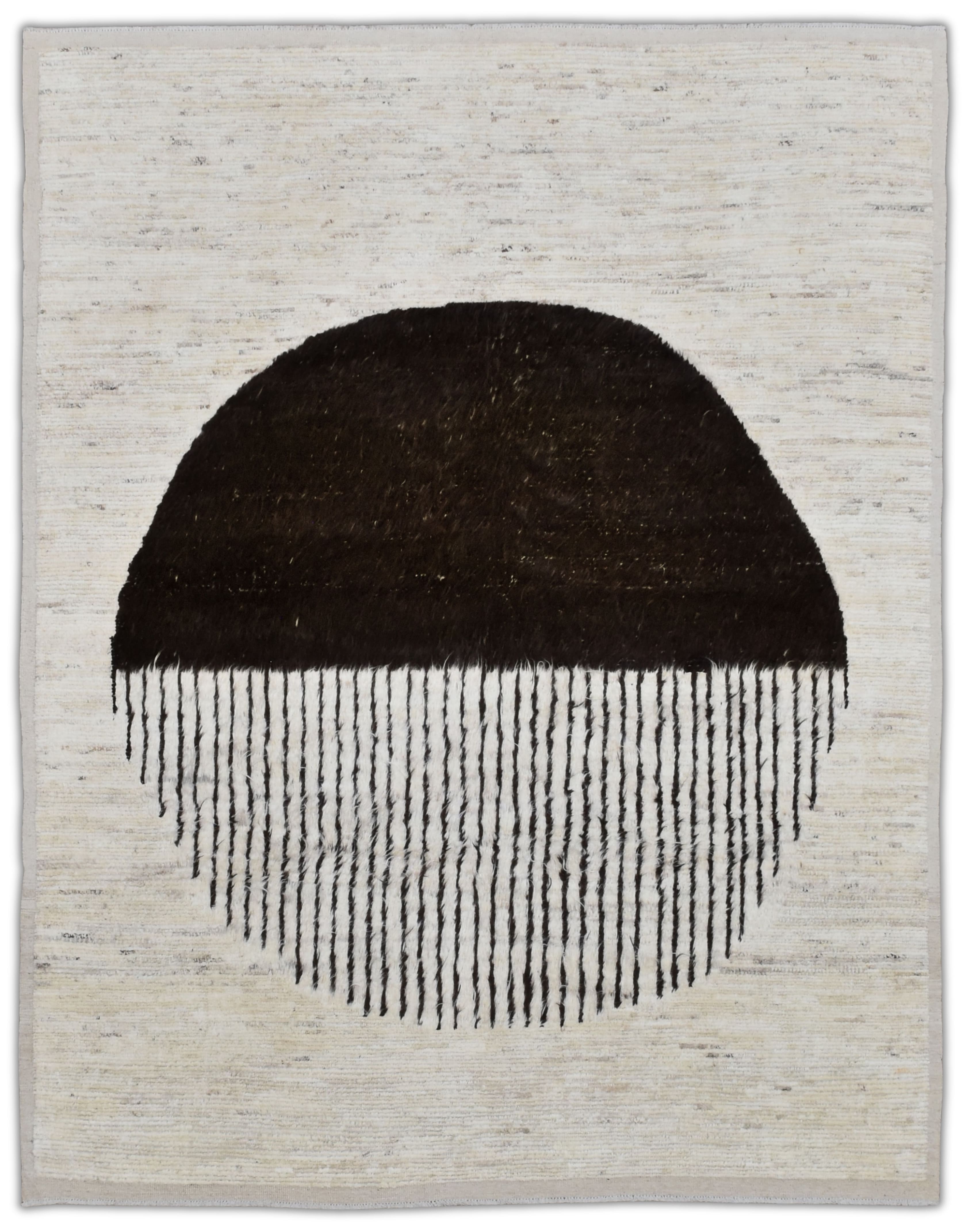 Hand-knotted from fine hand-spun wool, this long pile statement piece features a bold espresso half-moon that dissolves into slender charcoal drip lines over a warm ivory/cream field with subtle oatmeal and stone flecking. The graphic motif and neutral palette create striking depth while staying versatile—an artful anchor for many spaces.