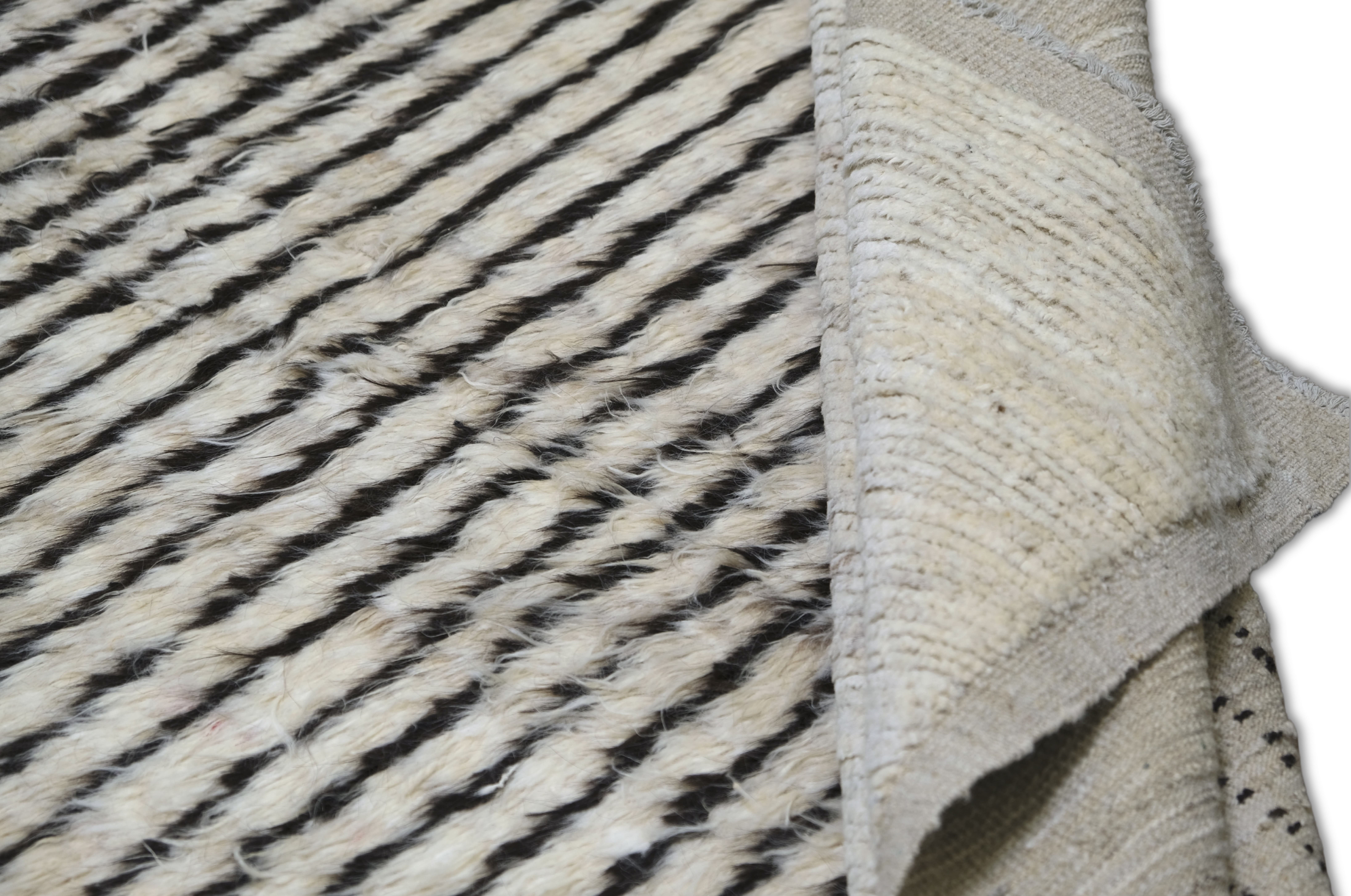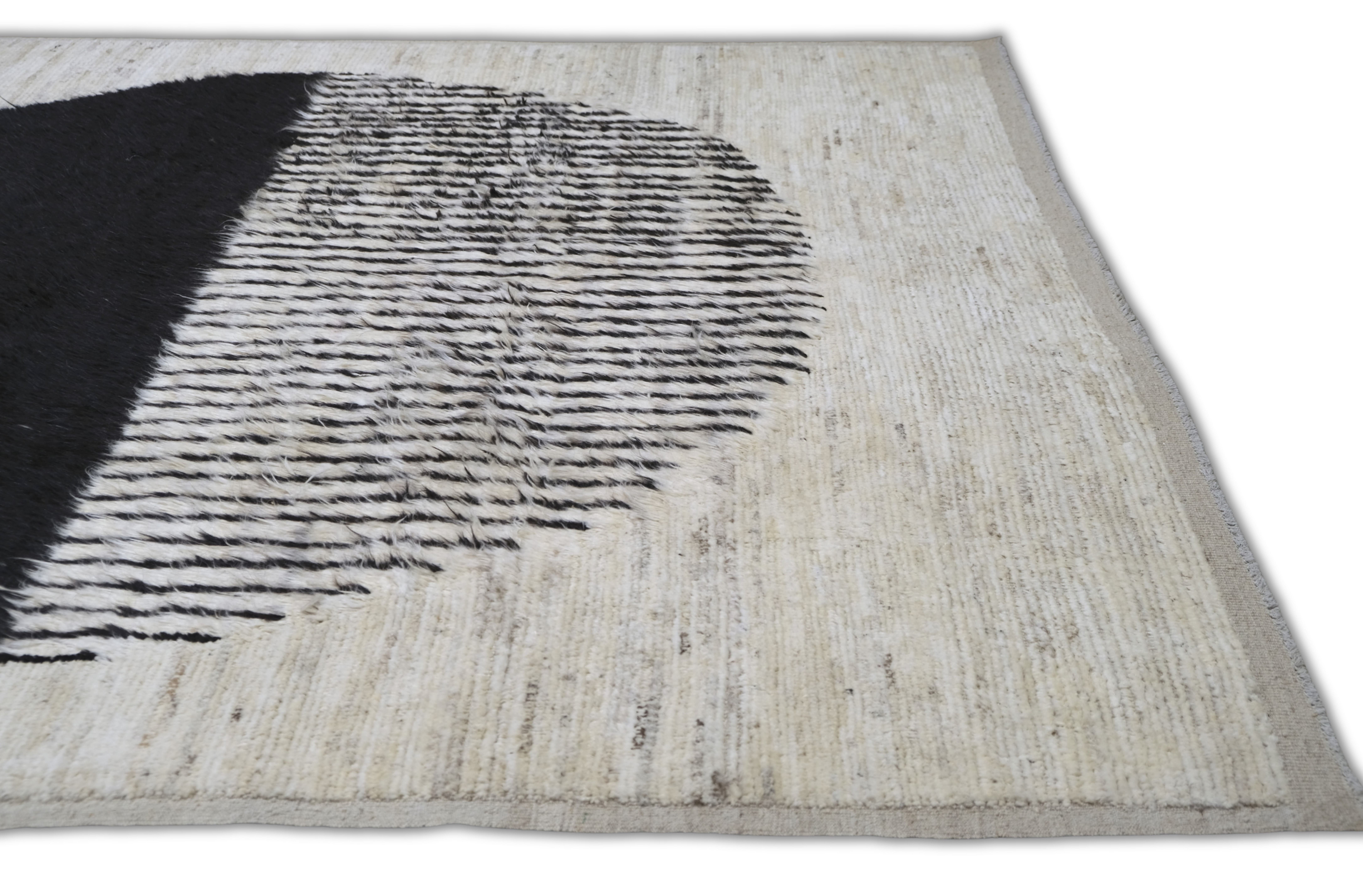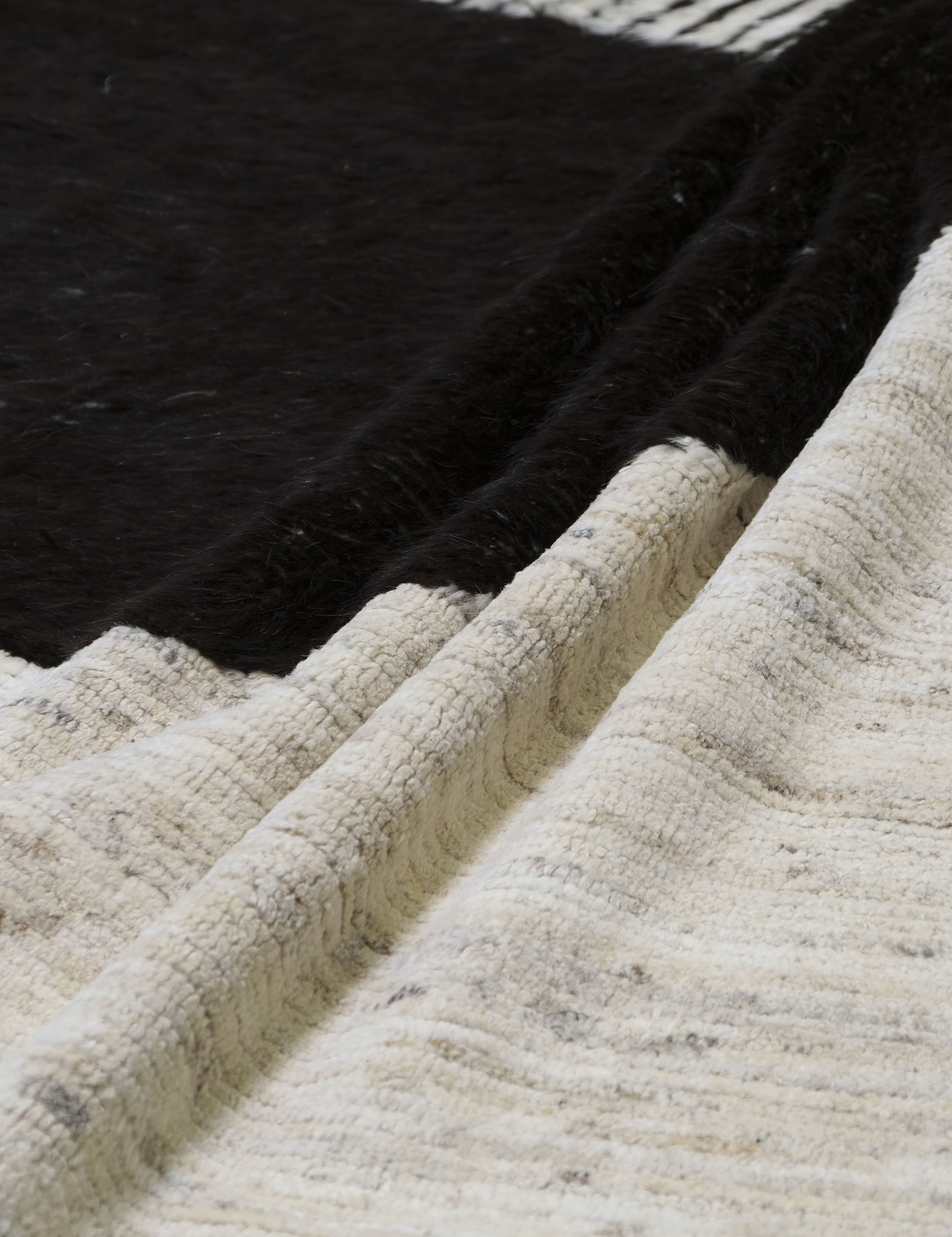 Hand-knotted from fine hand-spun wool, this long pile statement piece features a bold espresso half-moon that dissolves into slender charcoal drip lines over a warm ivory/cream field with subtle oatmeal and stone flecking. The graphic motif and neutral palette create striking depth while staying versatile—an artful anchor for many spaces.