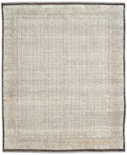 Soft, heathered, Hand-knotted, hand-spun wool pile rug in a subtle palette of ivory, beige, taupe, warm gold and stone grey with subtle brown & blue green accents. Its muted floral and geometric pattern offers timeless elegance, ideal for both contemporary and traditional spaces.