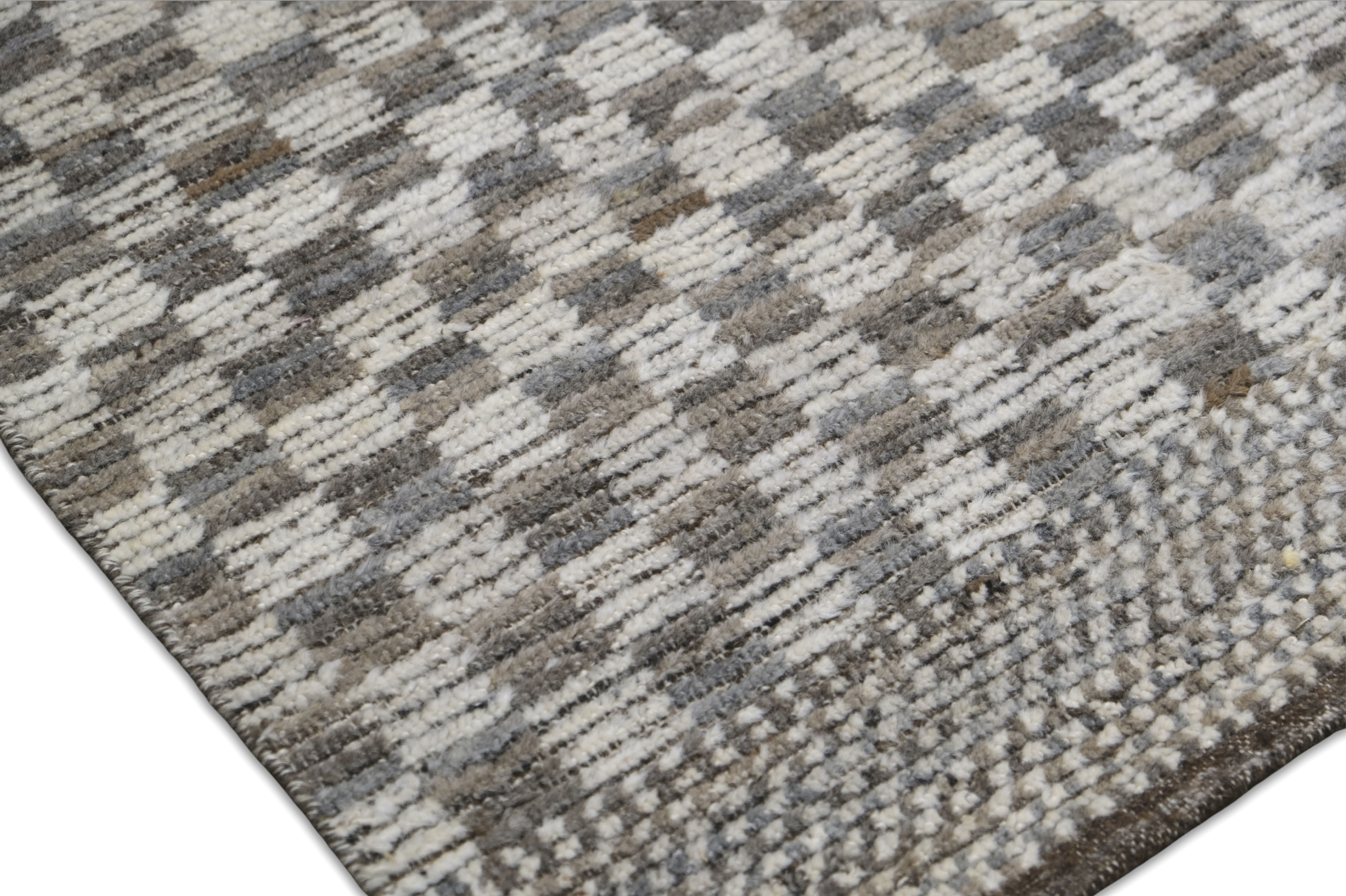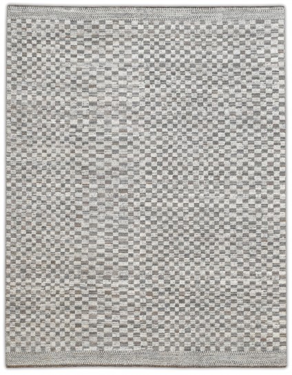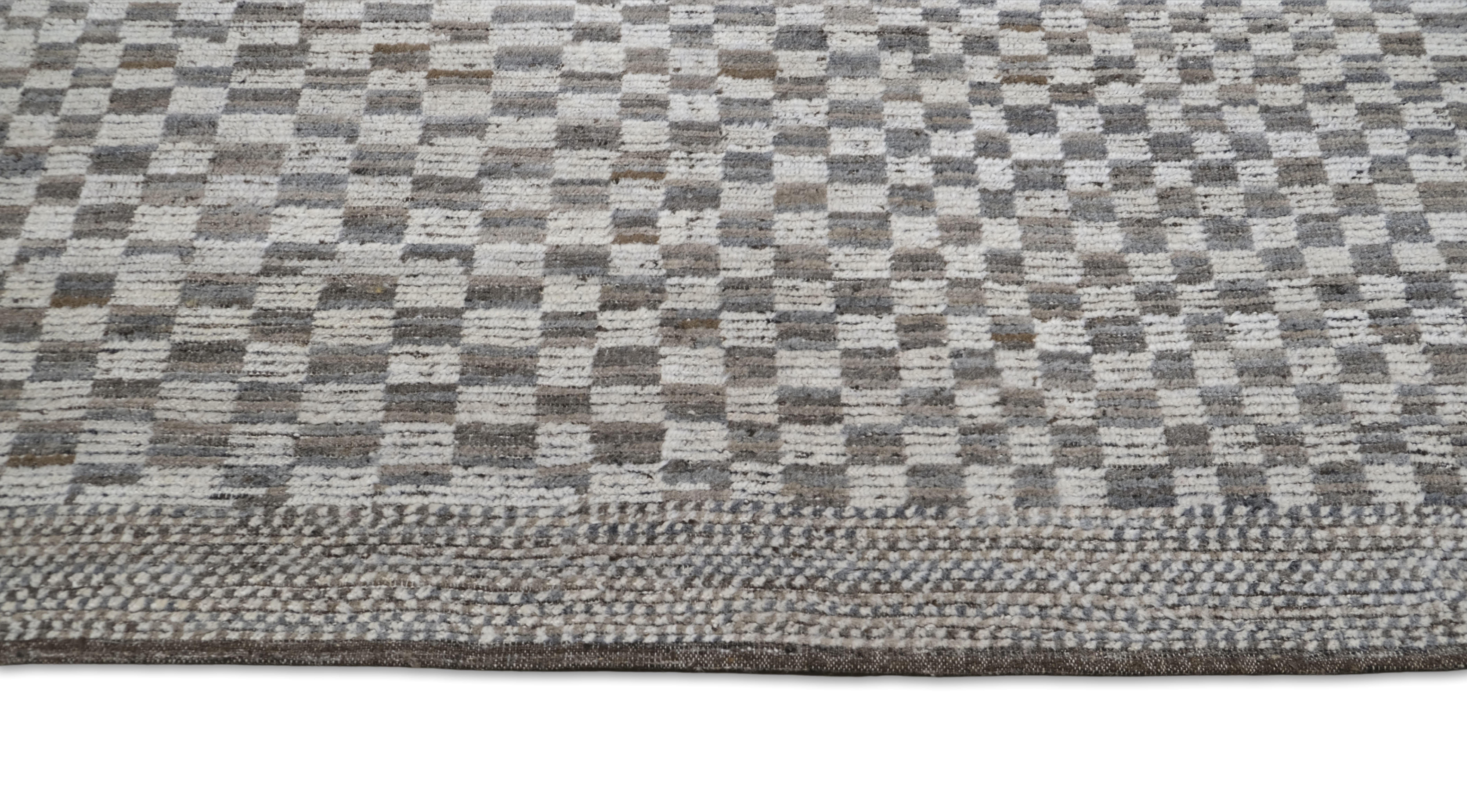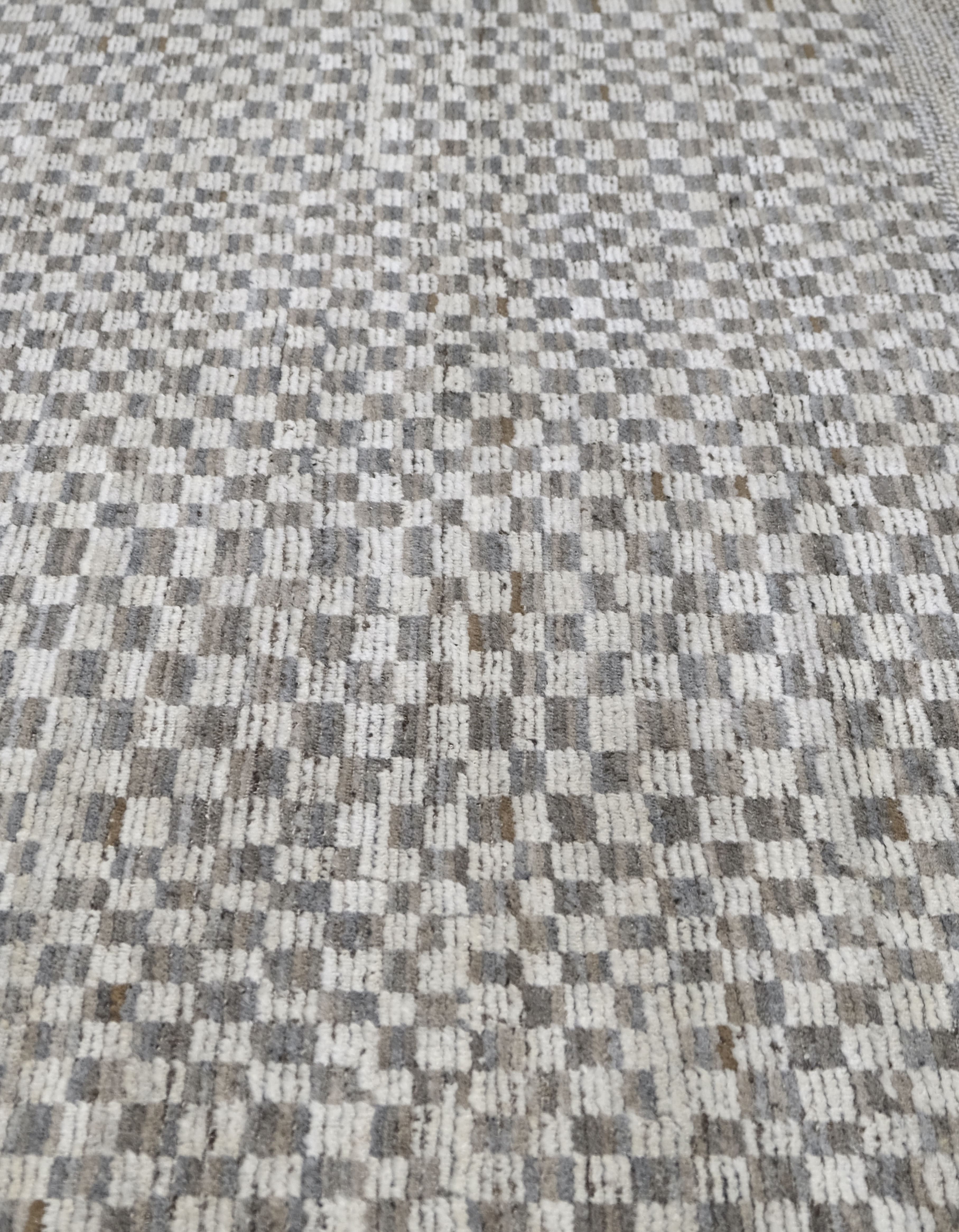 Hand-knotted, textured hand-spun wool pile, A refined small-scale check creates subtle movement. The palette blends ivory, browns, silver-gray, and taupe/greige with soft heathering for a calm neutral that offers an easy elevated foundation for many interiors.