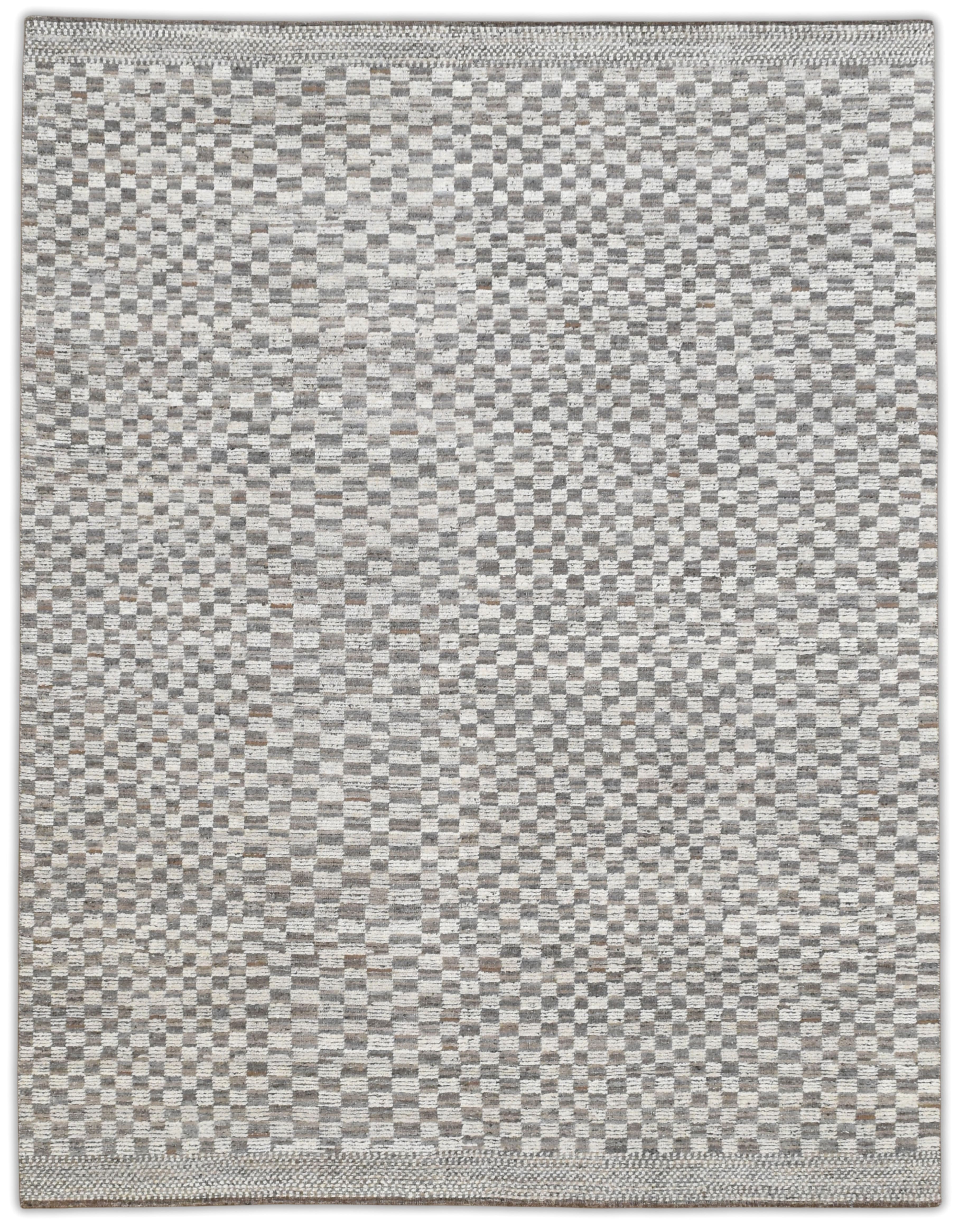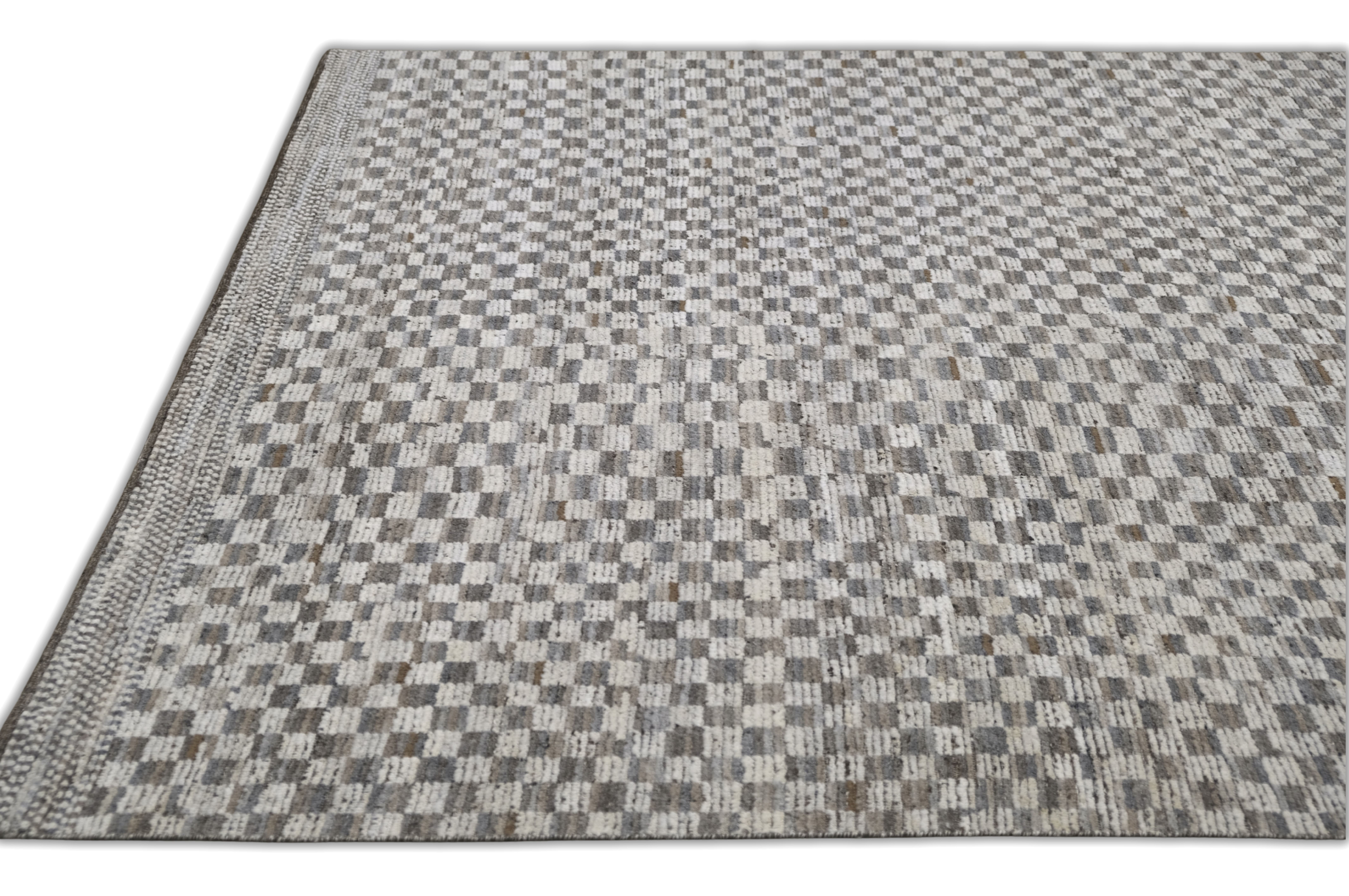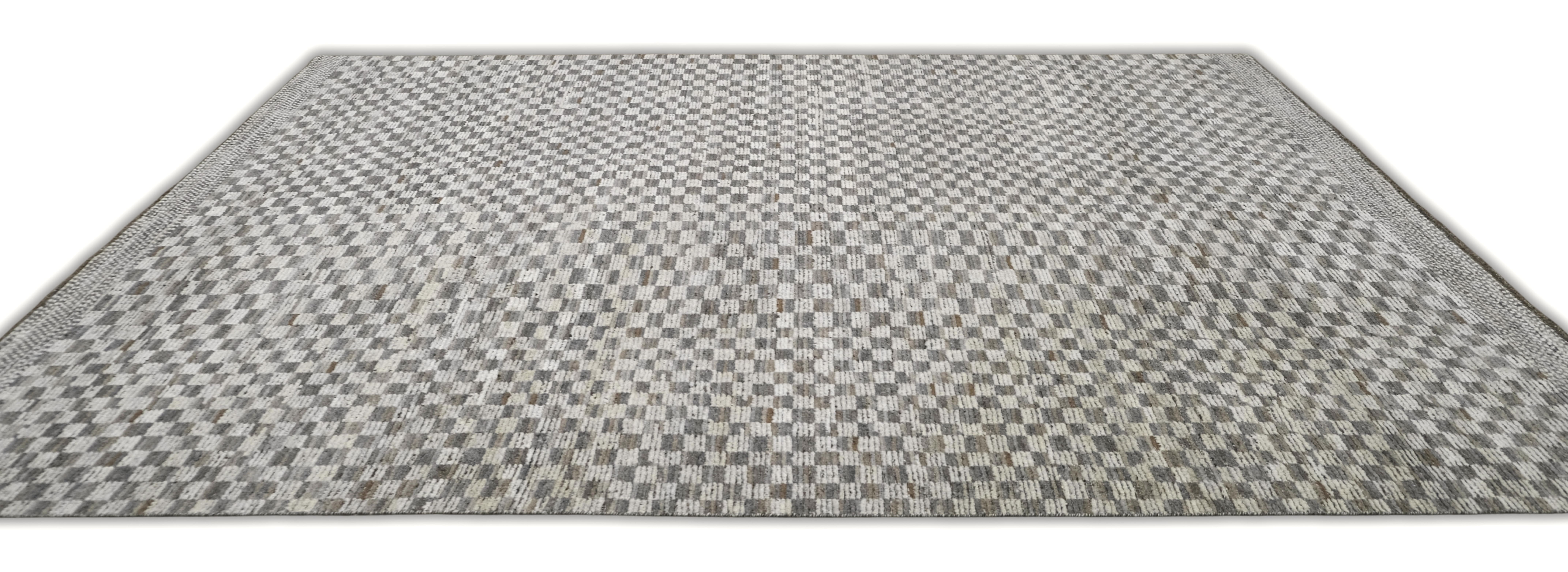 Hand-knotted, textured hand-spun wool pile, A refined small-scale check creates subtle movement. The palette blends ivory, browns, silver-gray, and taupe/greige with soft heathering for a calm neutral that offers an easy elevated foundation for many interiors.