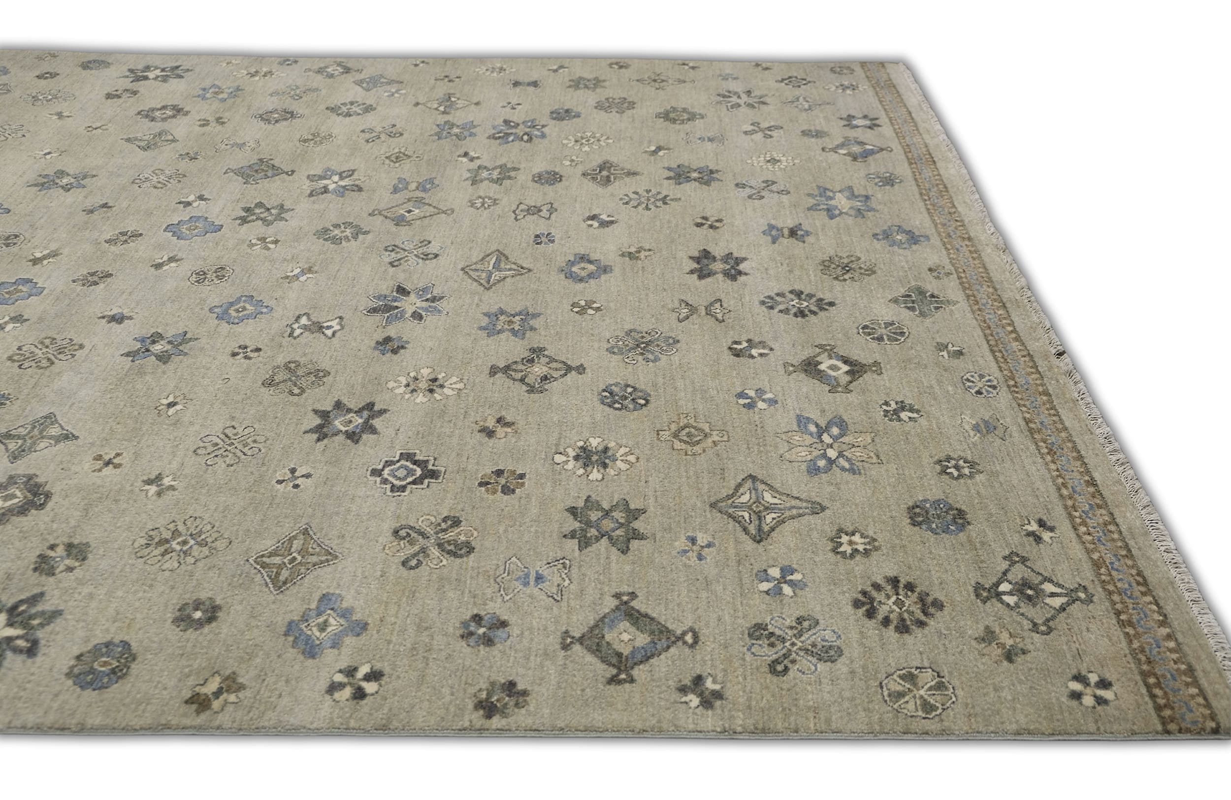 Hand-Knotted, Hand-Spun Wool pile rug in a warm Greenish beige background. Motifs layer slate and denim blues with charcoal, green , ivory and calm neutrals—an elegant, versatile design for modern or classic rooms.