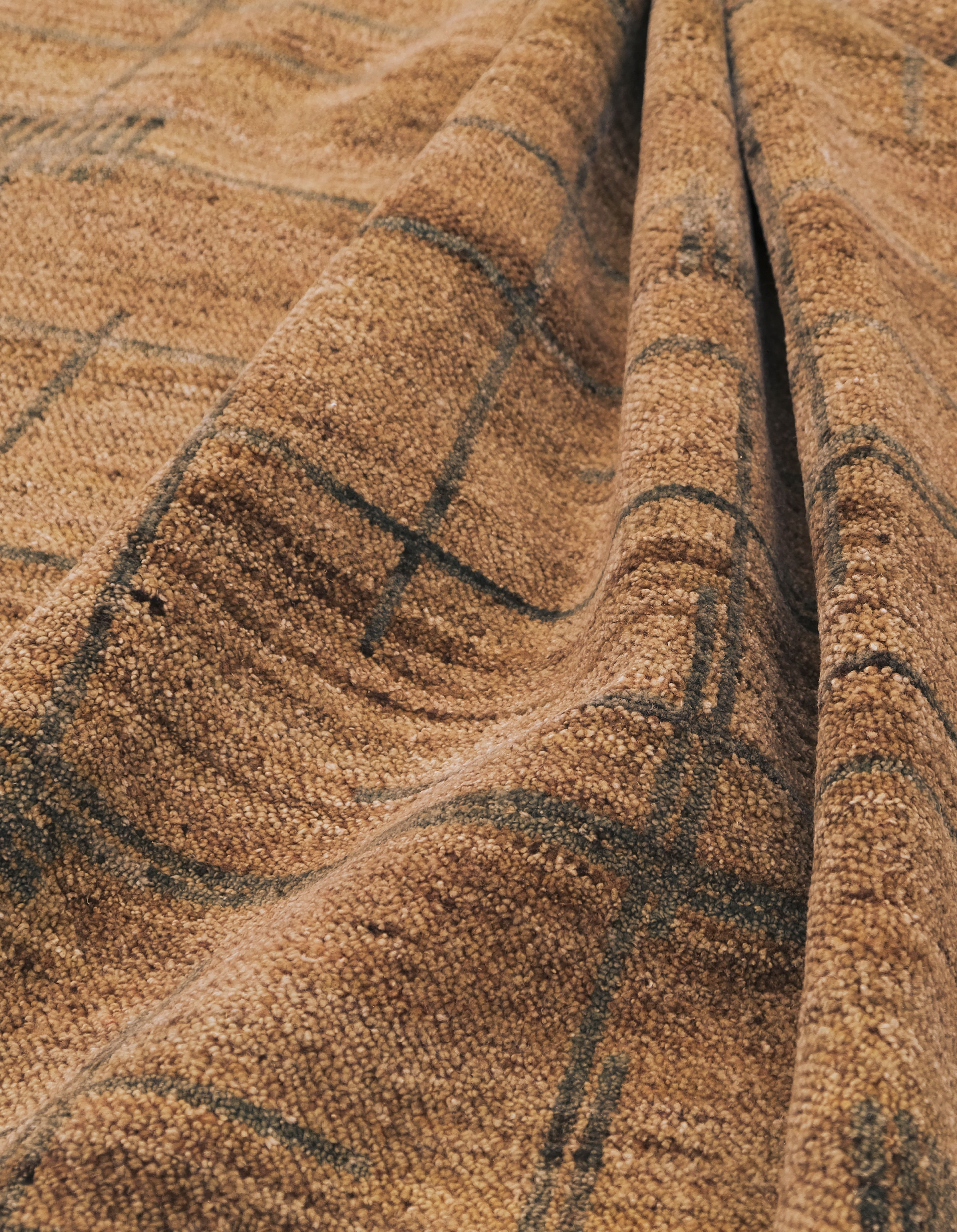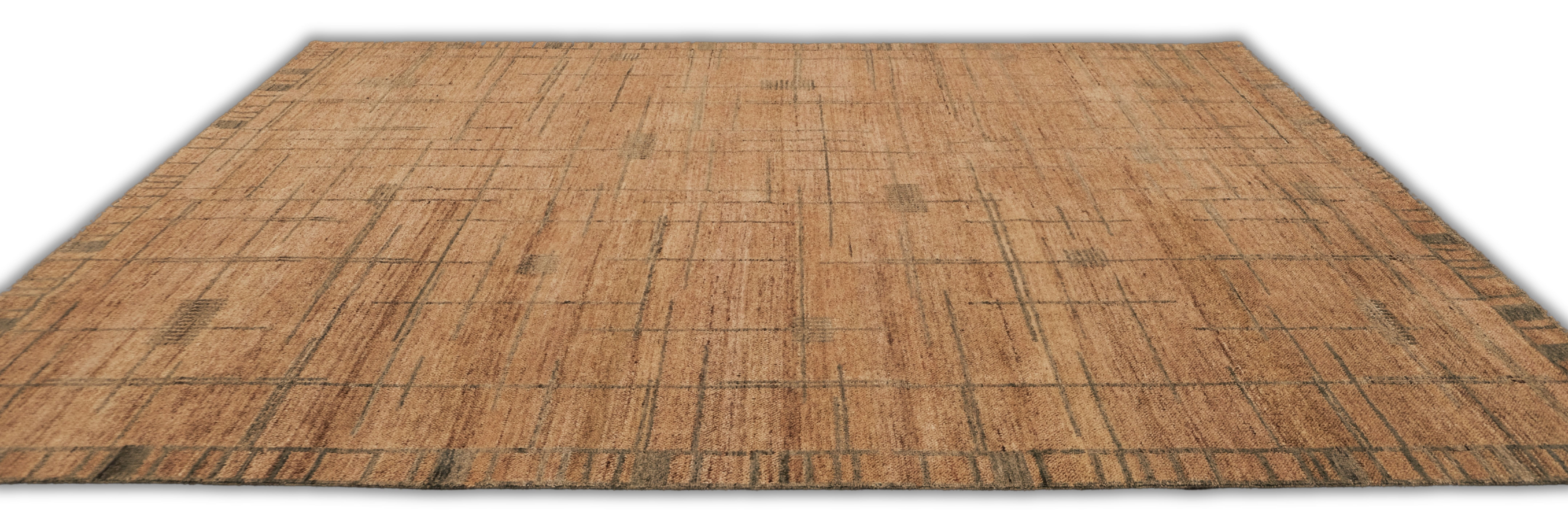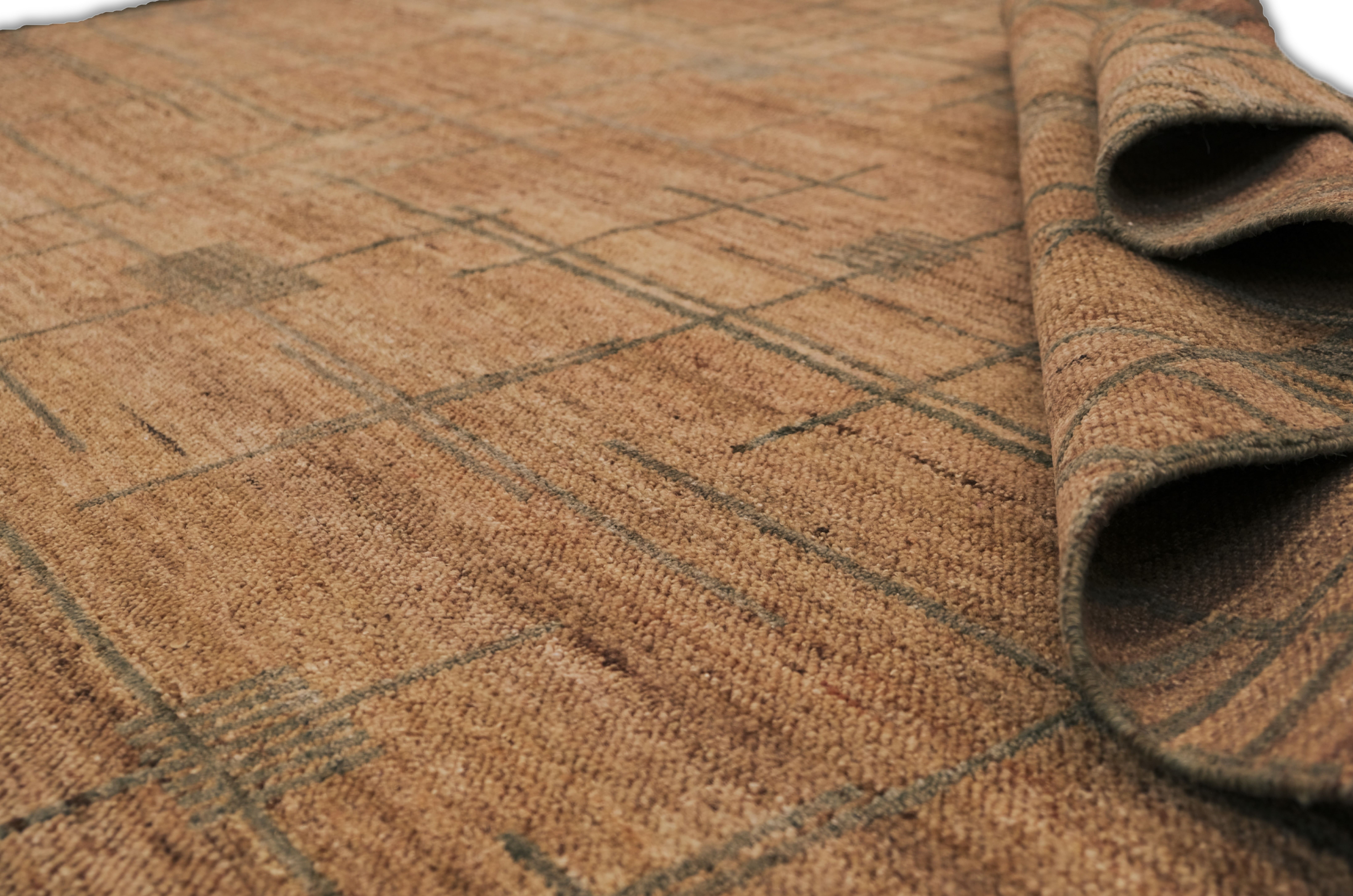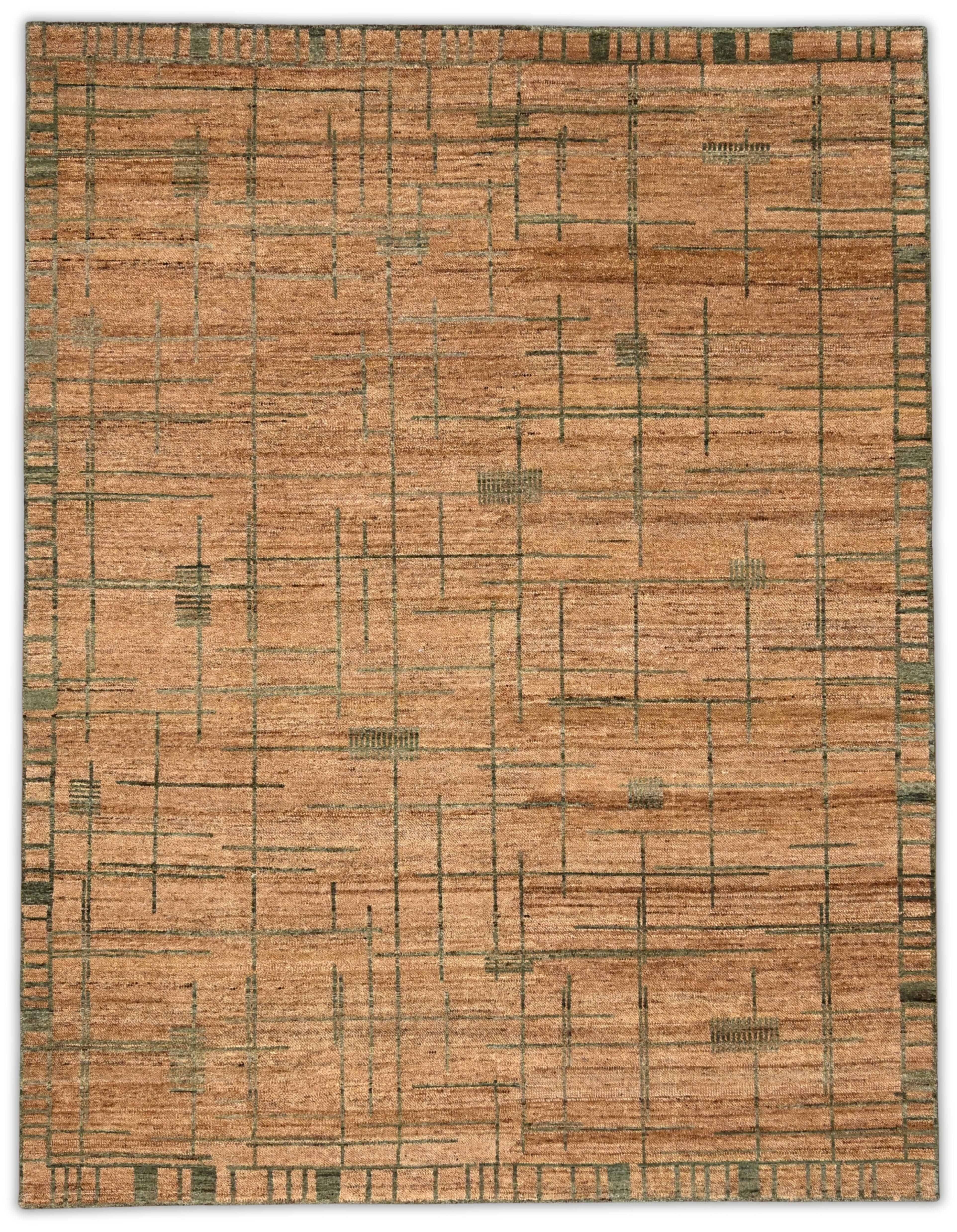 Hand-knotted in Hand-spun textured wool pile. Salmon background with sage/olive accents. This rug brings warm, mid-century elegance to contemporary spaces.