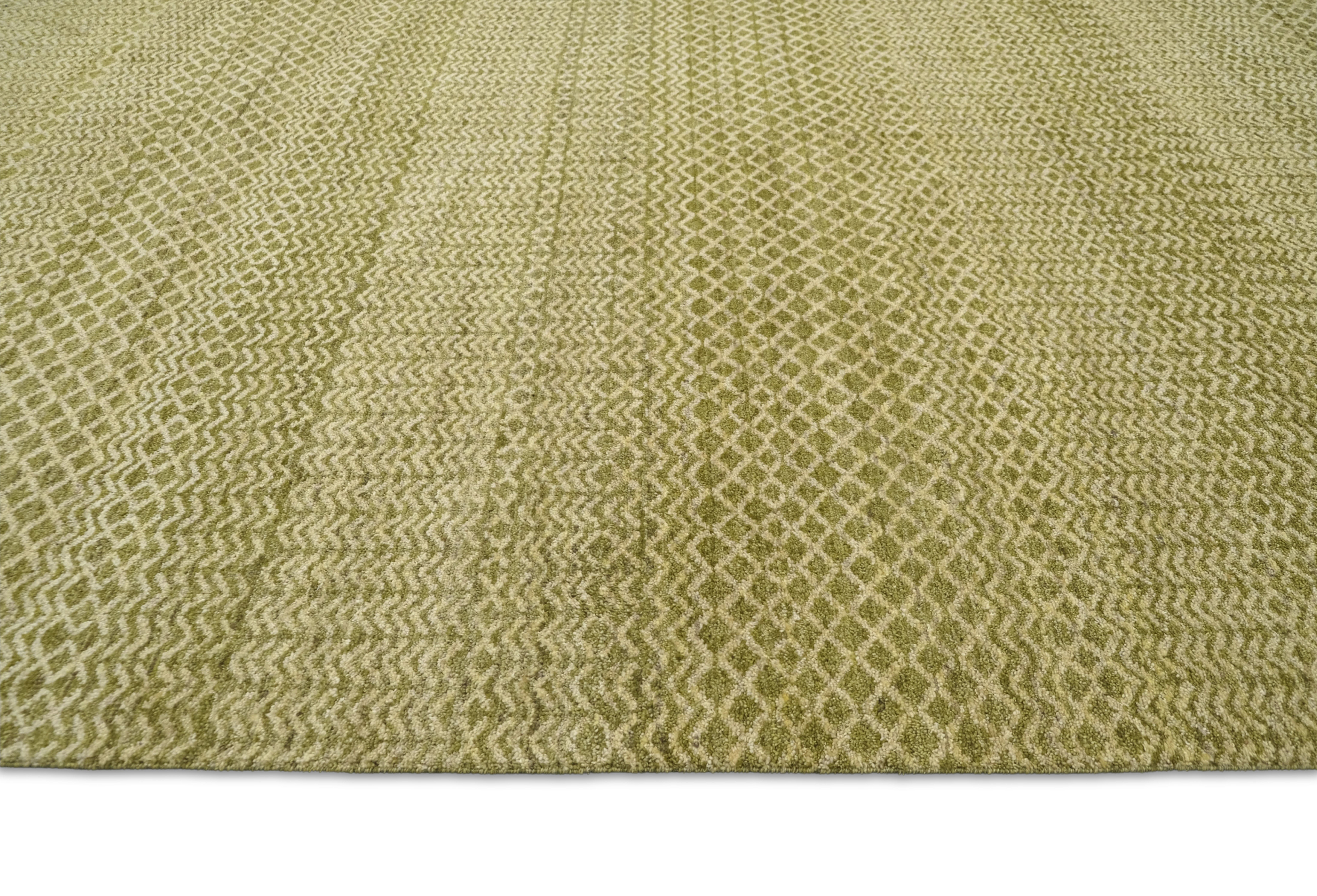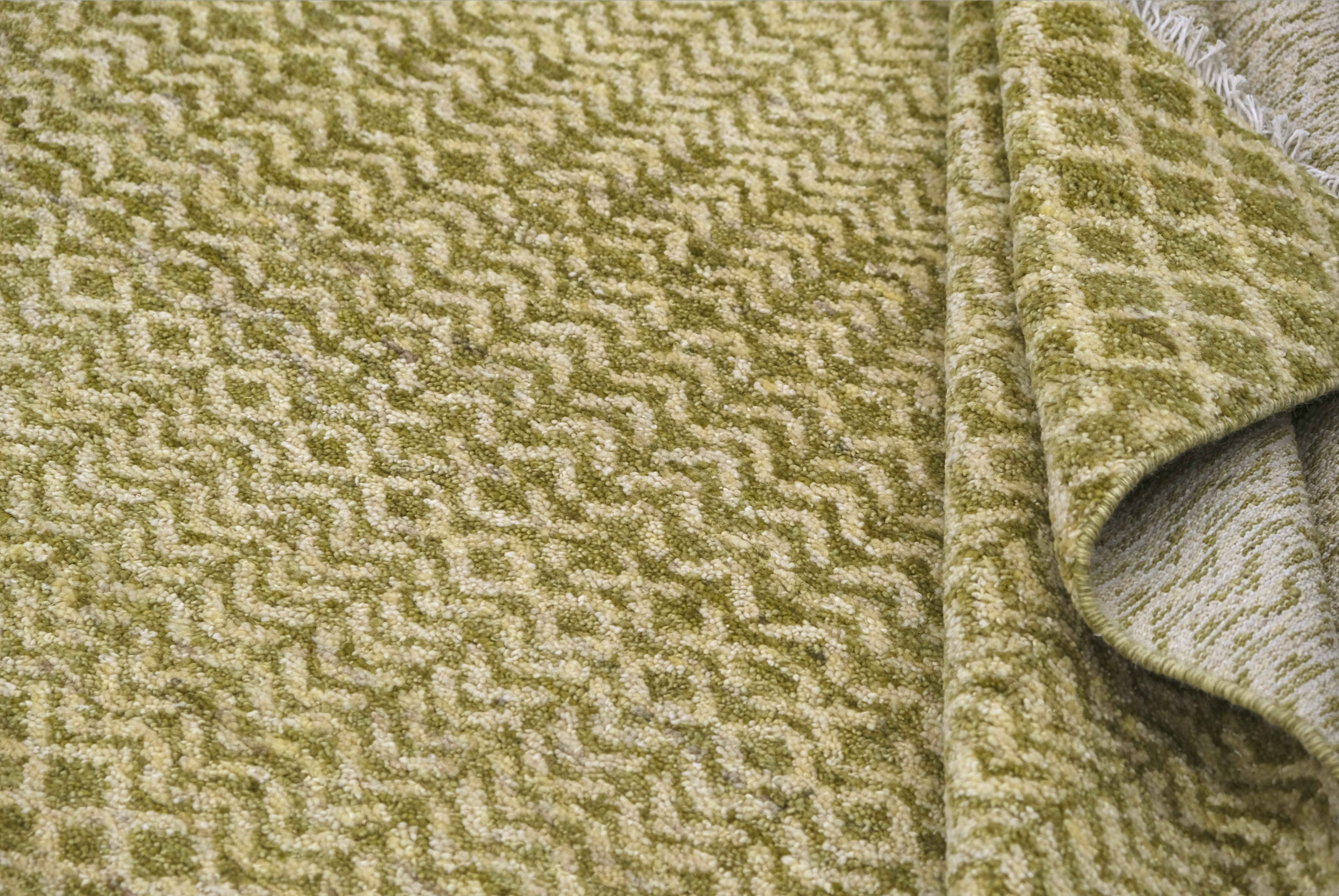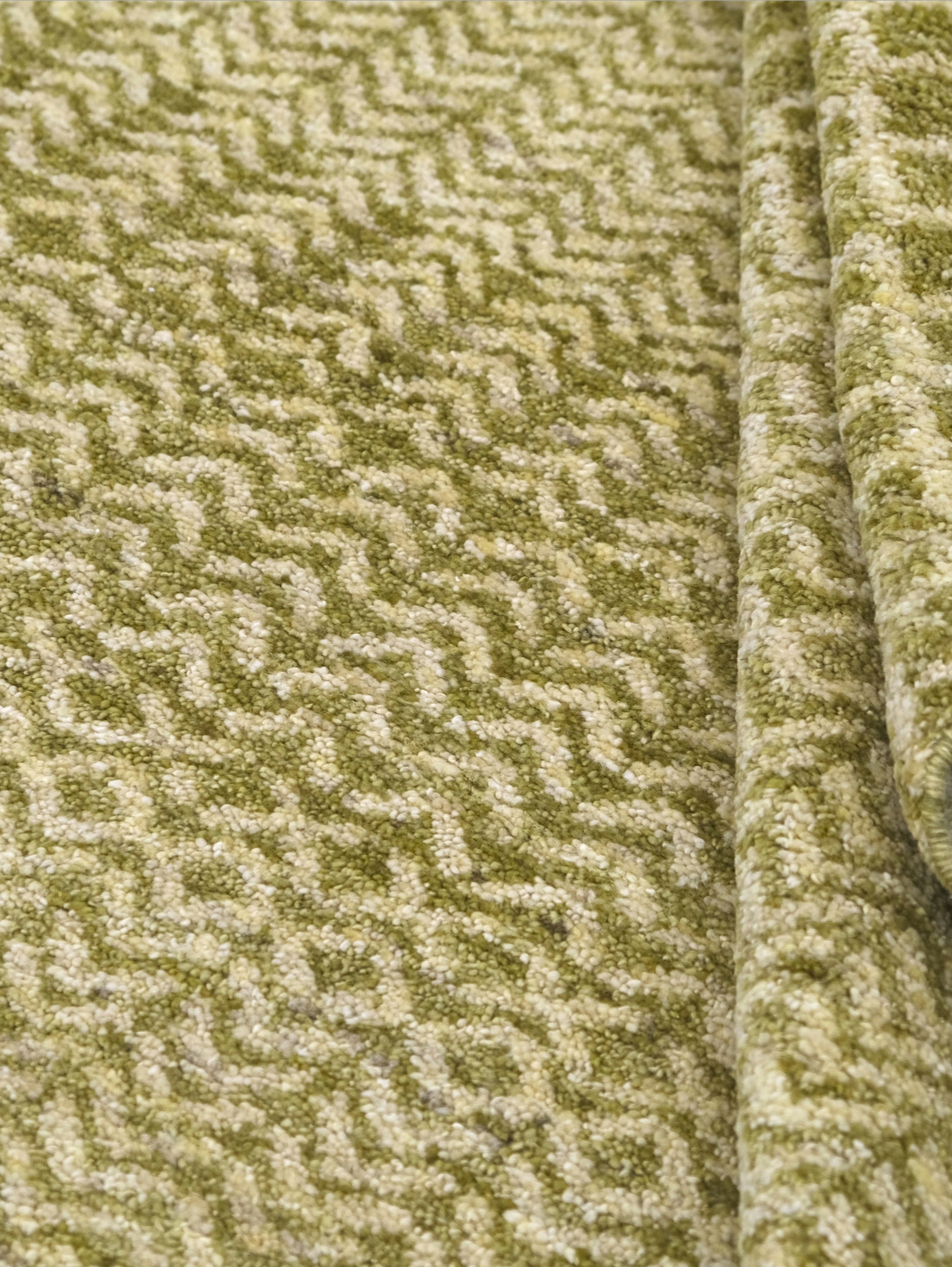 Hand-knotted, hand-spun wool pile, a rhythmic mix of small-scale diamond and chevron bands gives this rug subtle movement. The softly heathered palette blends olive-khaki, sage with ivory highlights, creating a warm, earthy neutral, an easy foundation for many decors.