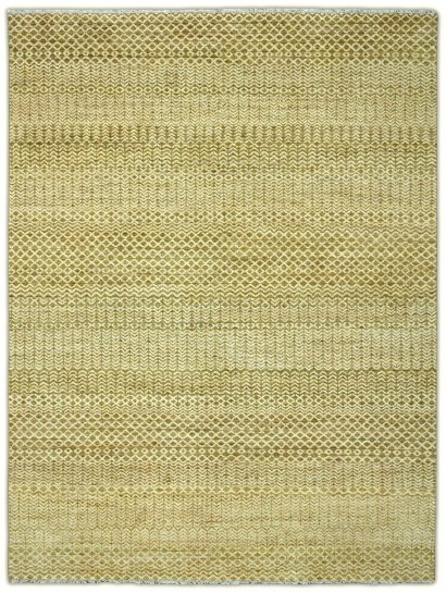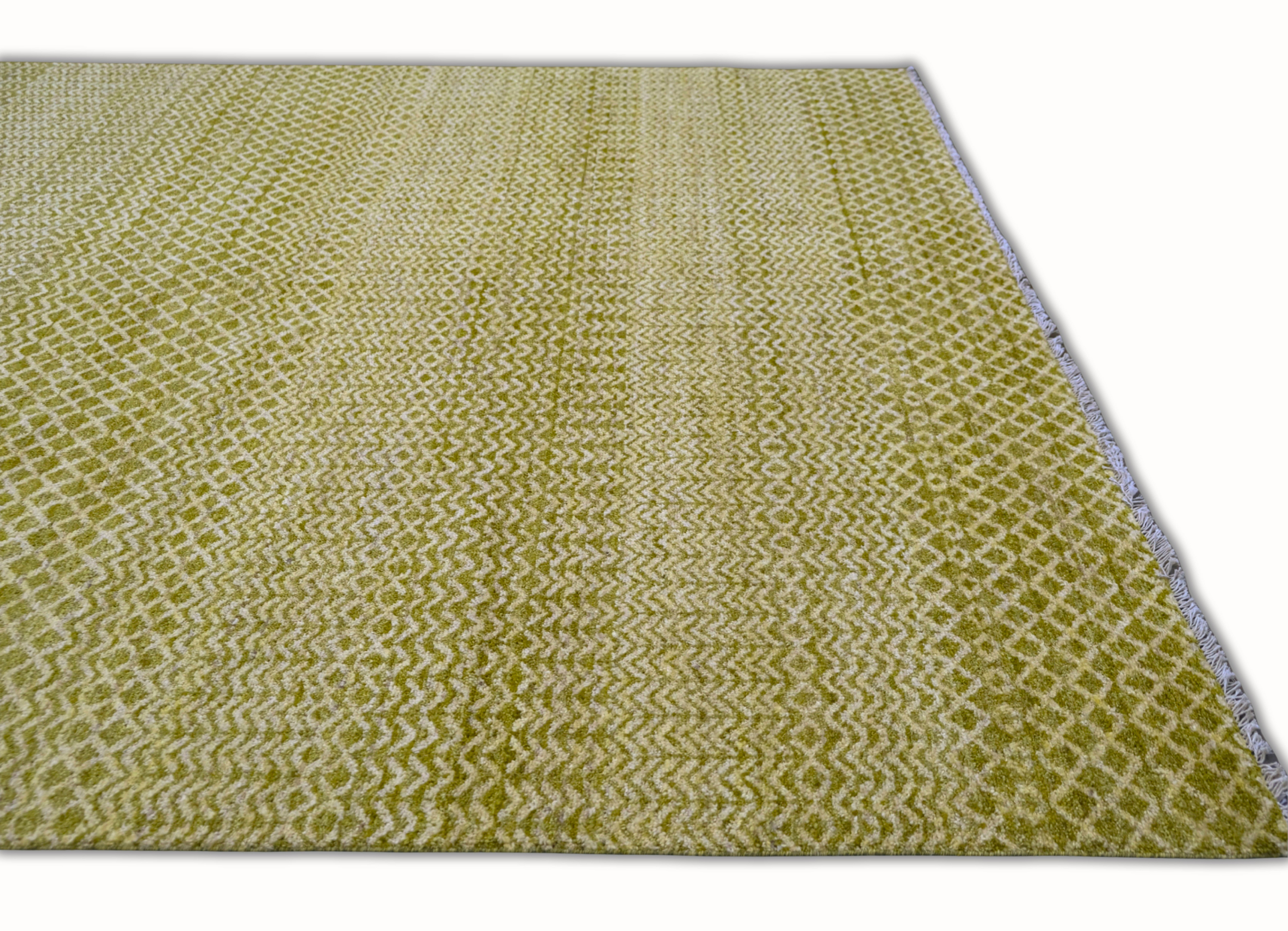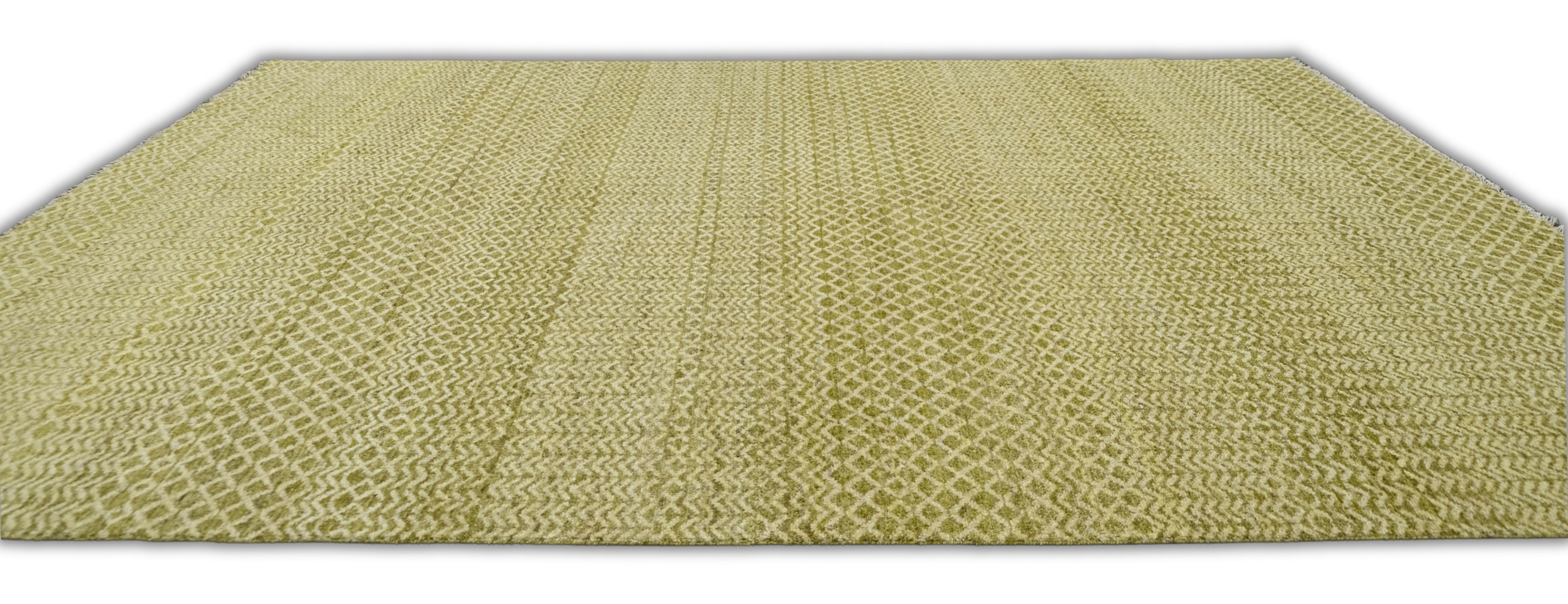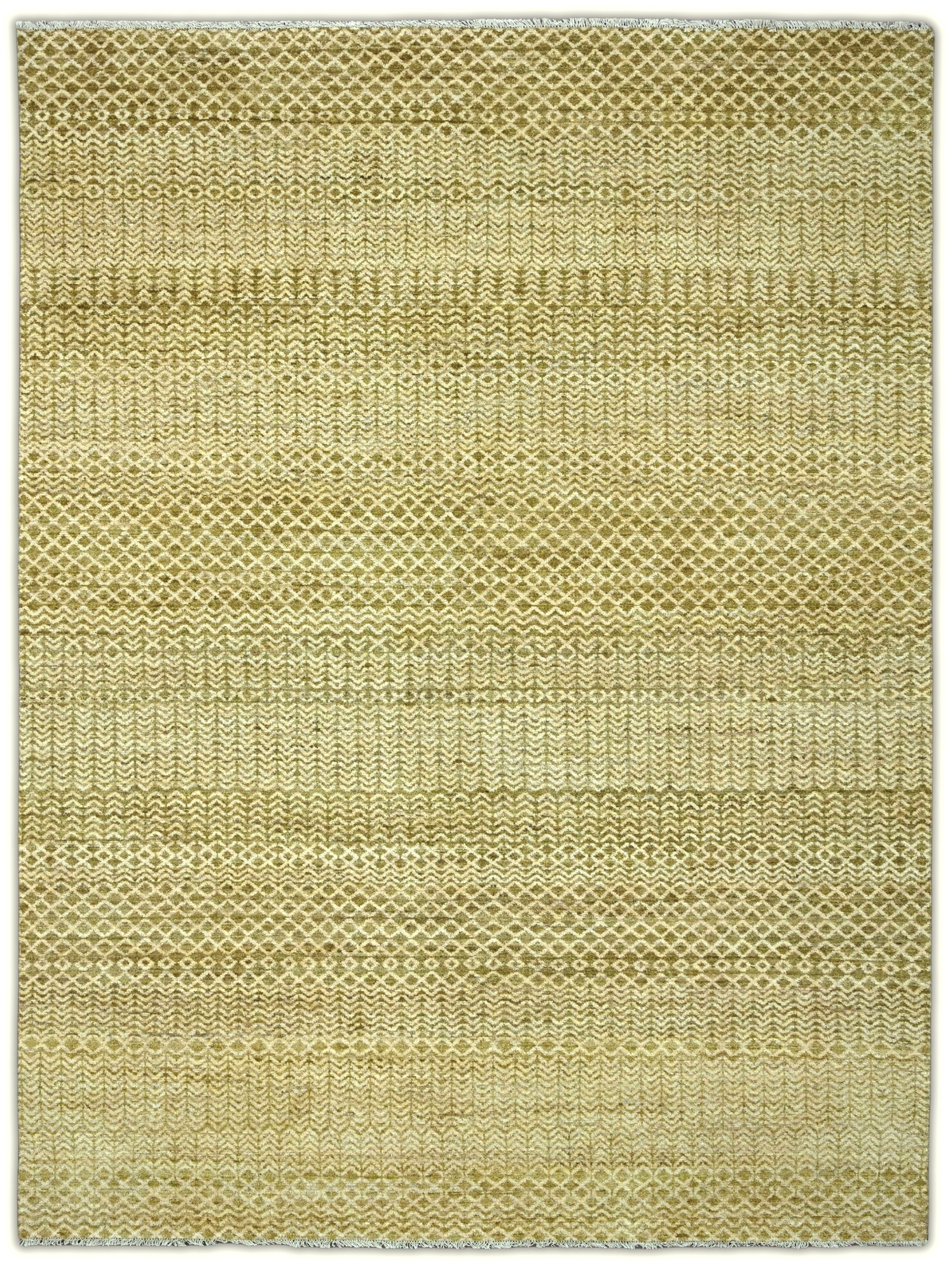 Hand-knotted, hand-spun wool pile, a rhythmic mix of small-scale diamond and chevron bands gives this rug subtle movement. The softly heathered palette blends olive-khaki, sage with ivory highlights, creating a warm, earthy neutral, an easy foundation for many decors.