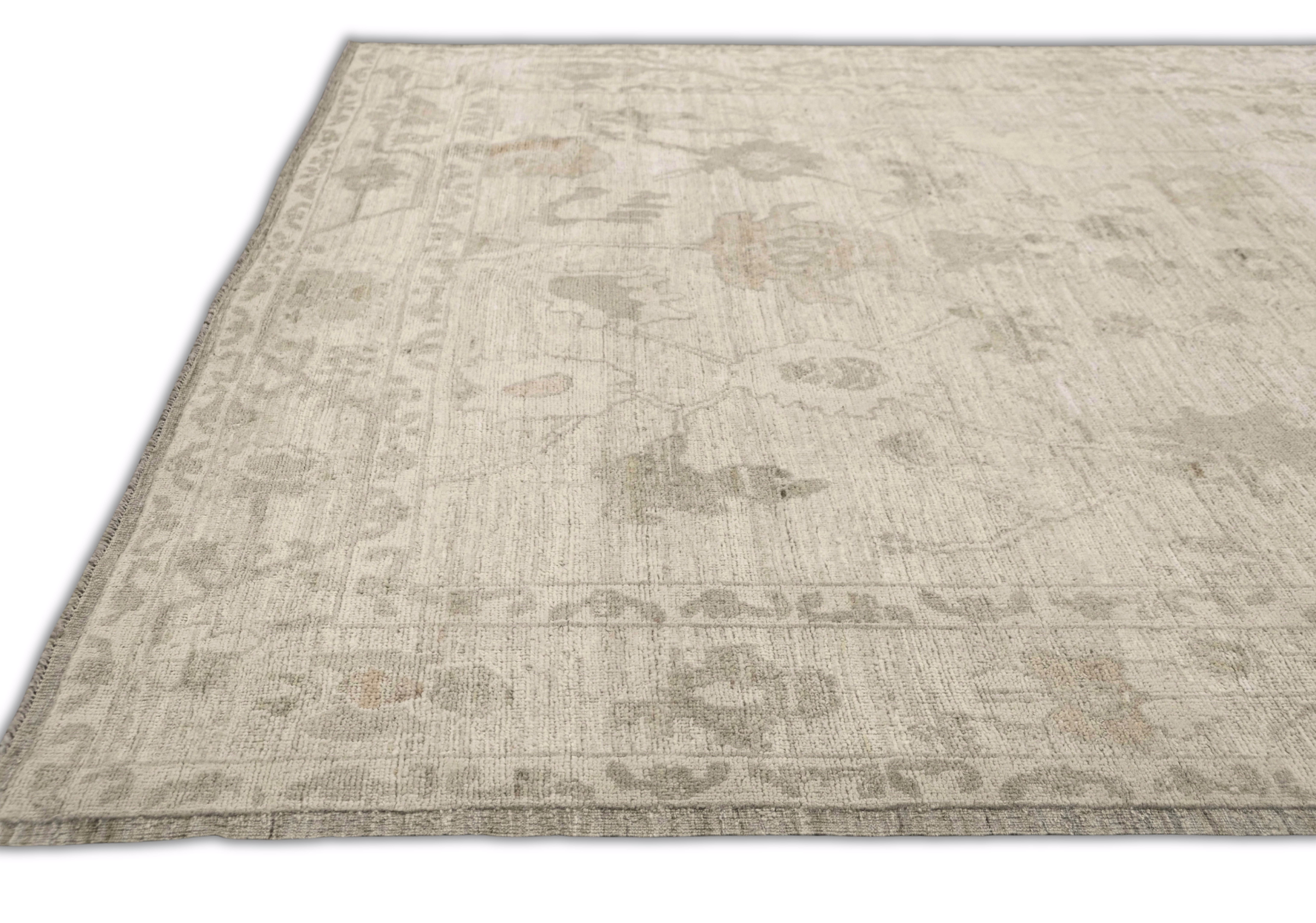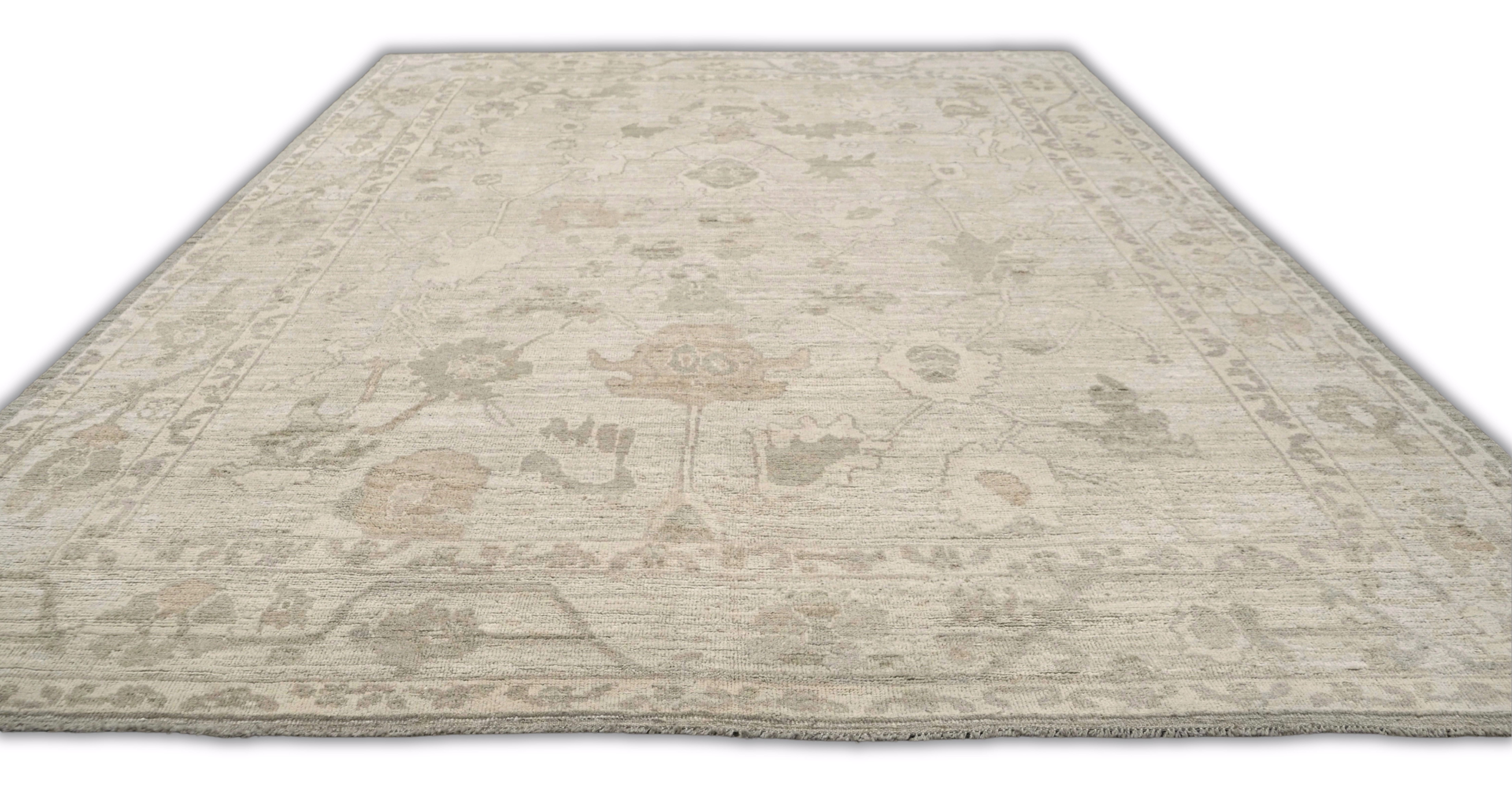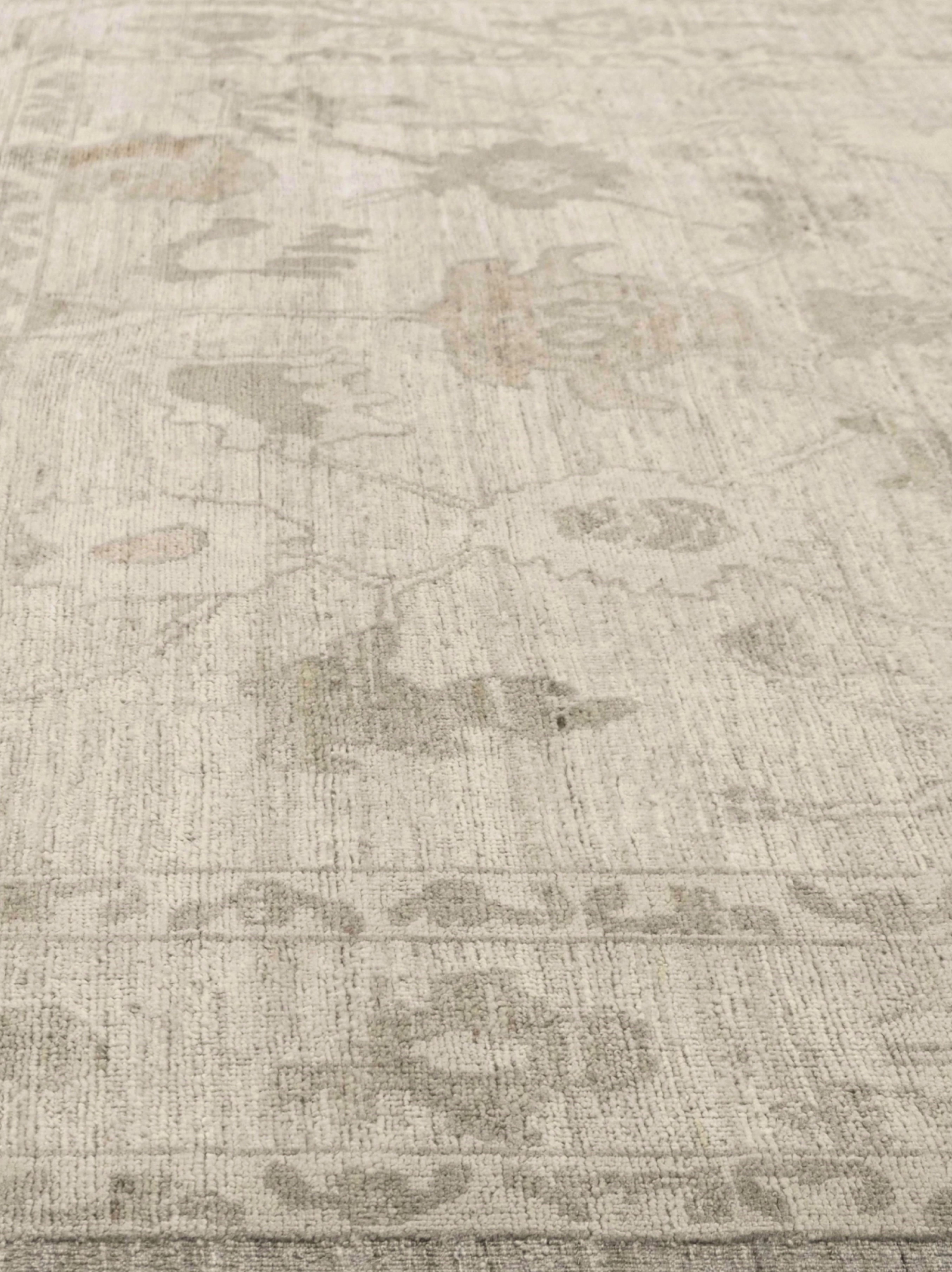 Hand-knotted with hand-spun wool pile, This softly faded Oushak-inspired design in ivory, parchment / oatmeal, taupe / greige and touches of muted sage, creating an elegant tone-on-tone neutral that brings subtle warmth, and timeless versatility to many interiors.
