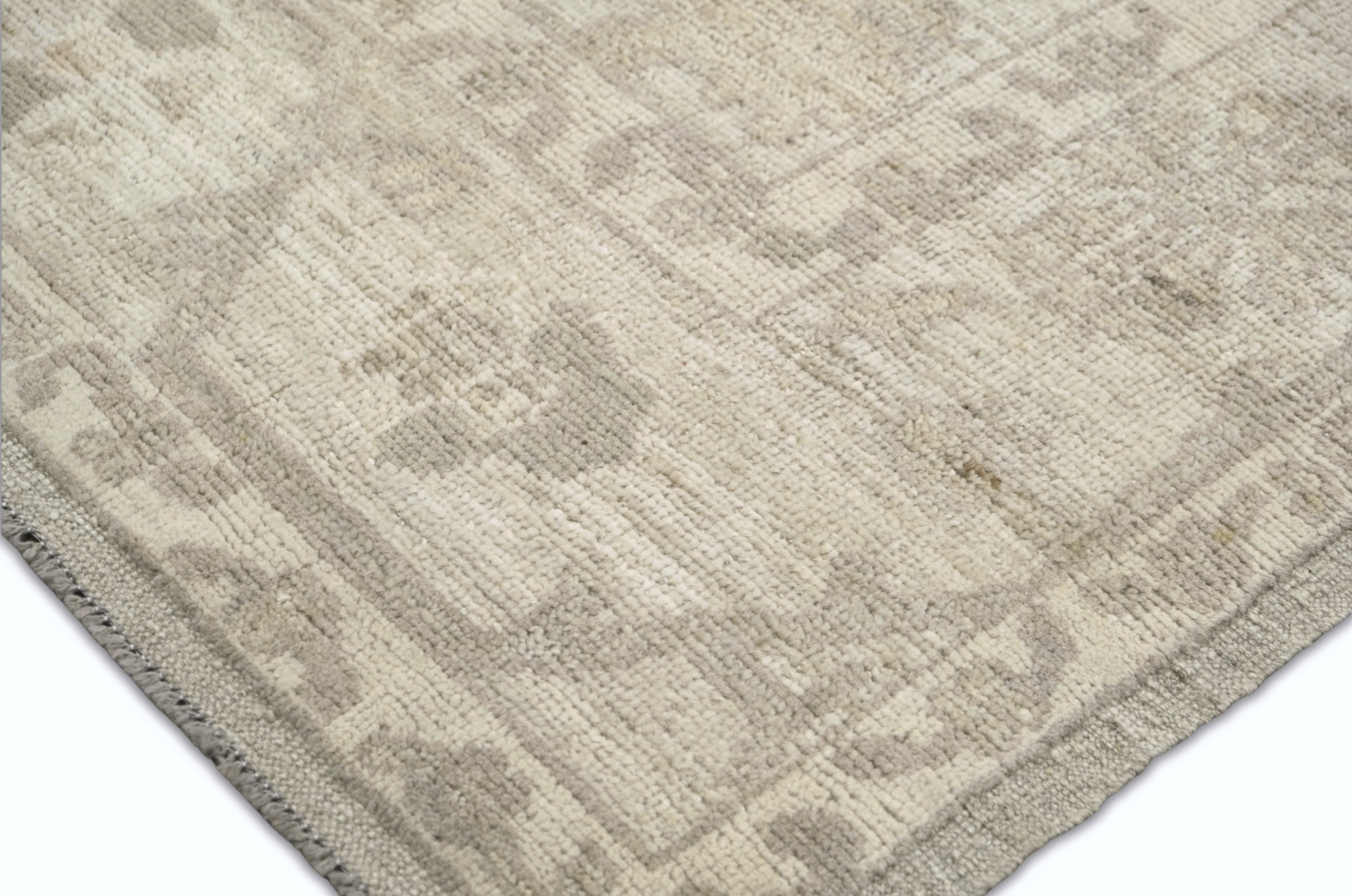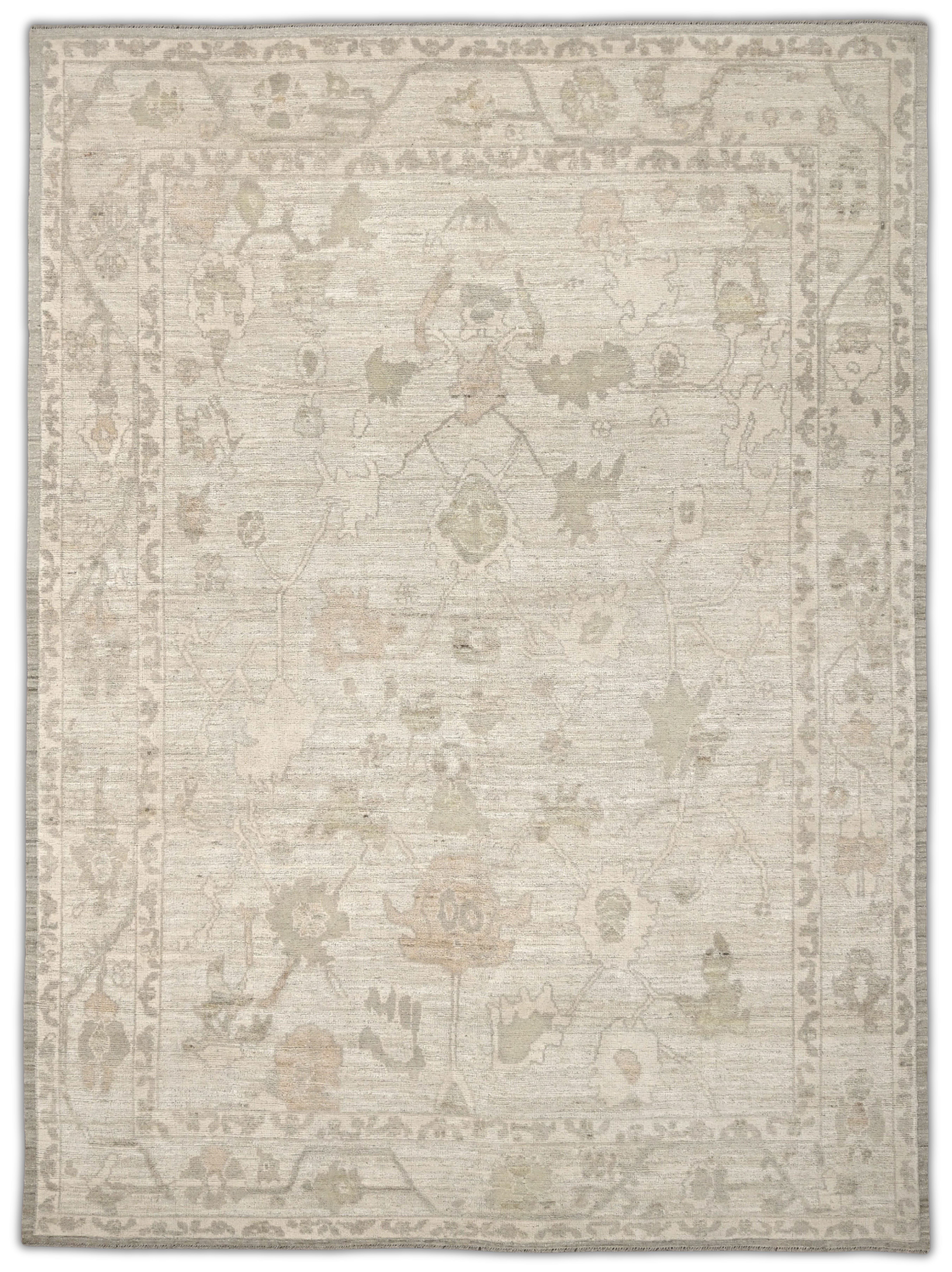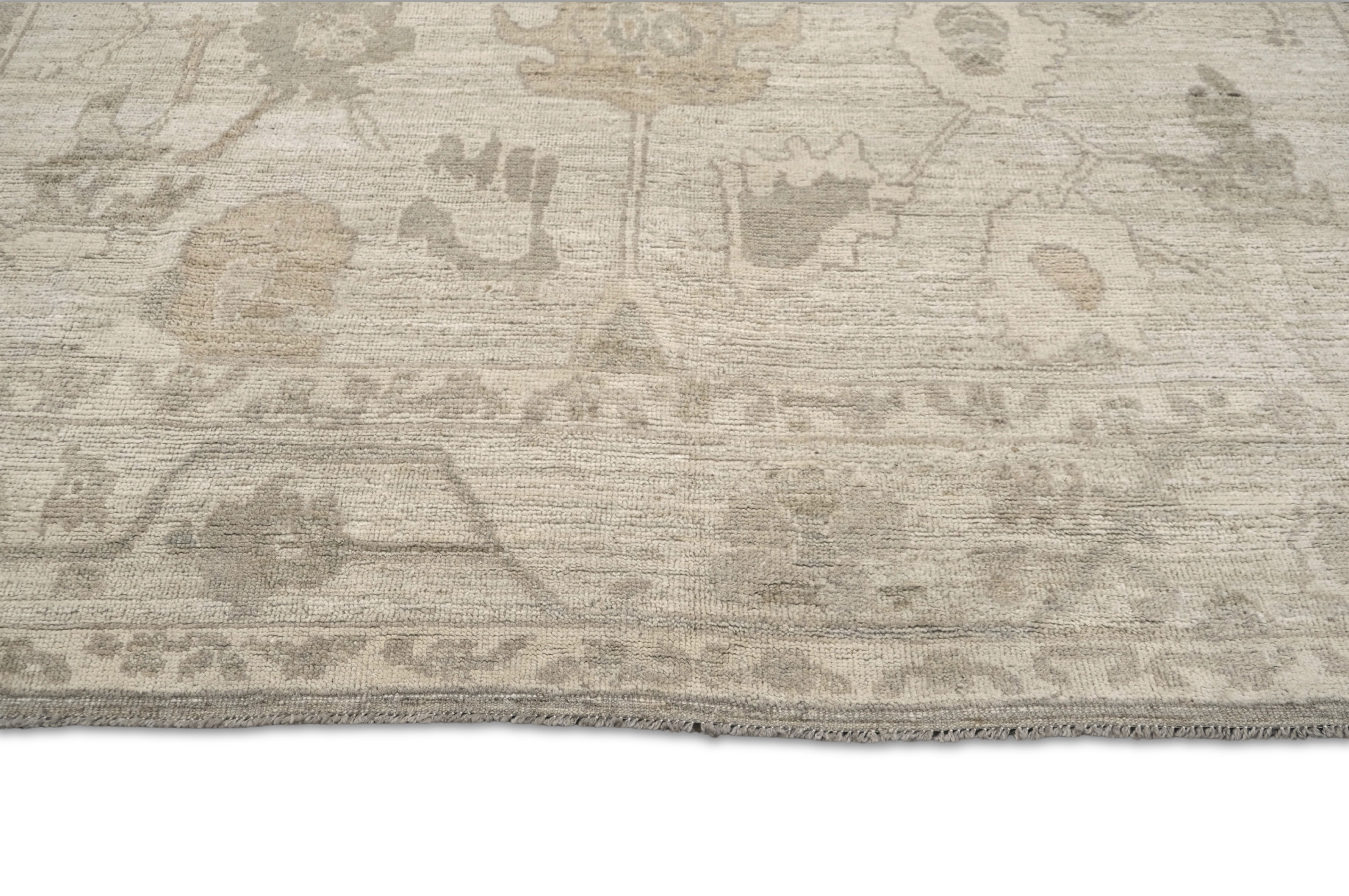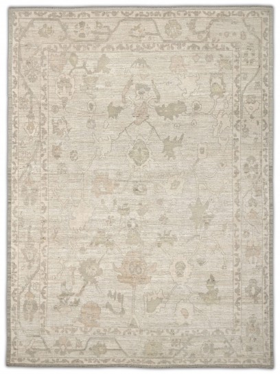 Hand-knotted with hand-spun wool pile, This softly faded Oushak-inspired design in ivory, parchment / oatmeal, taupe / greige and touches of muted sage, creating an elegant tone-on-tone neutral that brings subtle warmth, and timeless versatility to many interiors.