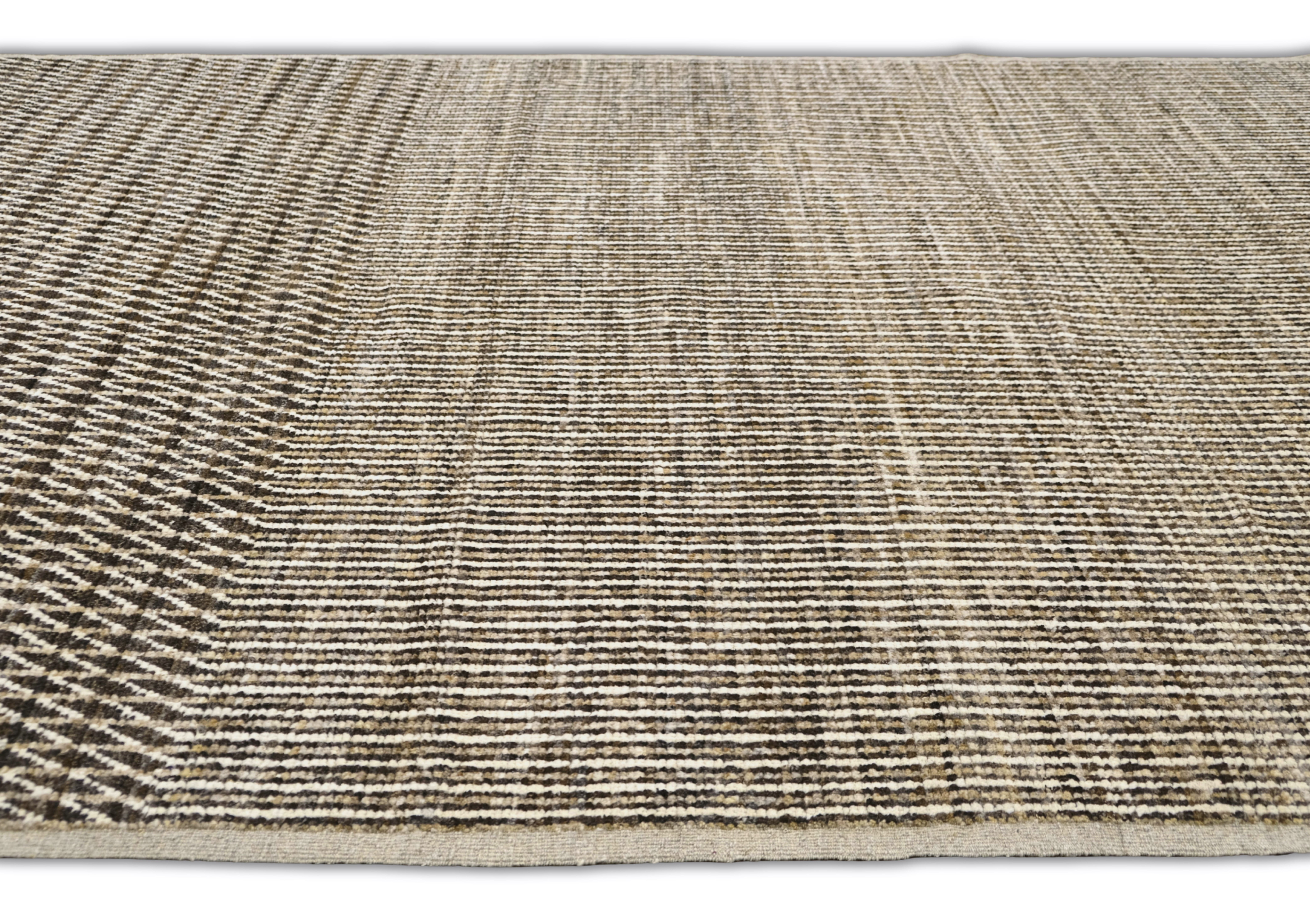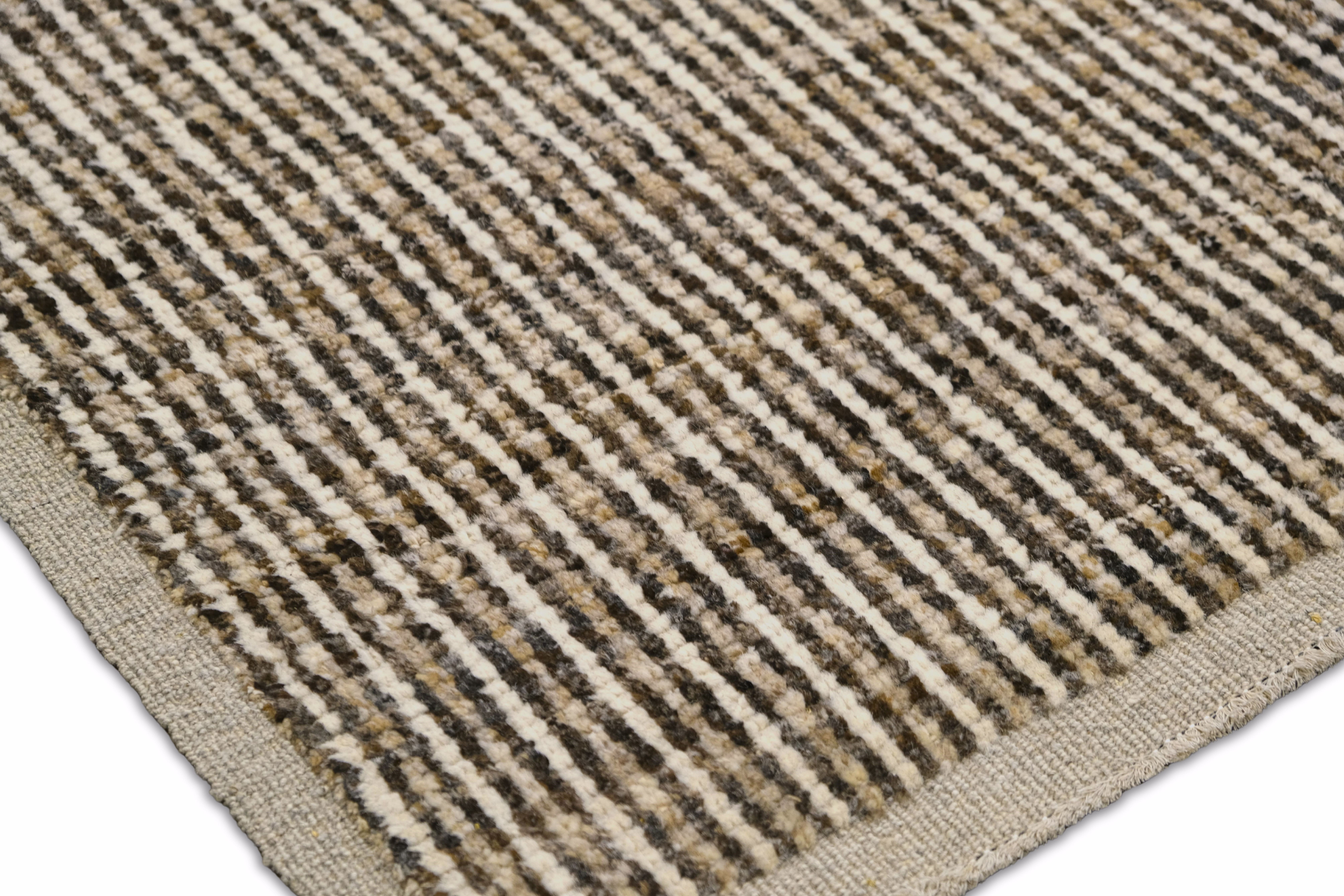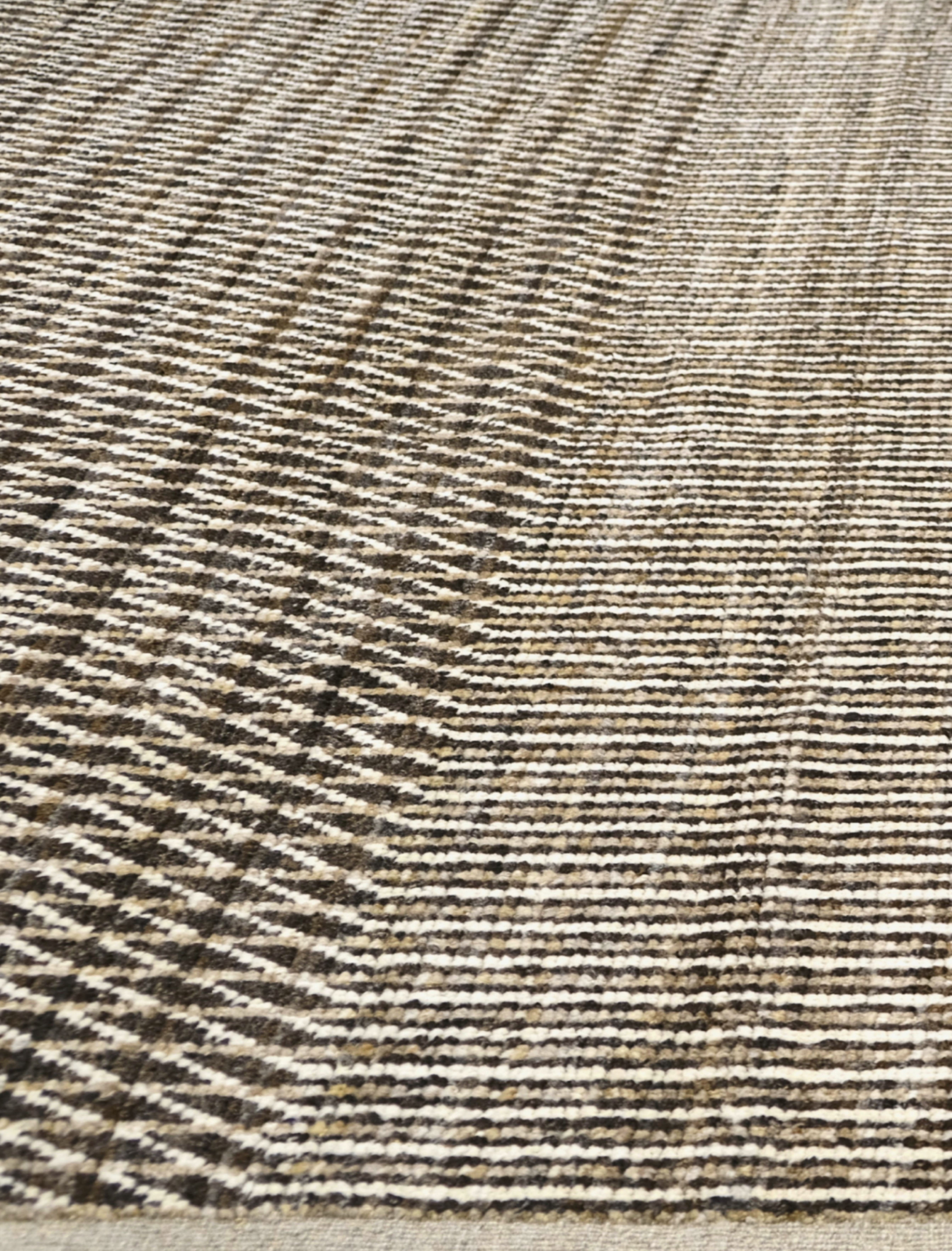 Hand-knotted featuring undyed hand-spun wool pile. A mix of vertical striping and a chevron pattern gives this rug subtle structure and movement. Warm neutral softly heathered palette blends espresso brown, ivory, oatmeal and taupe. Versatile and easy to place rug in several interiors.