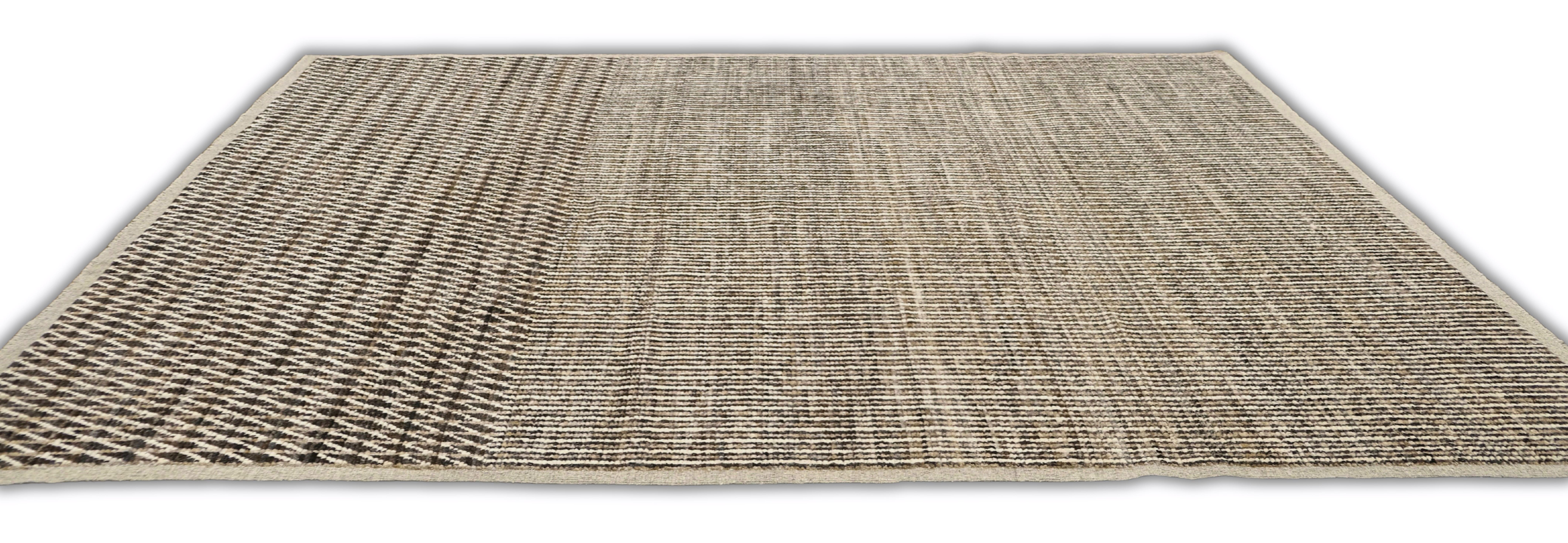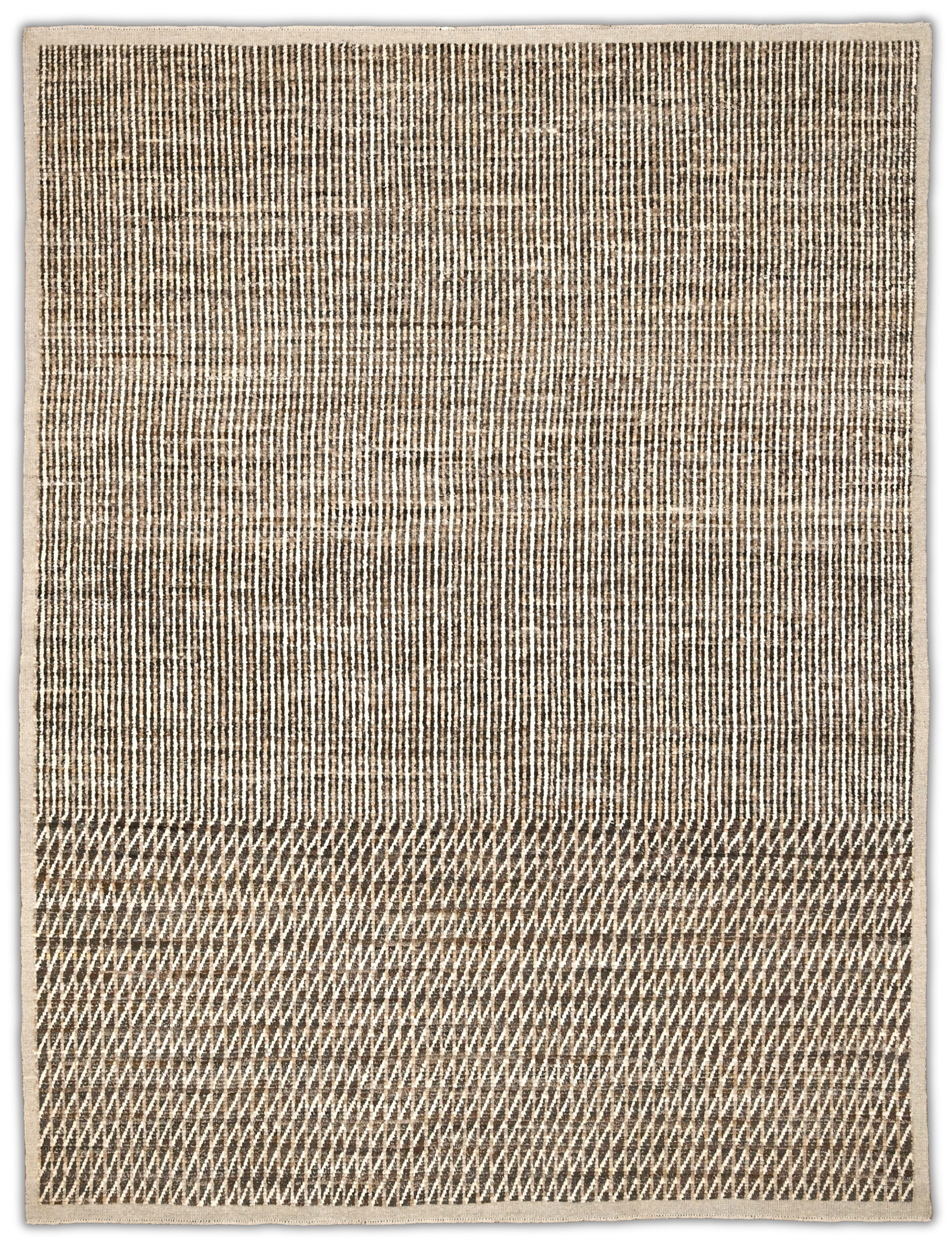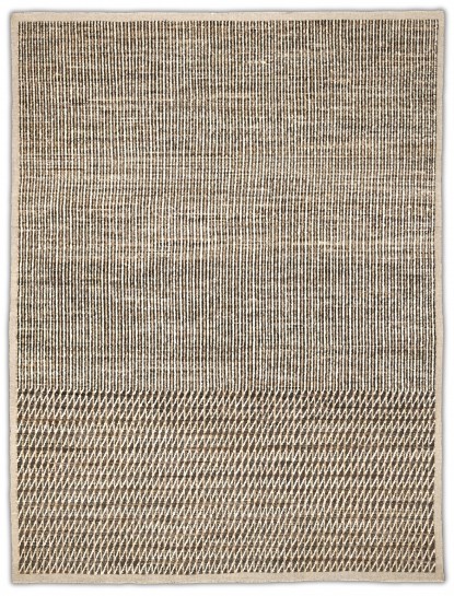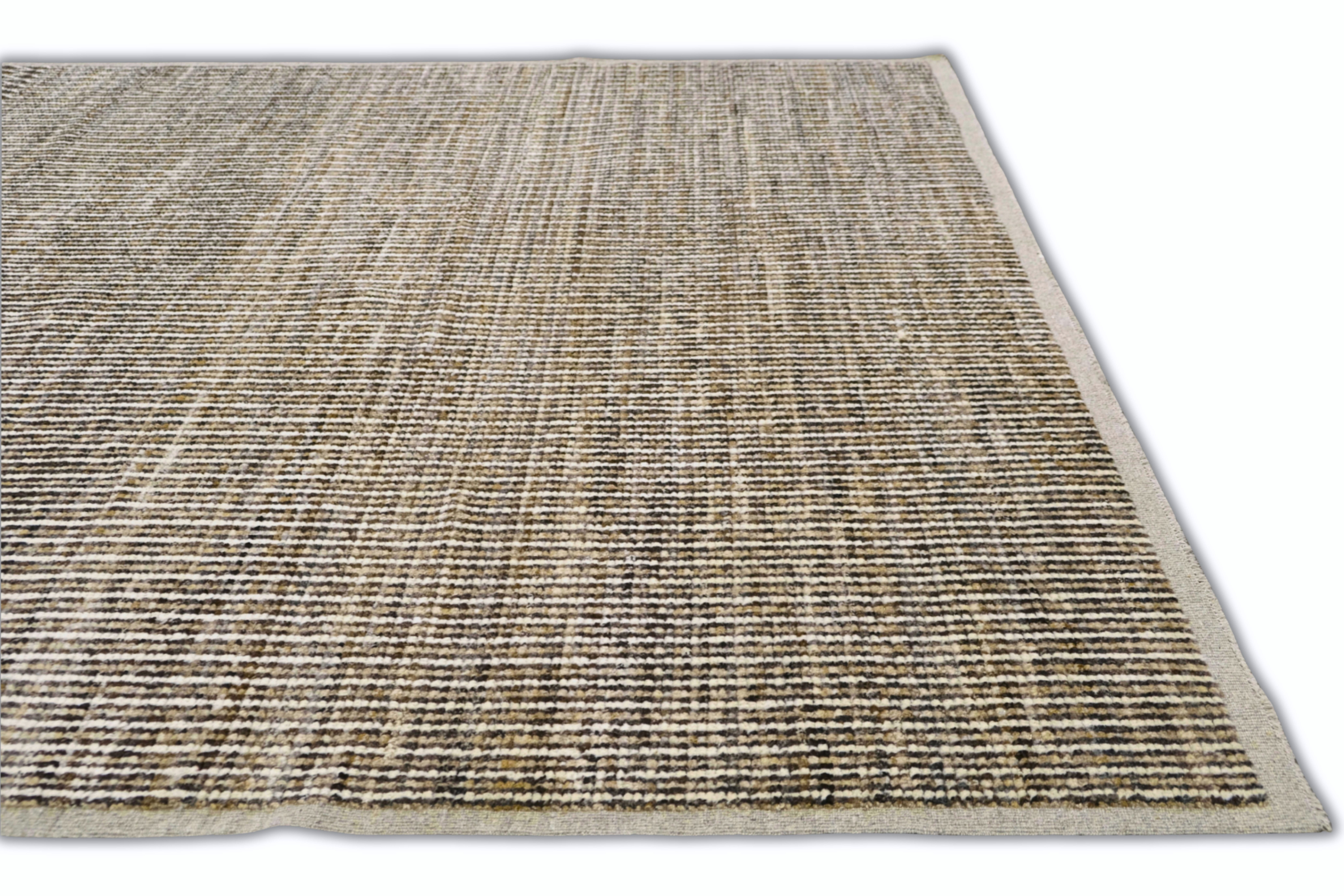 Hand-knotted featuring undyed hand-spun wool pile. A mix of vertical striping and a chevron pattern gives this rug subtle structure and movement. Warm neutral softly heathered palette blends espresso brown, ivory, oatmeal and taupe. Versatile and easy to place rug in several interiors.