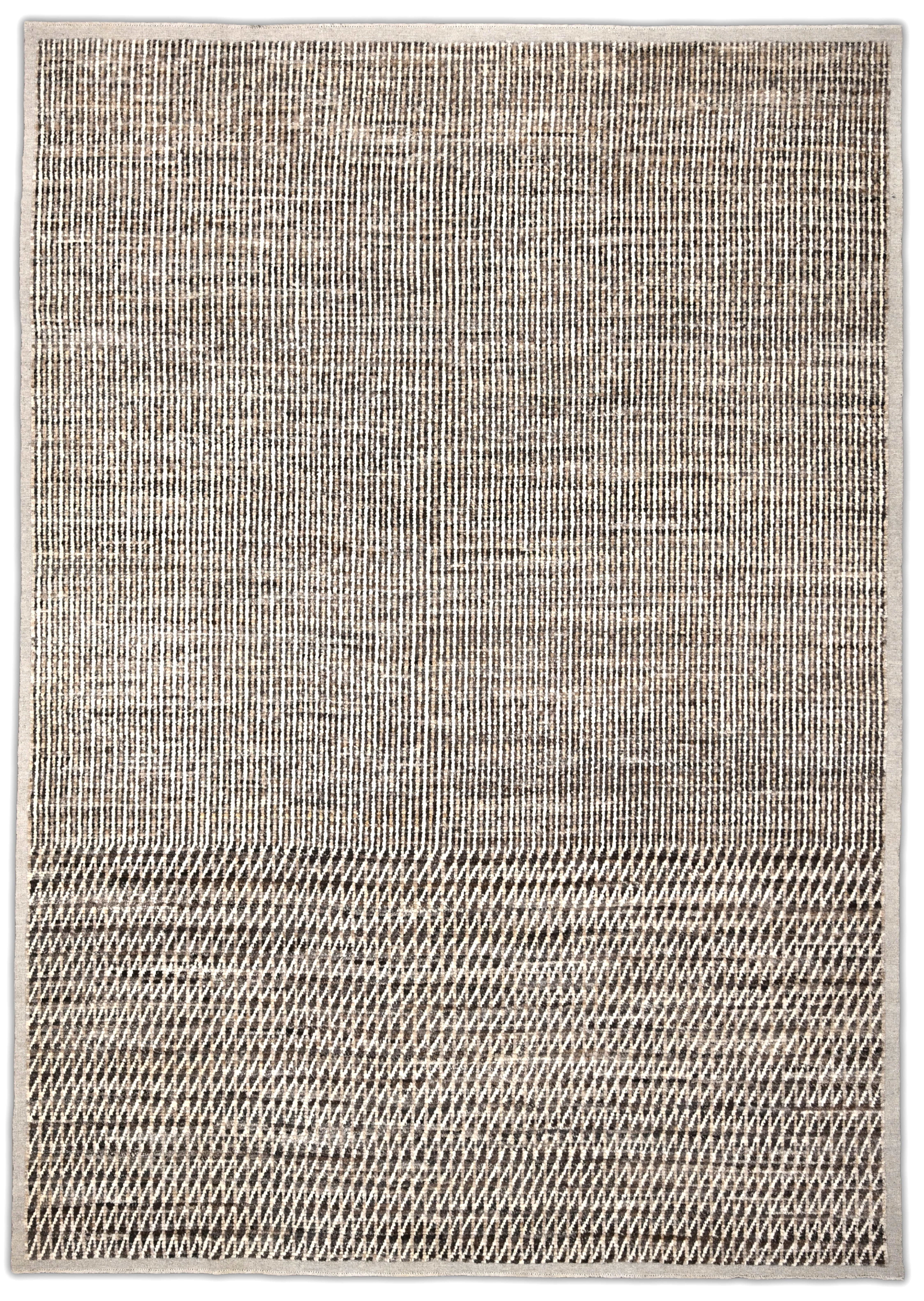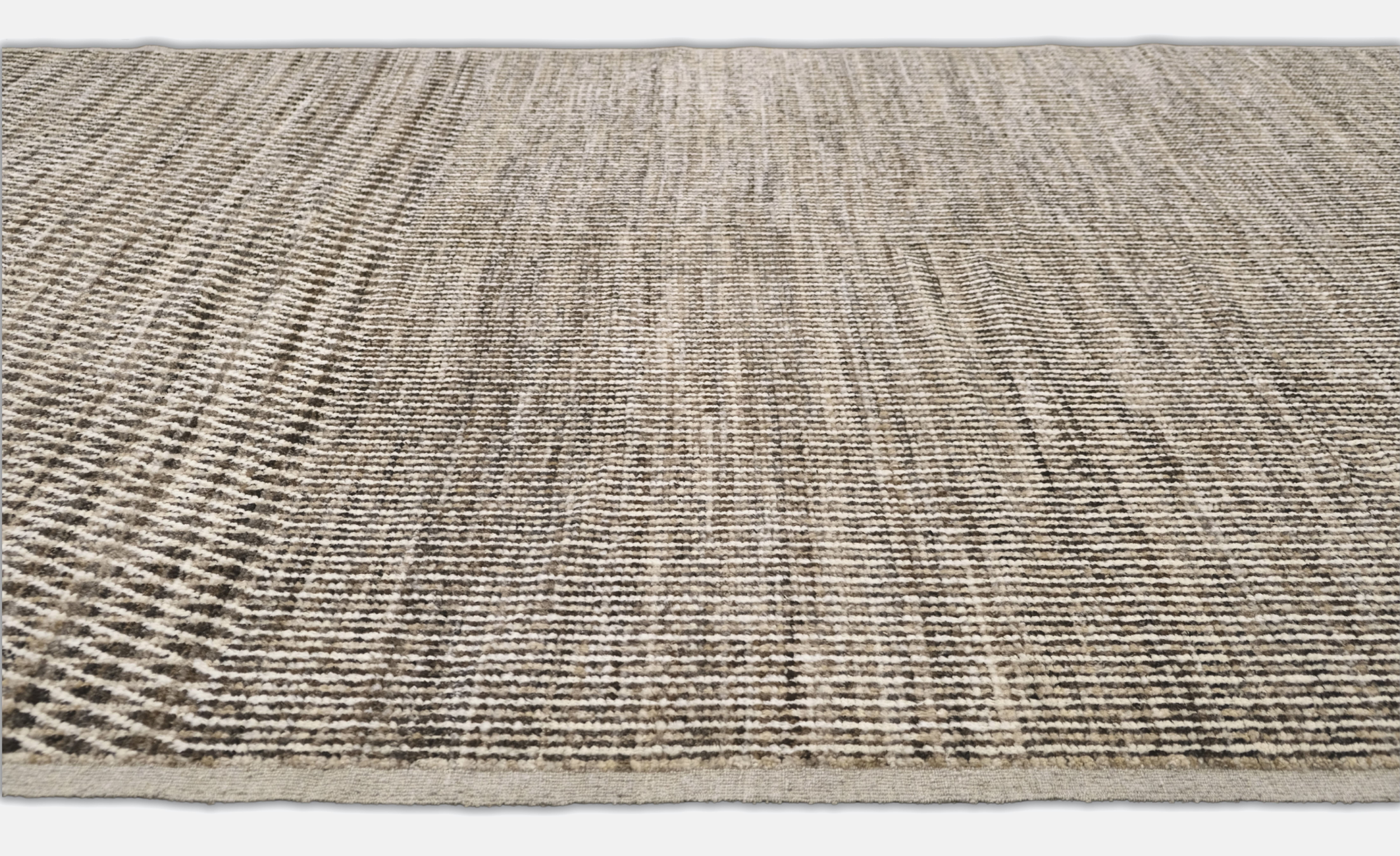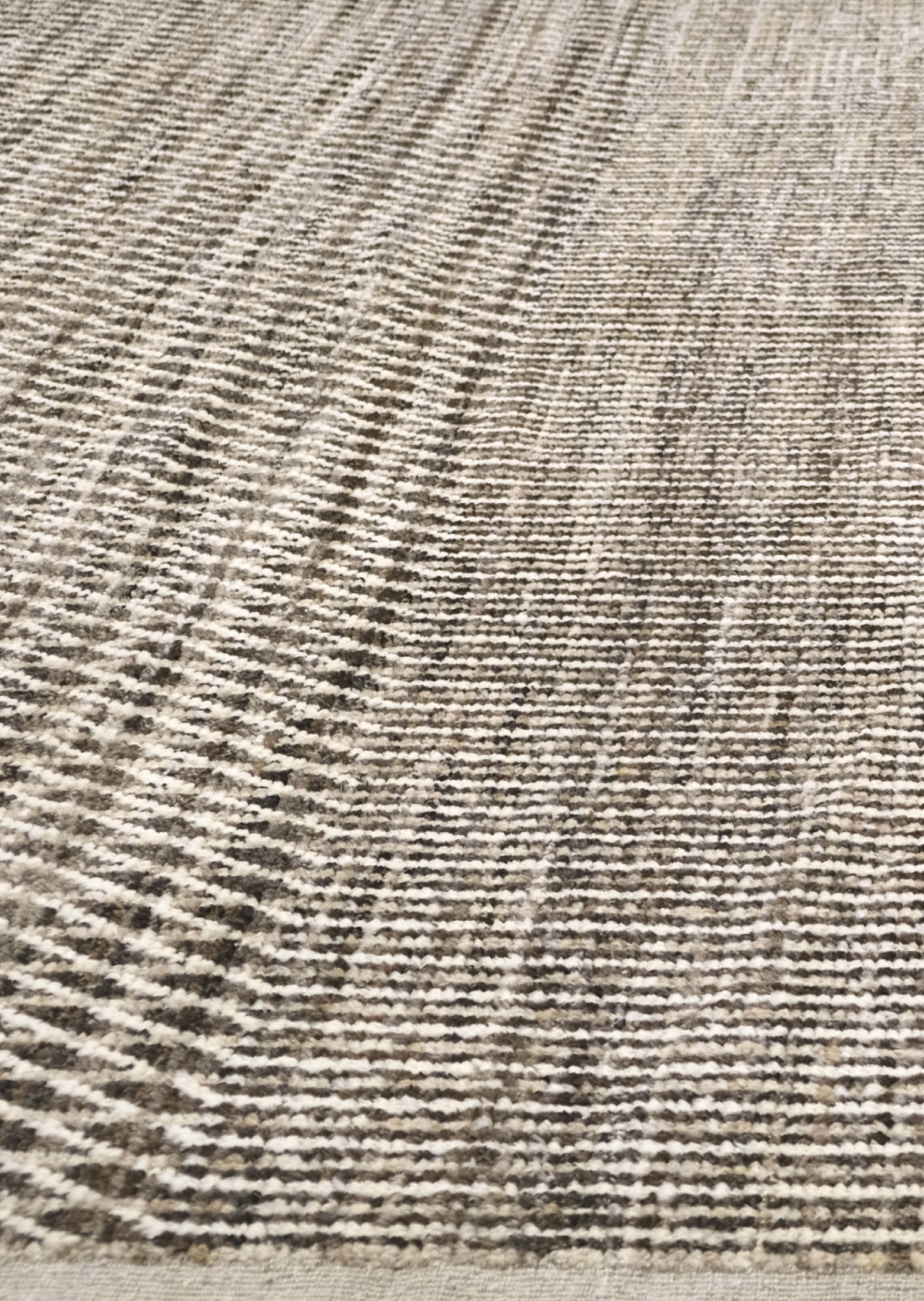 Hand-knotted featuring undyed hand-spun wool pile. A mix of vertical striping and a chevron pattern gives this rug subtle structure and movement. Warm neutral softly heathered palette blends espresso brown, ivory, oatmeal and taupe. Versatile and easy to place rug in several interiors.