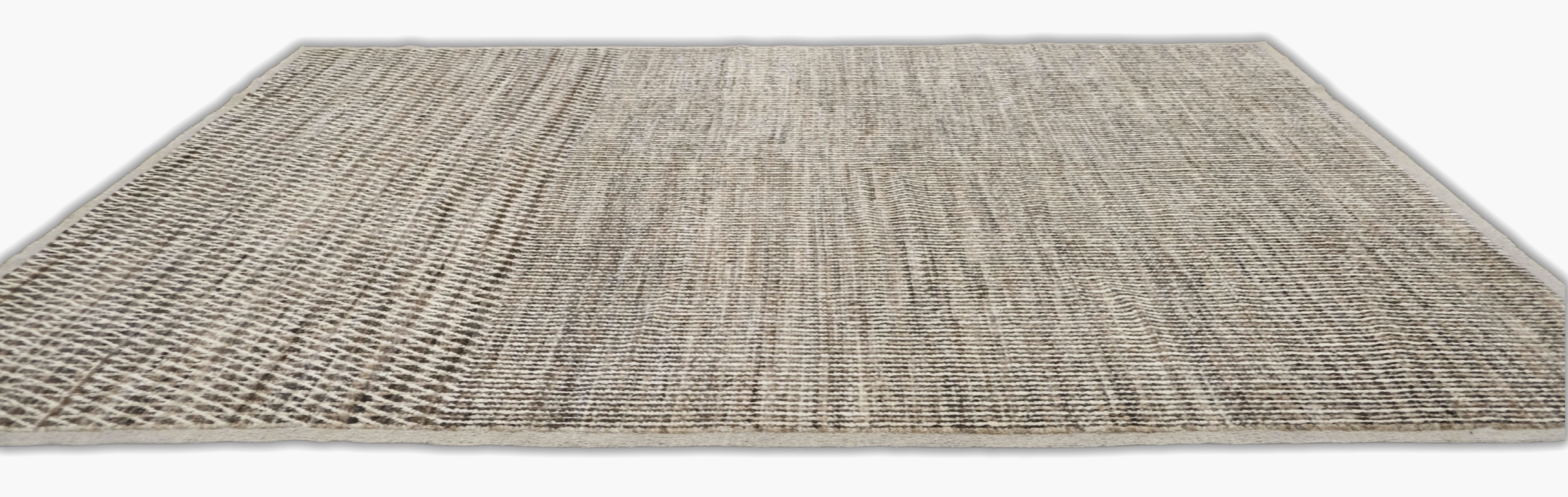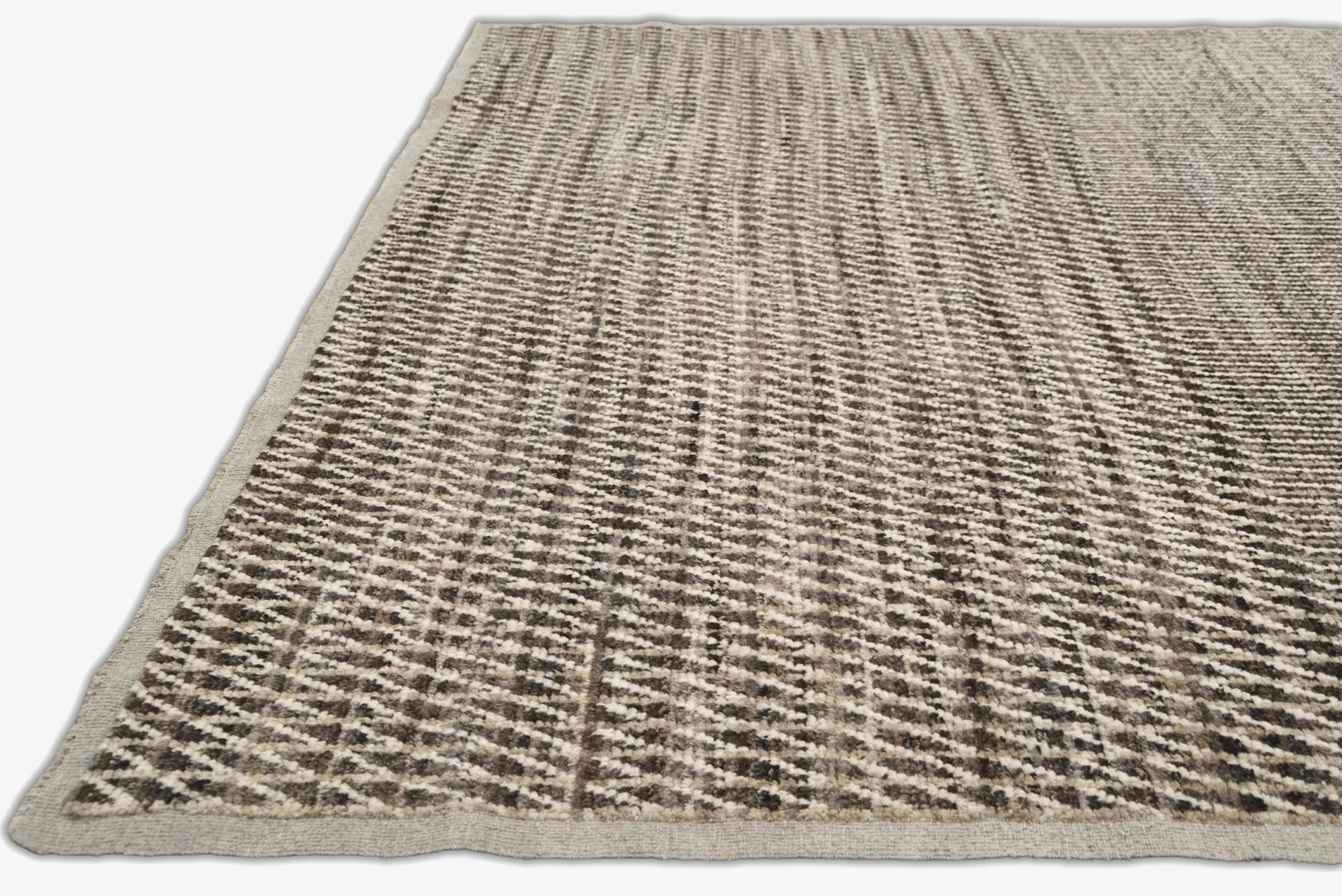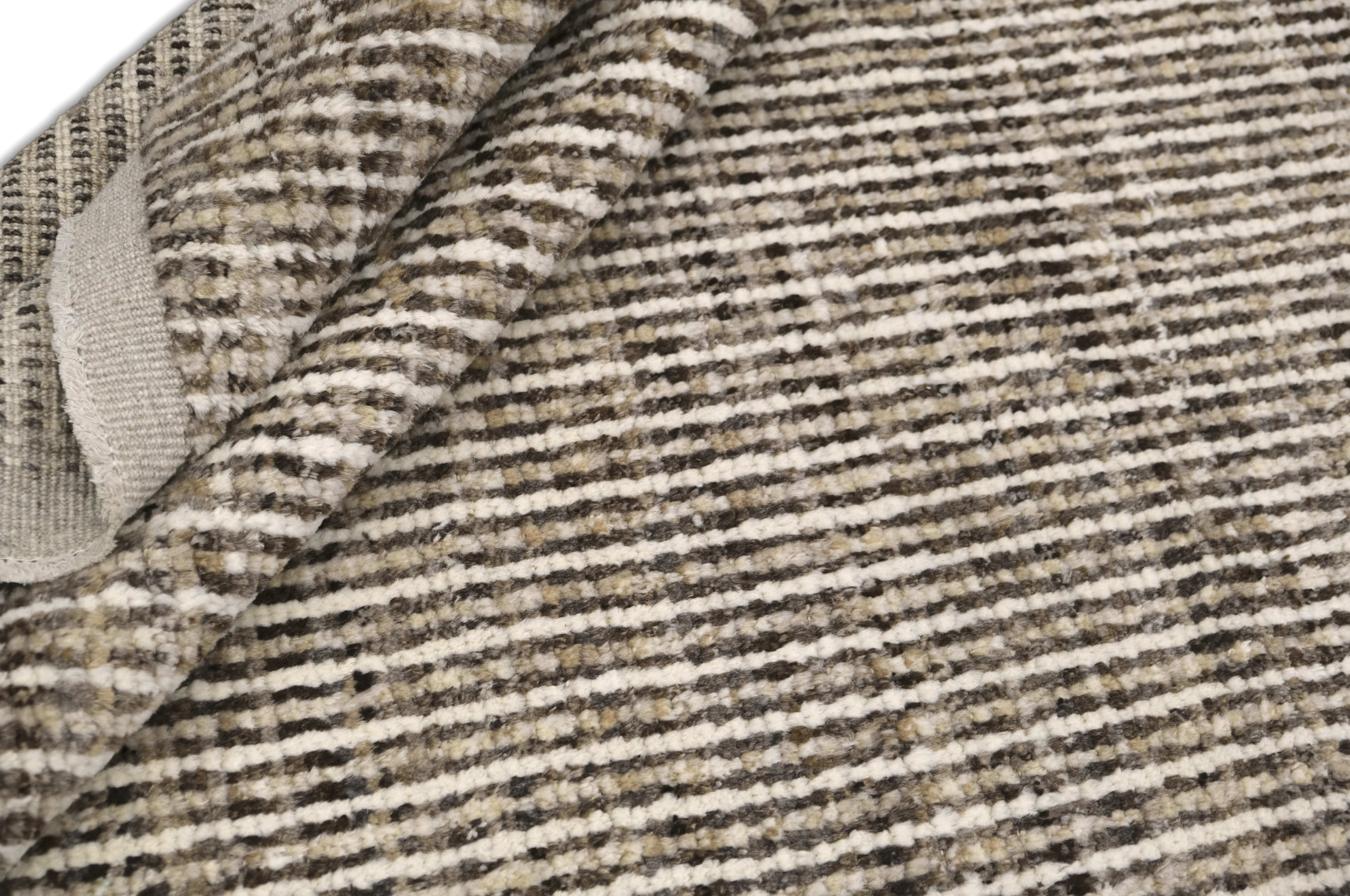 Hand-knotted featuring undyed hand-spun wool pile. A mix of vertical striping and a chevron pattern gives this rug subtle structure and movement. Warm neutral softly heathered palette blends espresso brown, ivory, oatmeal and taupe. Versatile and easy to place rug in several interiors.