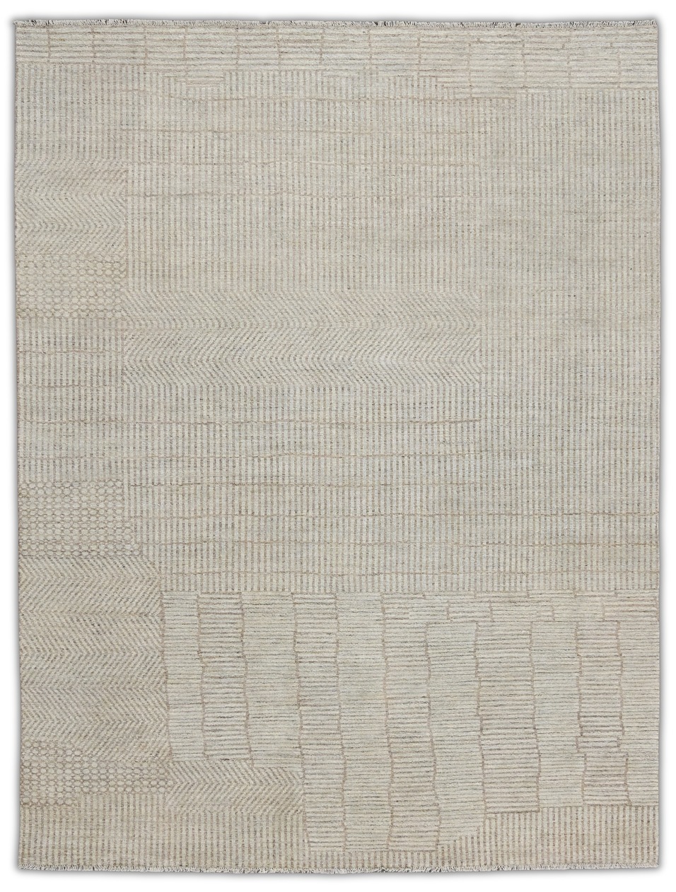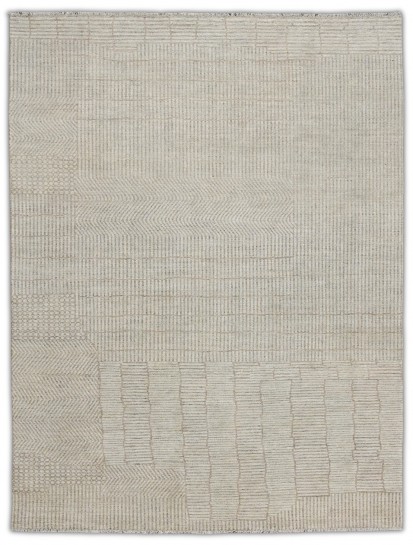 This hand-knotted rug is crafted from fine hand-spun wool, showcasing a soft palette of warm ivory, beige and light taupe. Subtle variations in texture create depth and dimension. Its understated geometric composition and tonal elegance makes it a refined choice for many decors
