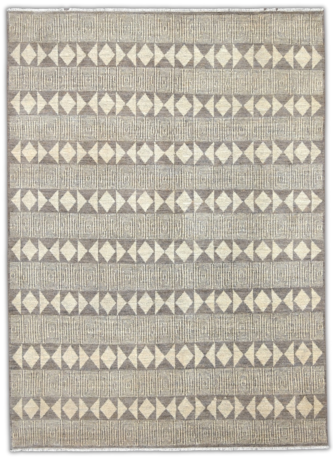 This hand-knotted fine hand-spun wool pile rug showcases blend of ivory, camel, taupe, and muted slate-blue gray tones. Its subtle geometric motif and softly variegated background create depth and texture bringing understated elegance to many decors.