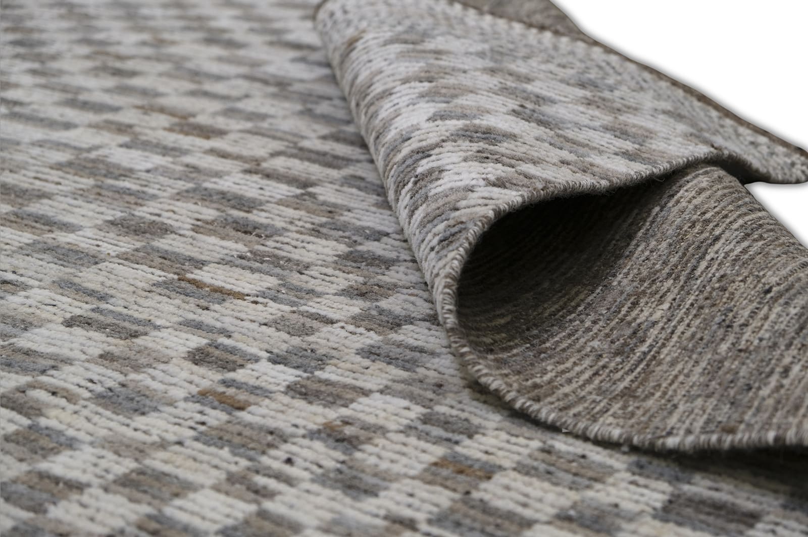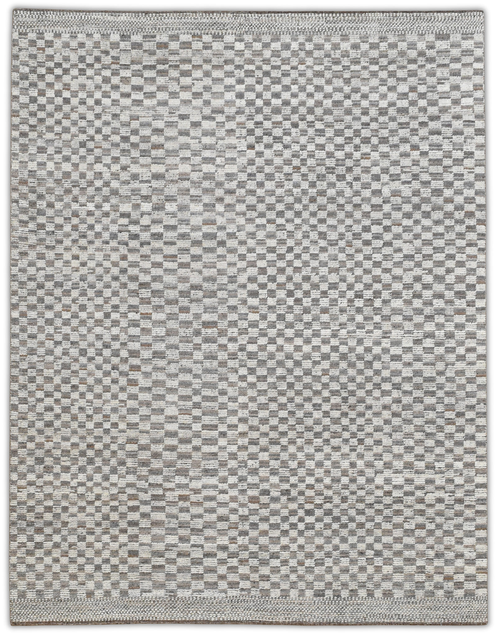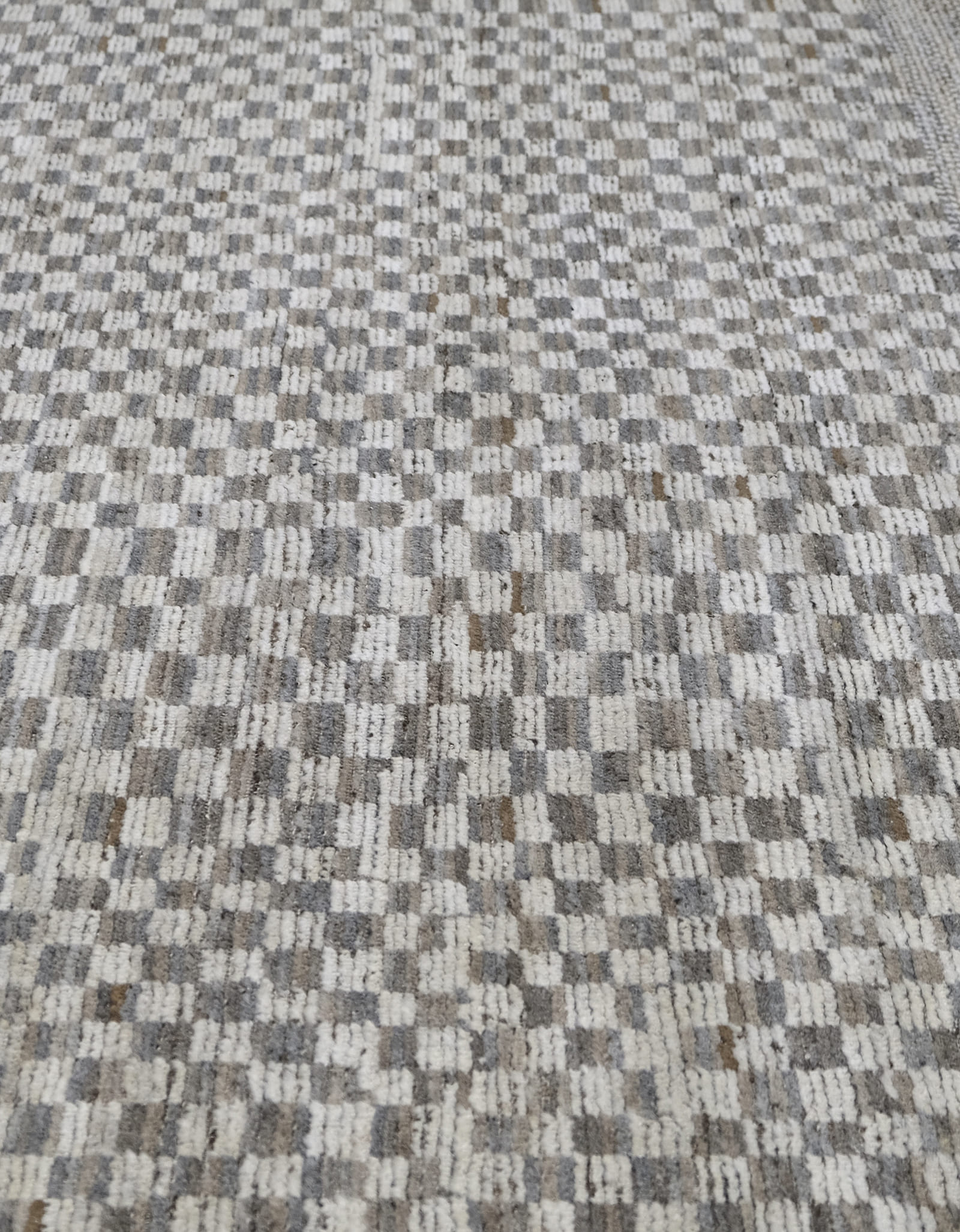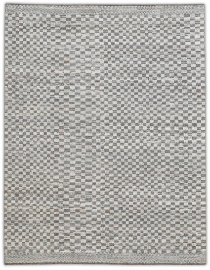A modern hand-knotted wool rug featuring a tonal checkerboard pattern in soft gray, cream, and taupe. Its clean geometry and neutral palette make it versatile for contemporary, minimalist, or transitional interiors. Durable hand-spun wool with a medium pile provides texture, warmth, and timeless appeal.